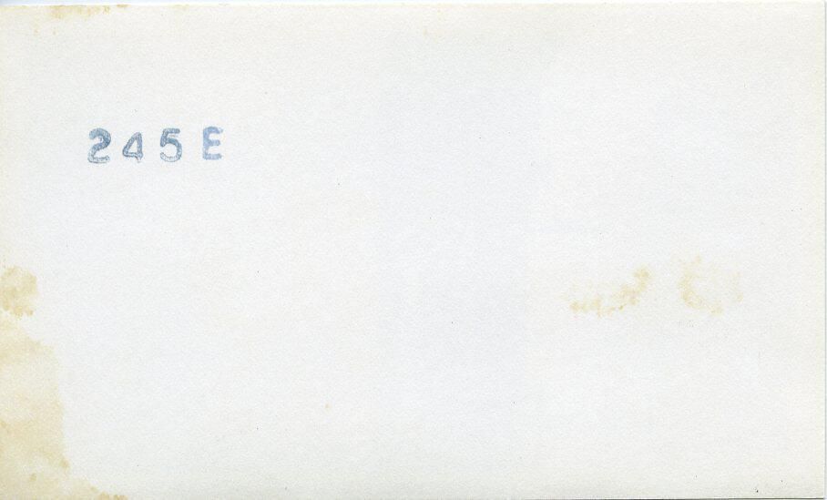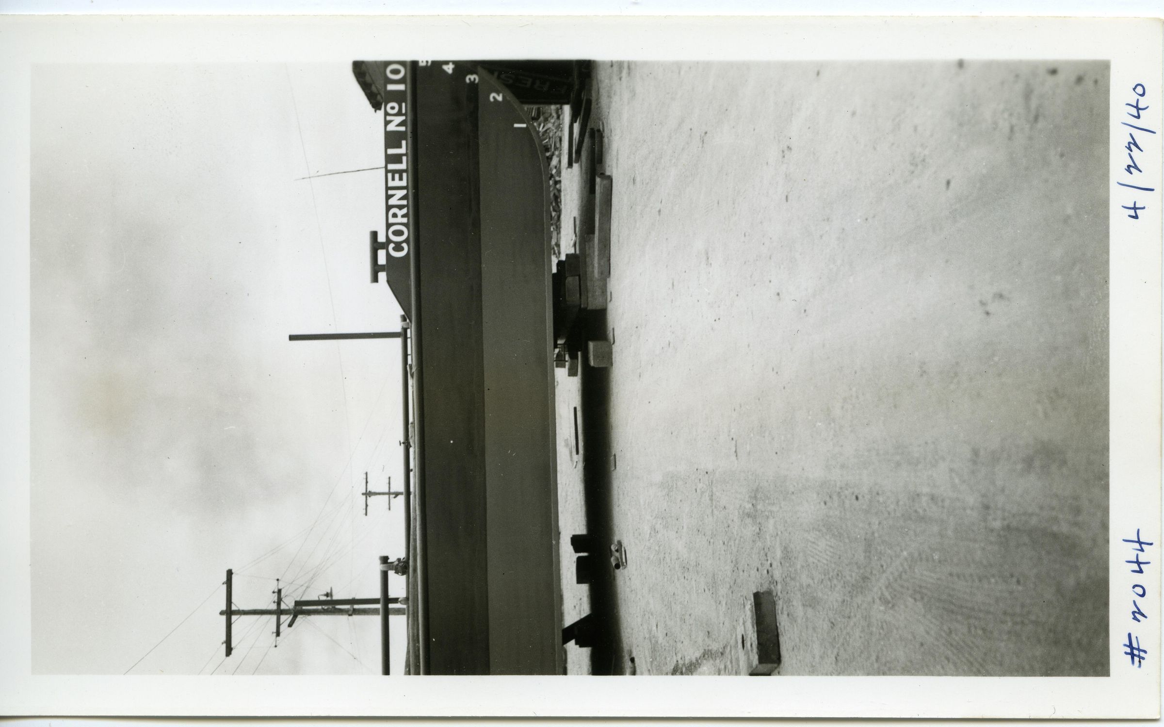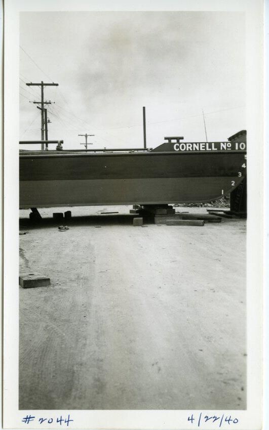 Black and white photo of a barge ready for launching. There is gravel in the foreground along with a wooden block. In the middle background is the side of a large barge. The barge has a dark hull except below the water line it is lighter. The numbers 1 trough 5 are painted on the stern, and at the top is "Cornell No. 10". Behind the barge are telephone poles. There is a white border on all sides, and in the bottom border is "#2044 4/22/40". On the back is "245E".