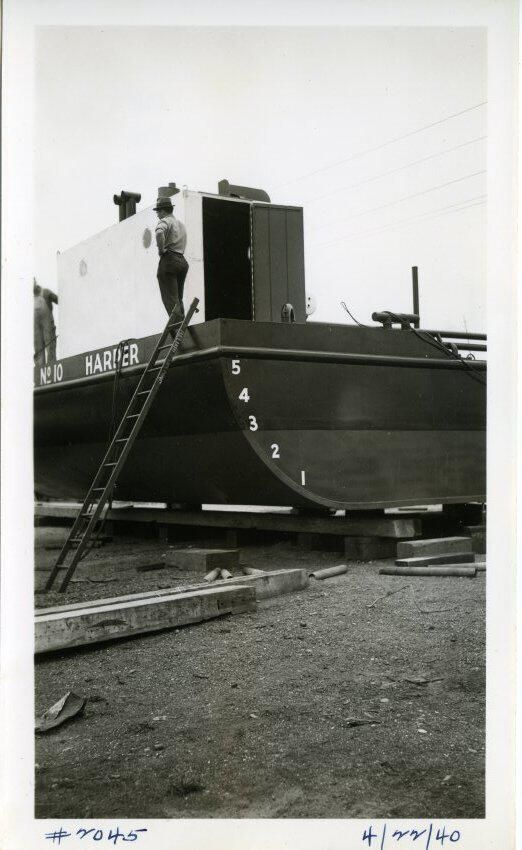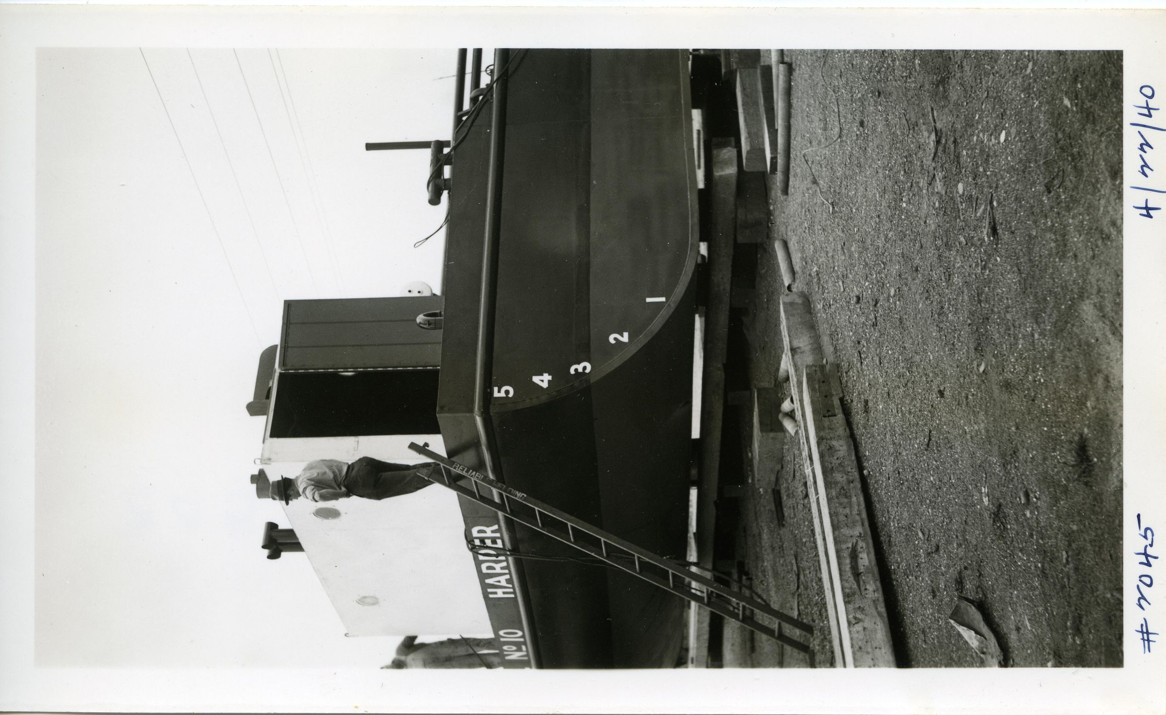 Black and white photo of a barge ready for launching. There is gravel in the foreground along with pieces of wood. In the middle background is the stern of a large barge. The barge has a dark hull except below the water line it is lighter. The numbers 1 trough 5 are painted on the stern, and on the side is "No. 10 Har?er". There is superstructure on the deck, and a man is standing there. There is a white border on all sides, and in the bottom border is "#2045 4/22/40". On the back is "245E".