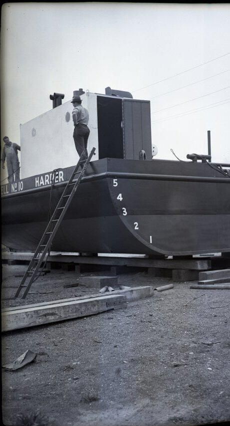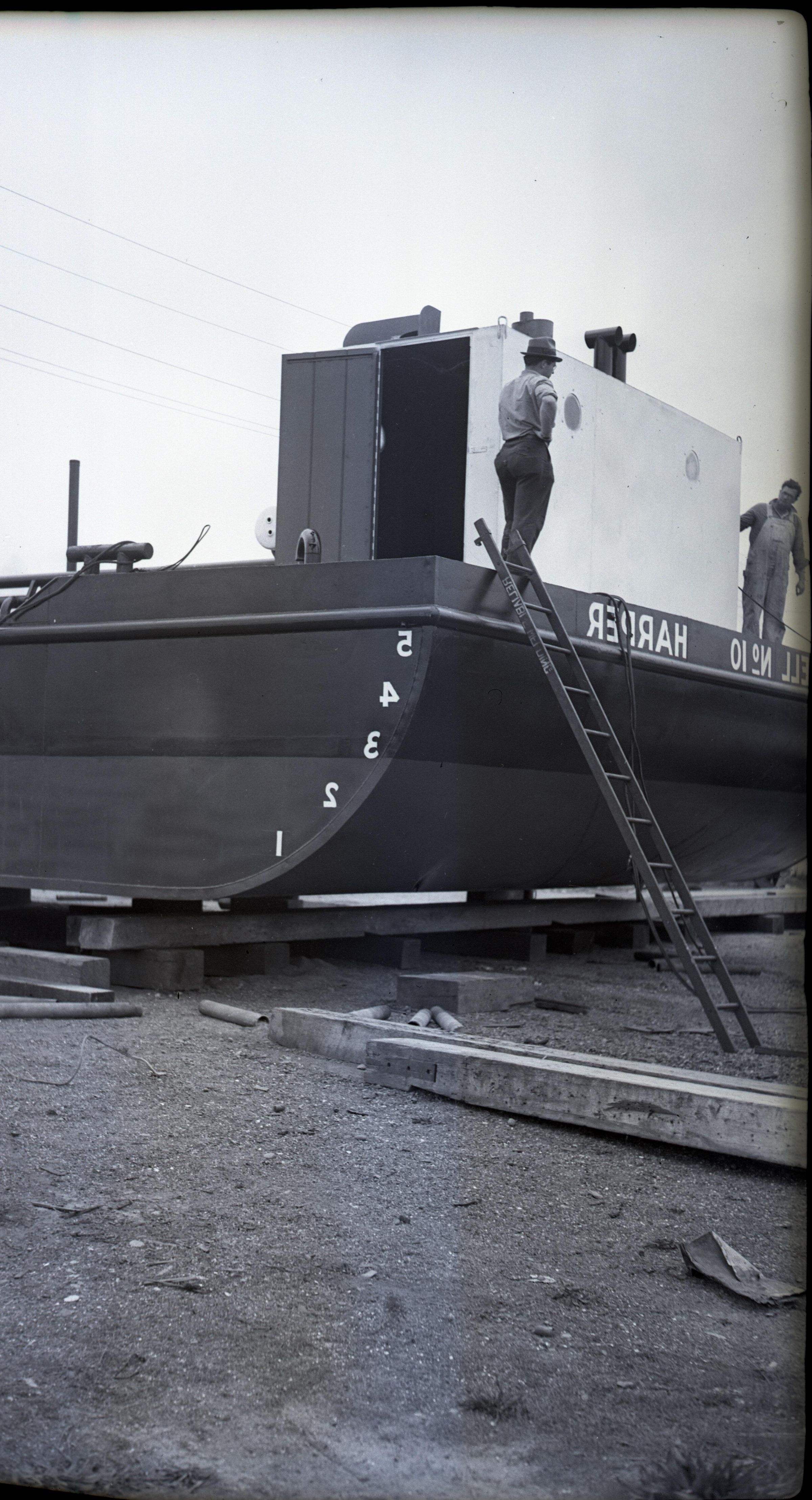 Black and white negative of a barge ready for launching. There is gravel in the foreground along with pieces of wood. In the middle background is the stern of a large barge. The barge has a dark hull except below the water line it is lighter. The numbers 1 trough 5 are painted on the stern, and on the side is "No. 10 Har?er". There is superstructure on the deck, and a man is standing there. There is a white border on all sides, and in the bottom border is "#2045 4/22/40".