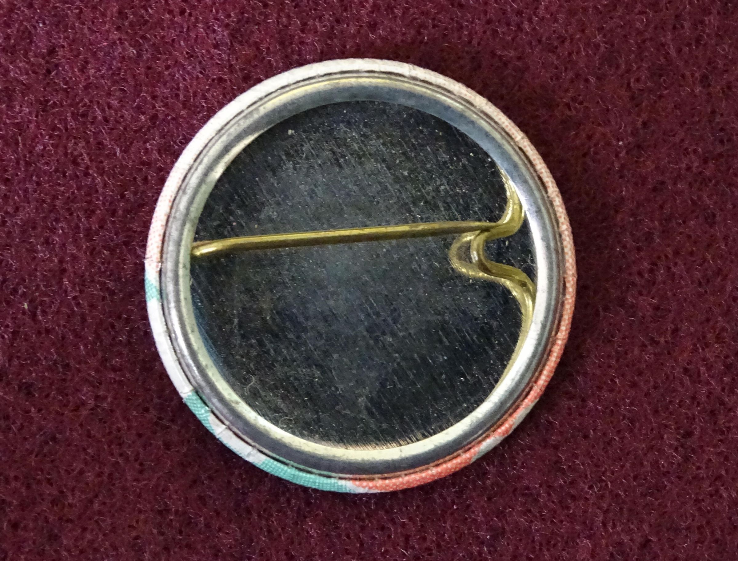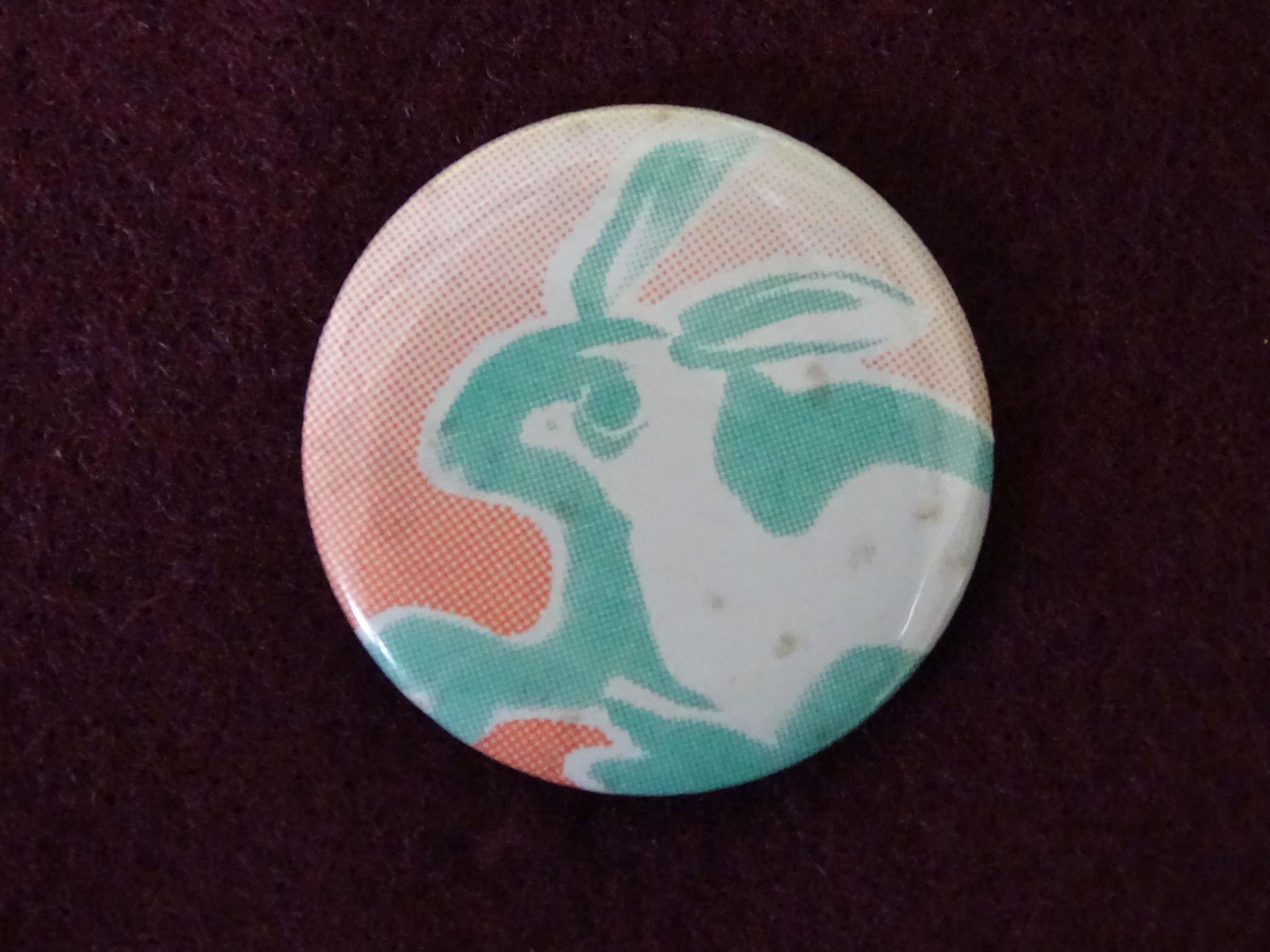 Metal button with a pin and clip on the back. The image on the front is a green and white rabbit on a coral-colored background.Made/Created