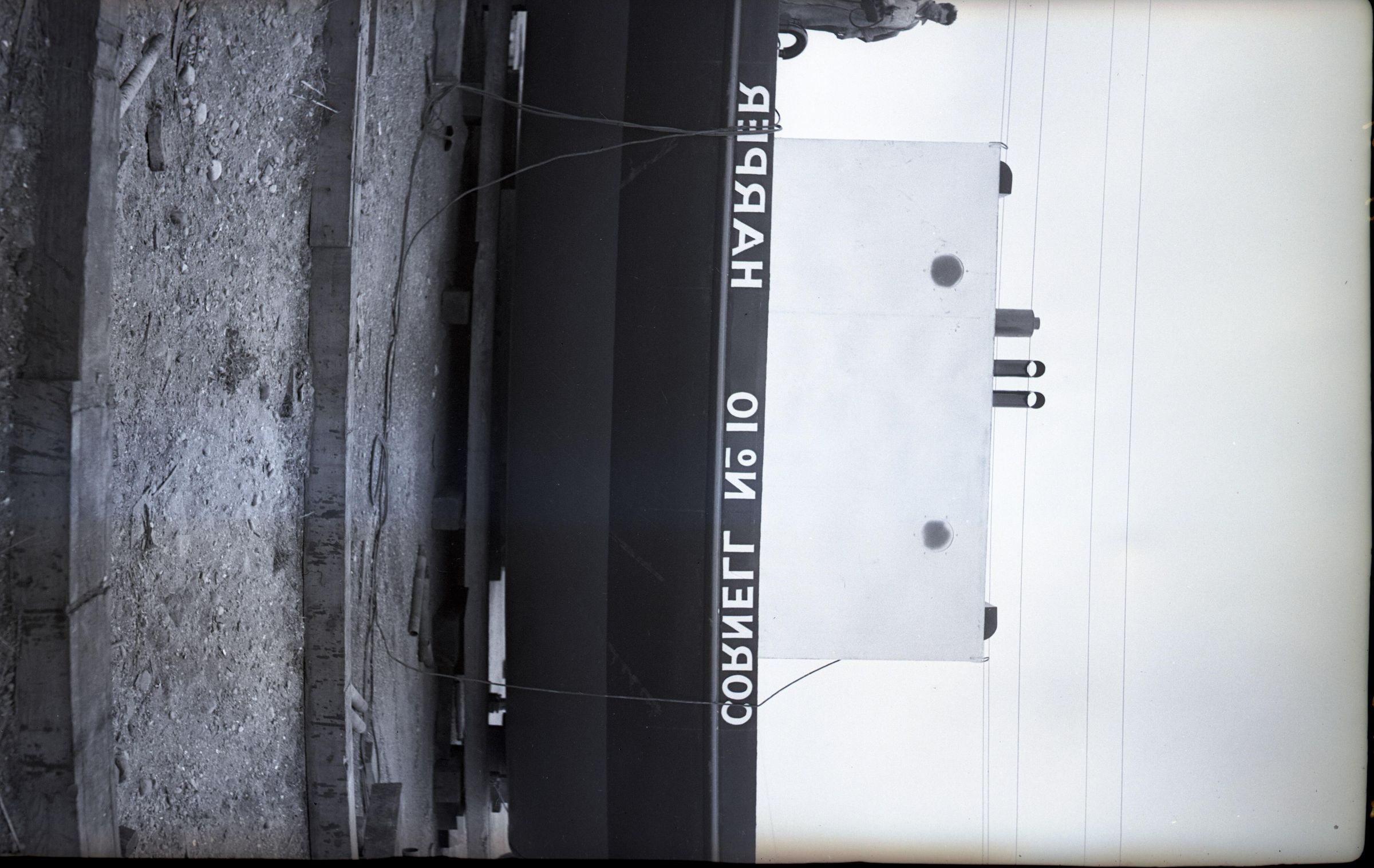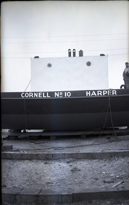 Black and white negative of a barge ready for launching. There is gravel in the foreground along with pieces of wood. In the middle background is the stern of a large barge. The barge has a dark hull except below the water line it is lighter. On the side is "Cornell No. 10 Harper". There is superstructure on the deck, and a man is standing there. There is a white border on all sides, and in the bottom border is "#2046 4/22/40".