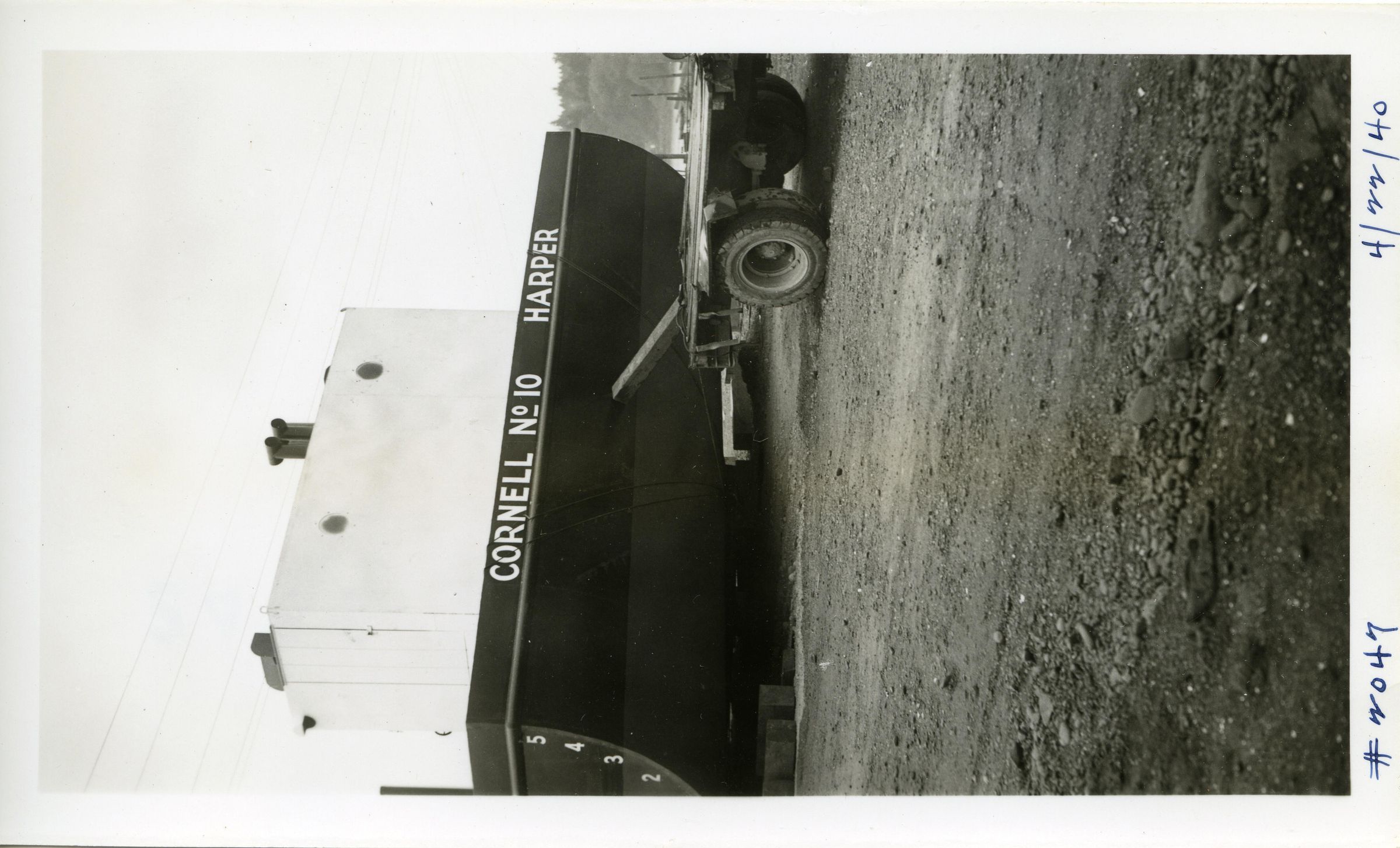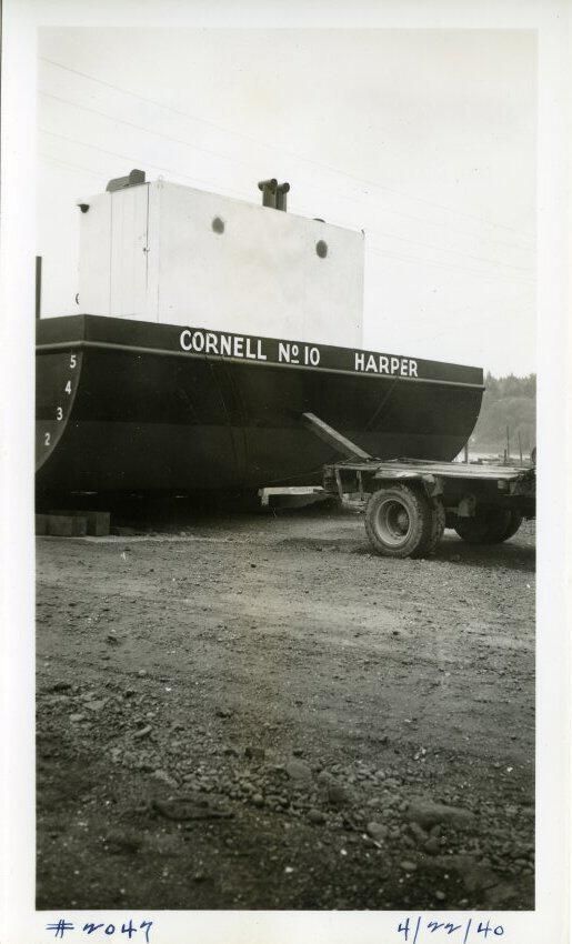 Black and white photo of a barge ready for launching. There is gravel in the foreground along with pieces of wood. In the middle background is the stern of a large barge and the back end of a truck. The barge has a dark hull except below the water line it is lighter. On the side is "Cornell No. 10 Harper". There is superstructure on the deck. There is a white border on all sides, and in the bottom border is "#2047 4/22/40". On the back is "245E".