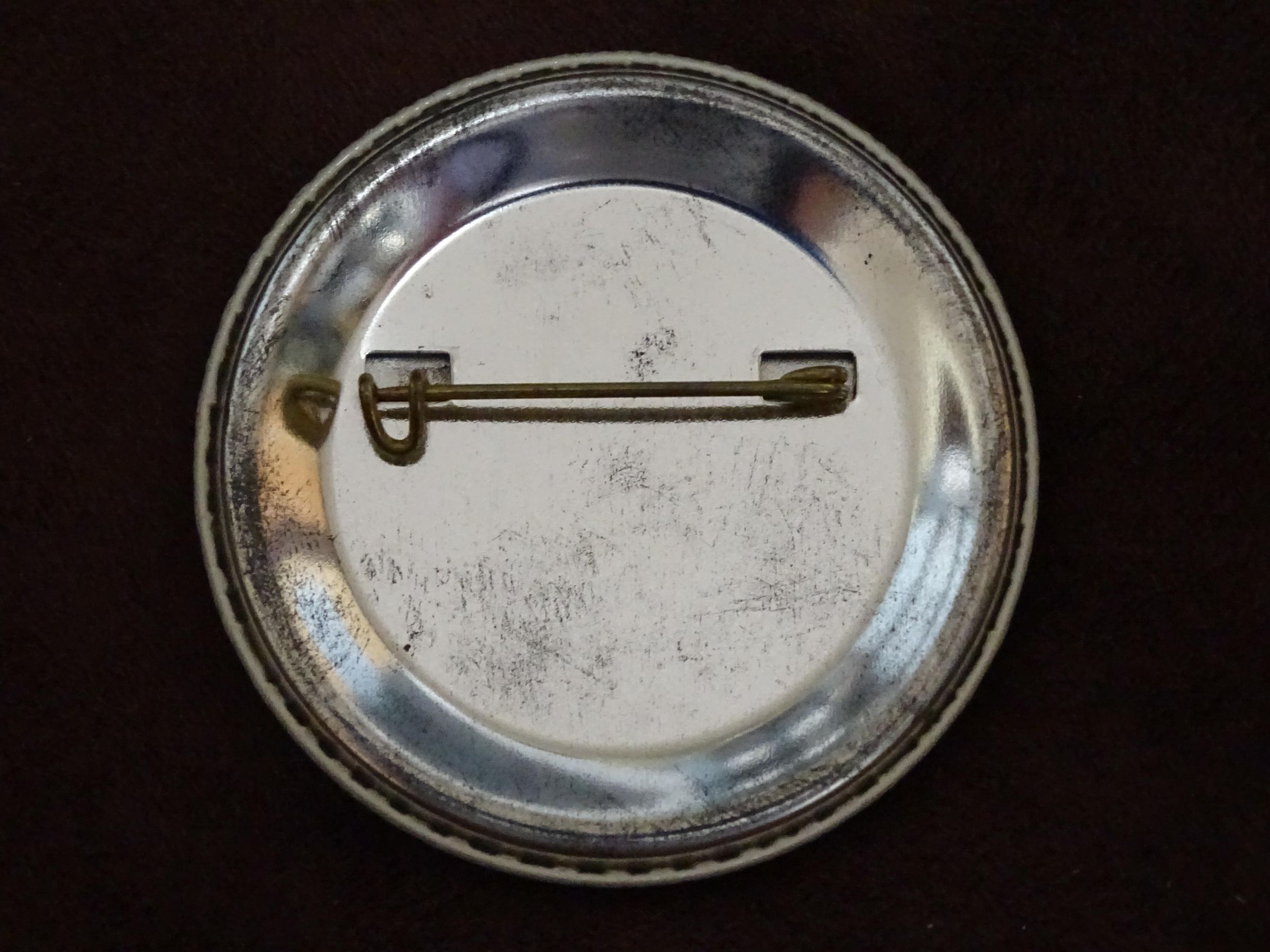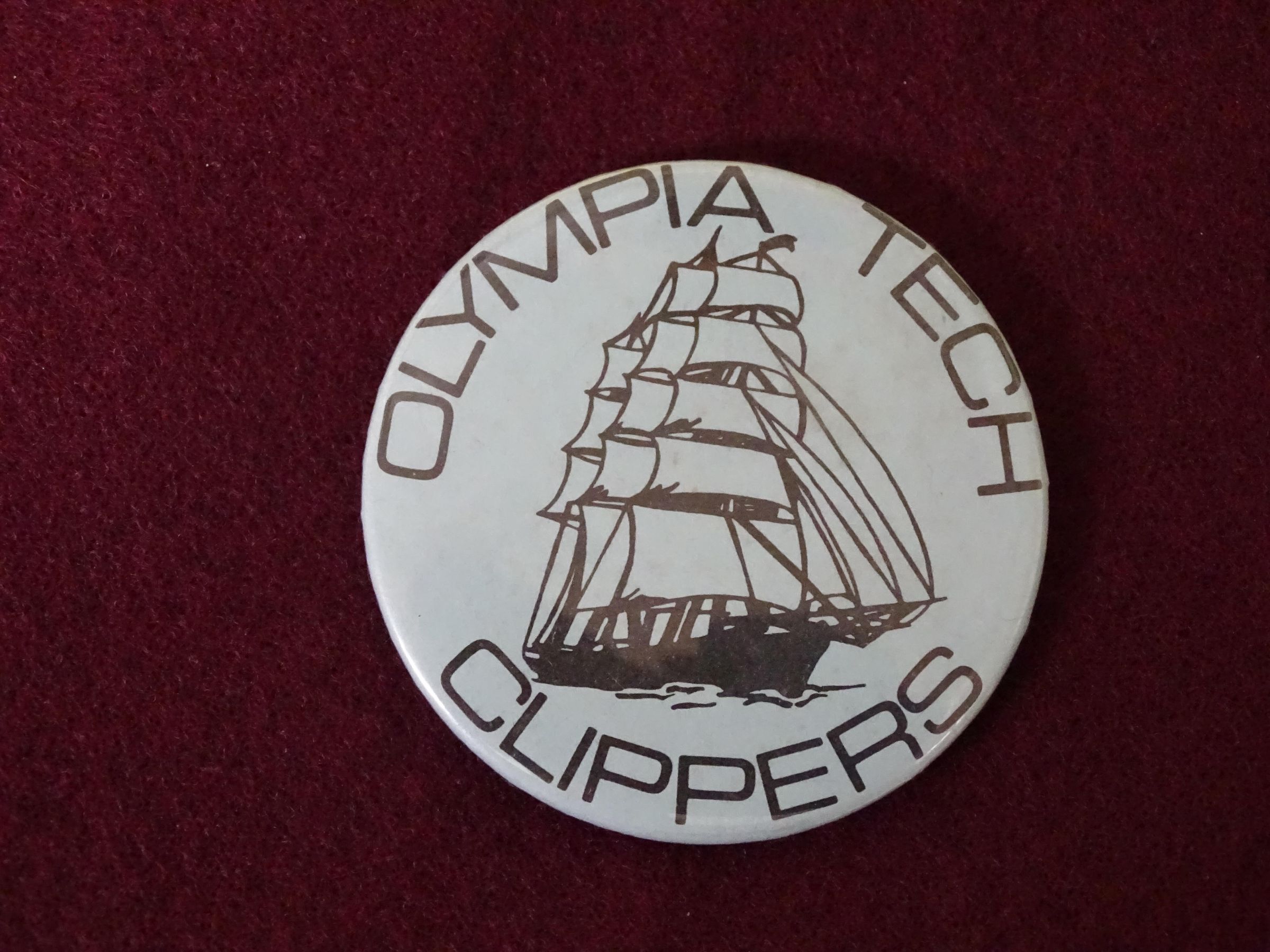 Metal button with pin and clip on the back. The front of the button is light blue with an image of a clipper ship and the words "Olympia Tech Clippers". On the back is stamped (faintly) "Badge A Minit, Lasalle, ILL 61301".Context