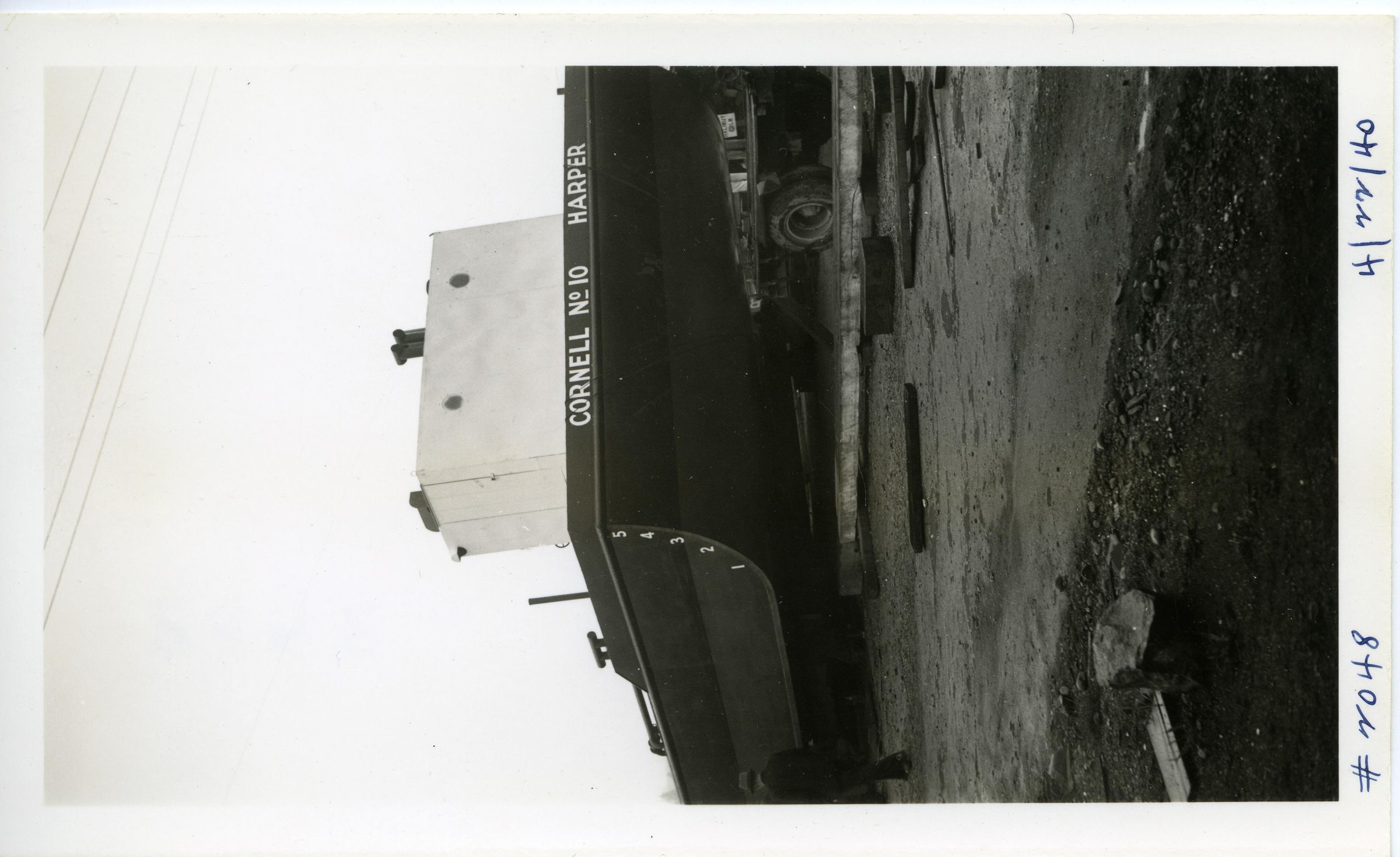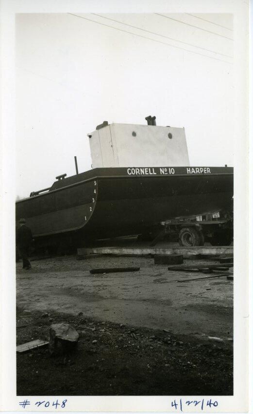 Black and white photo of a barge ready for launching. There is gravel in the foreground along with pieces of wood. In the middle background is the stern of a large barge and the back end of a truck. The barge has a dark hull except below the water line it is lighter. On the side is "Cornell No. 10 Harper". There is superstructure on the deck. There is a white border on all sides, and in the bottom border is "#2048 4/22/40". On the back is "245E".