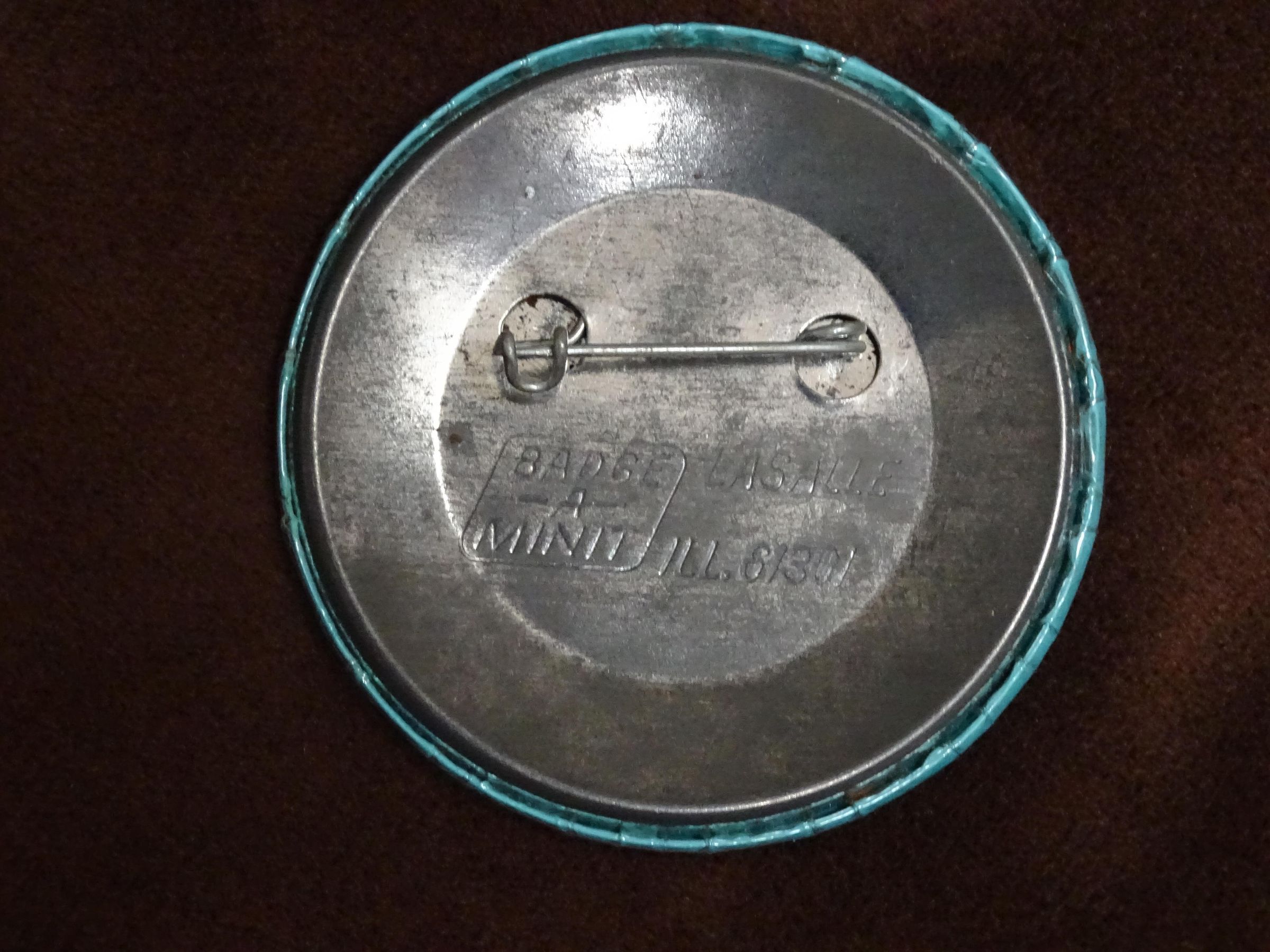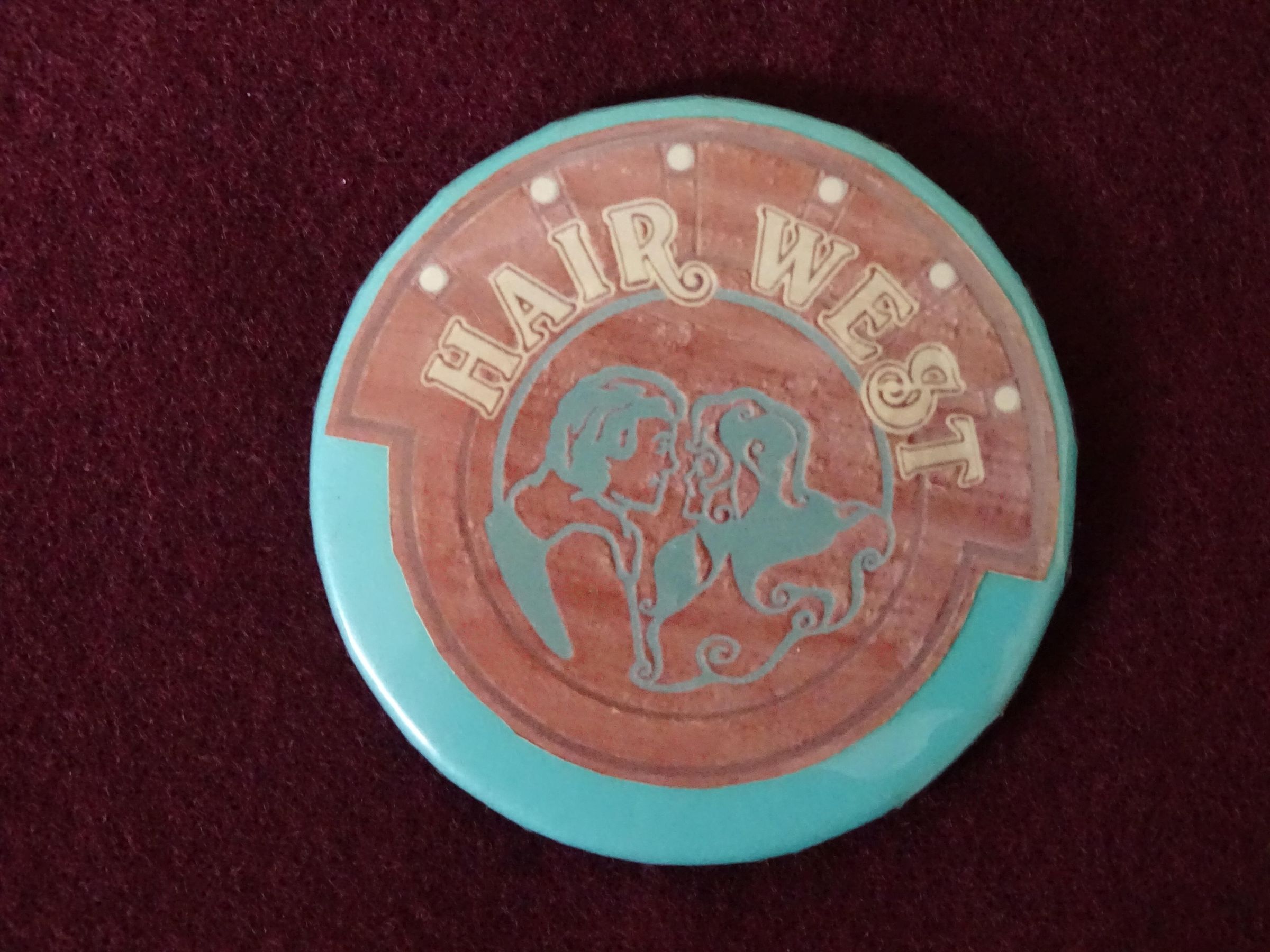 Metal button with a pin and clip on the back. In brown and turquoise is a silhouette of a couple and the words (in yellow) "Hair West". On the back is stamped "Badge A Minit, LaSalle, ILL 61303".Made/Created