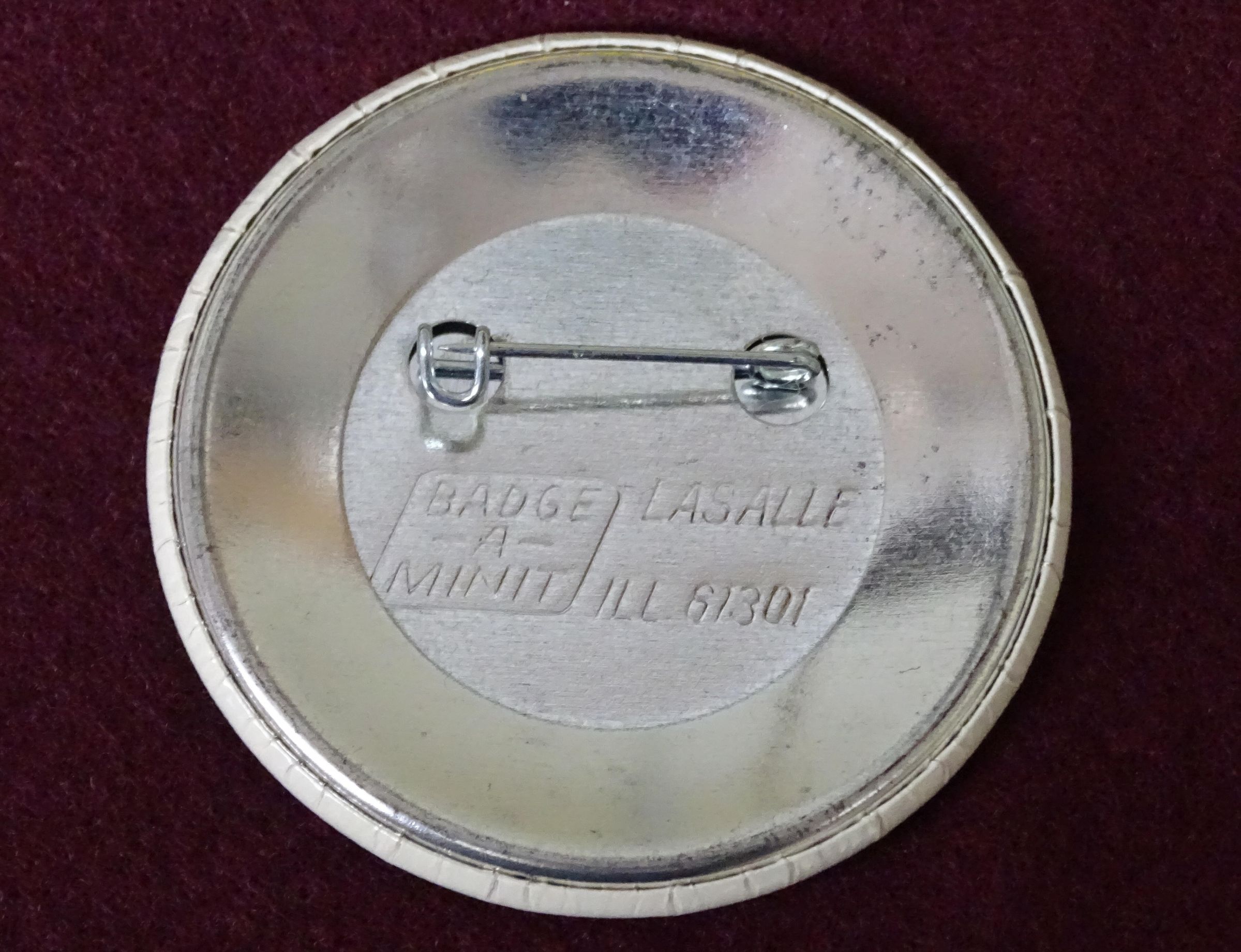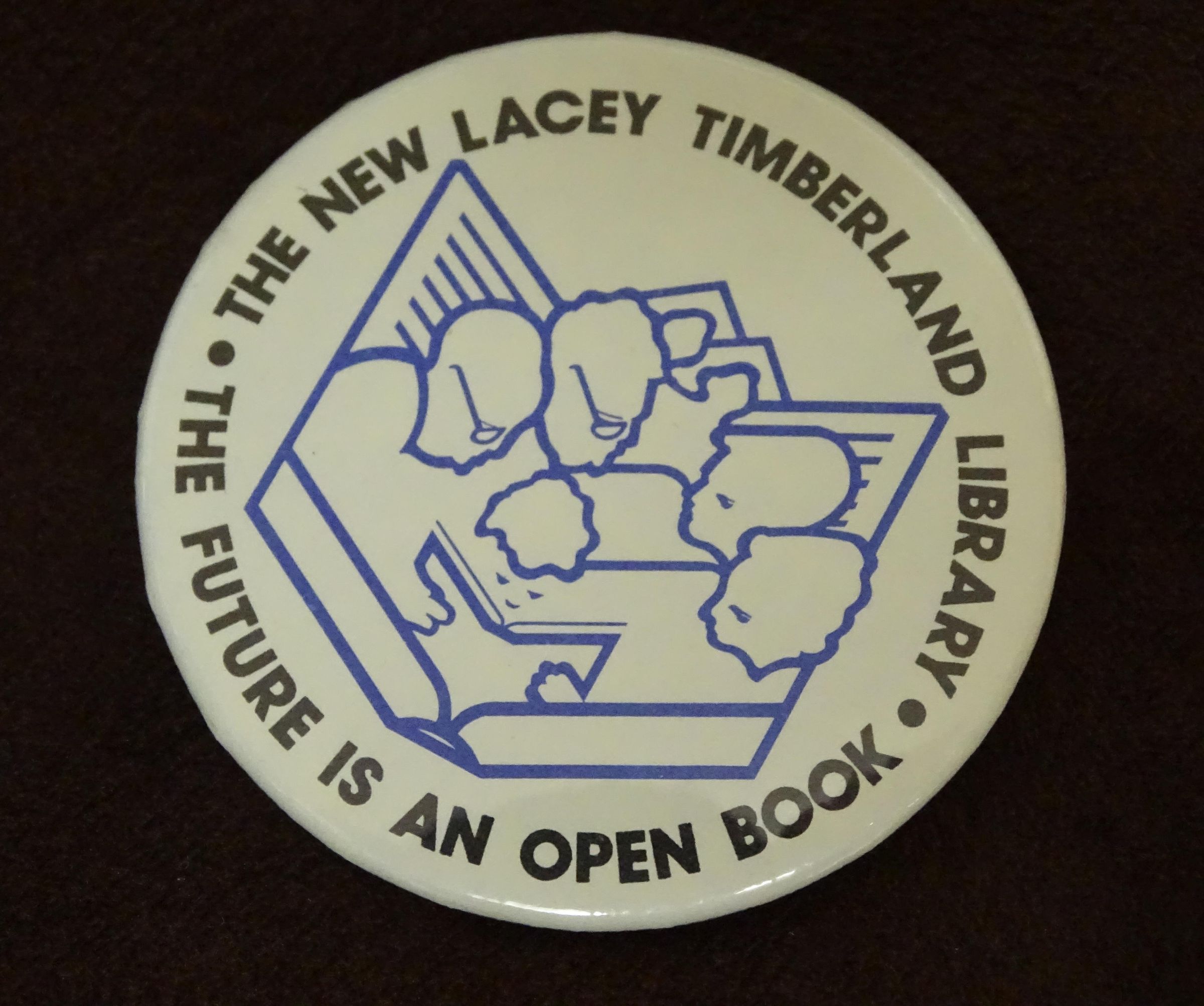 Metal button with a pin and clip on the back. The button is white with an image printed in blue of people's heads against on open book. Around the outside of the front are the words "The new Lacey Timberland Library, The future is an open book". Stamped on the back are the words "Badge A Minit, LaSalle, ILL 61303".Made/Created