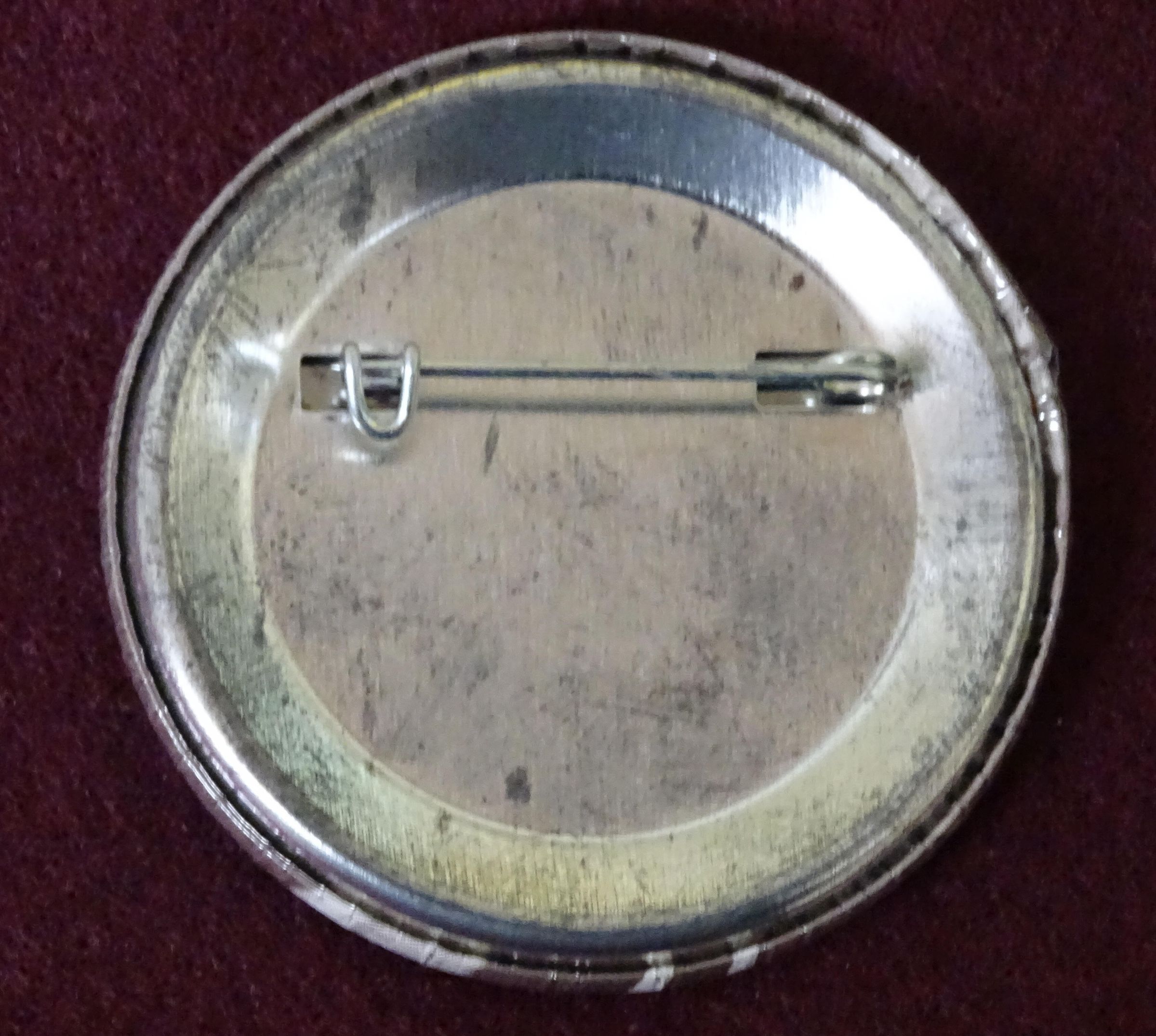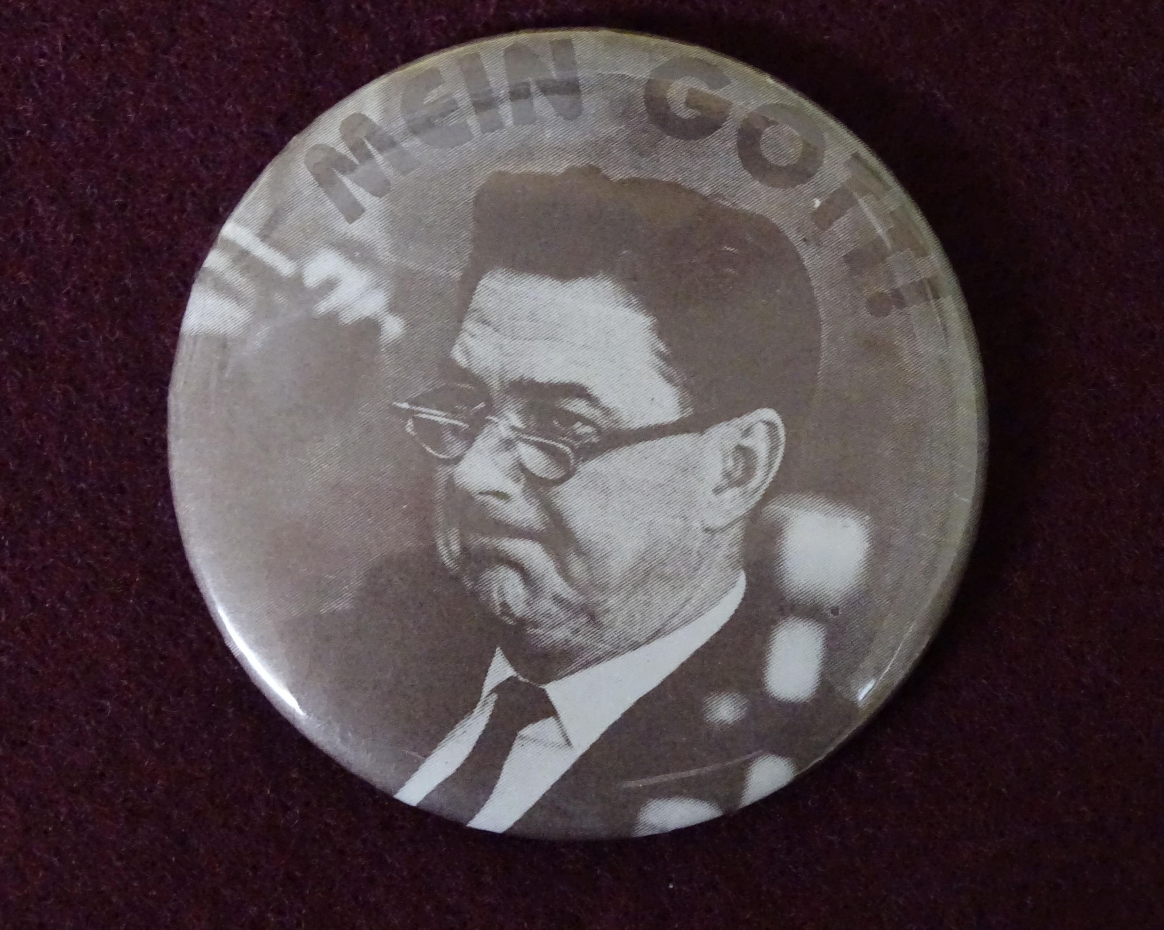Metal button with a pin and clip on the back. The button is mostly brown with a photo of a man and the words "Mein Gott". This refers to former North Thurston School District Superintendent John Gott.Relationships