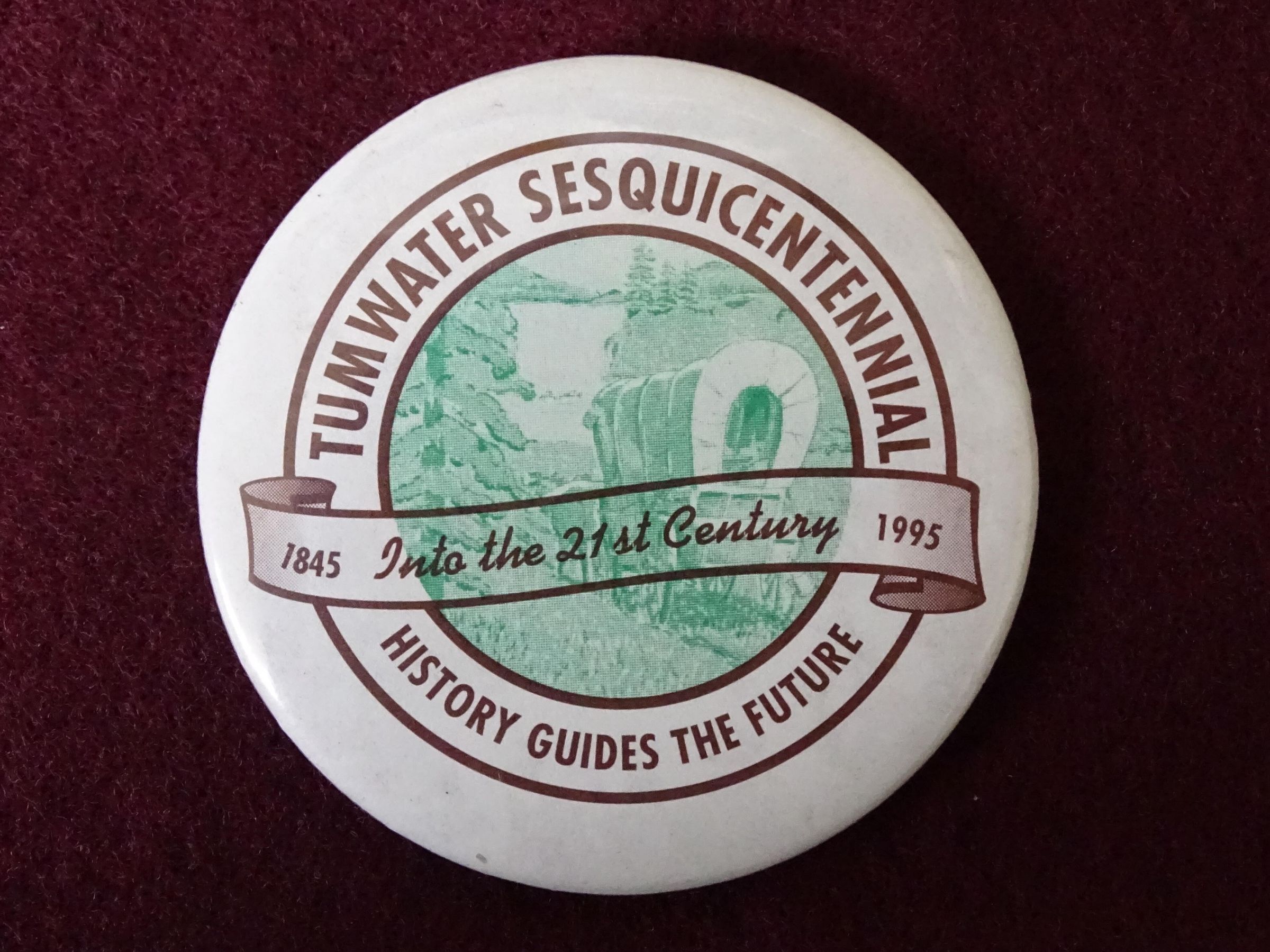 White metal button with red printing and green image. Printed are the words "Tumwater Sesquicentennial, History Guides the Future, 1845 Into the 21st Century 1995". The image is of a covered wagon and trees and water.Relationships