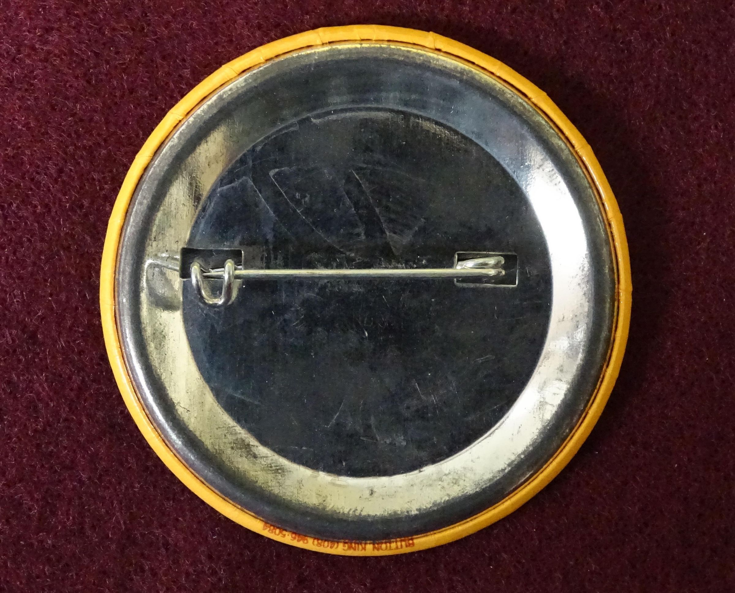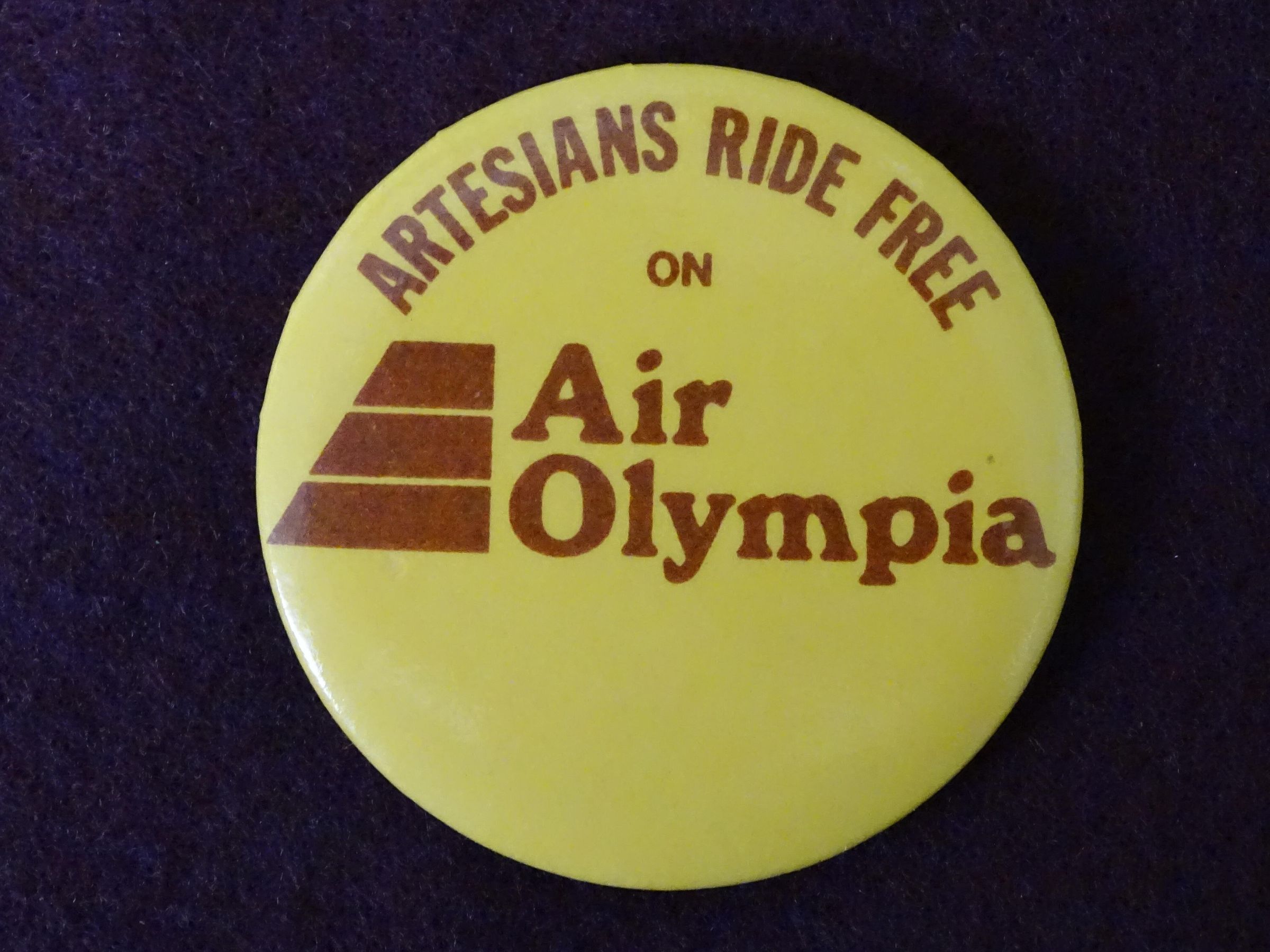 Metal button, orange in color with red printing: "Artesians Ride Free on Air Olympia." To the left of "Air Olympia" are three stacked tapered squares that give the impression of an airplane tail, probably the Air Olympia logo.Context