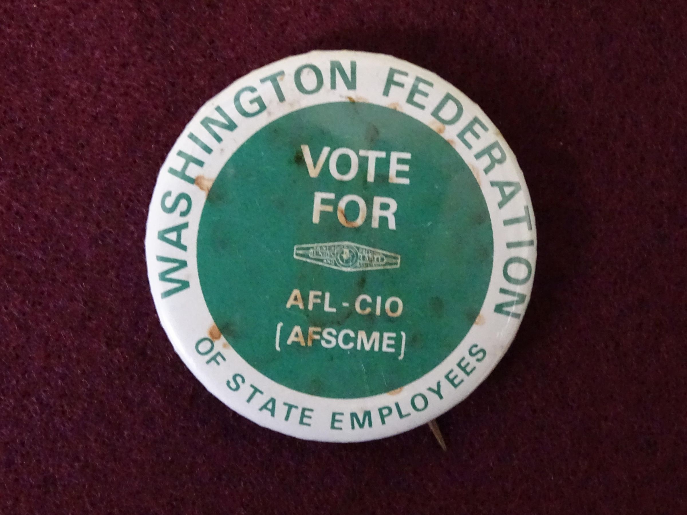Metal button in green and white. Around the edge are the words "Washington Federation of State Employees" and in the center is "Vote for AFL-CIO [AFSCME]" There is also a union logo that is too small to read.Relationships