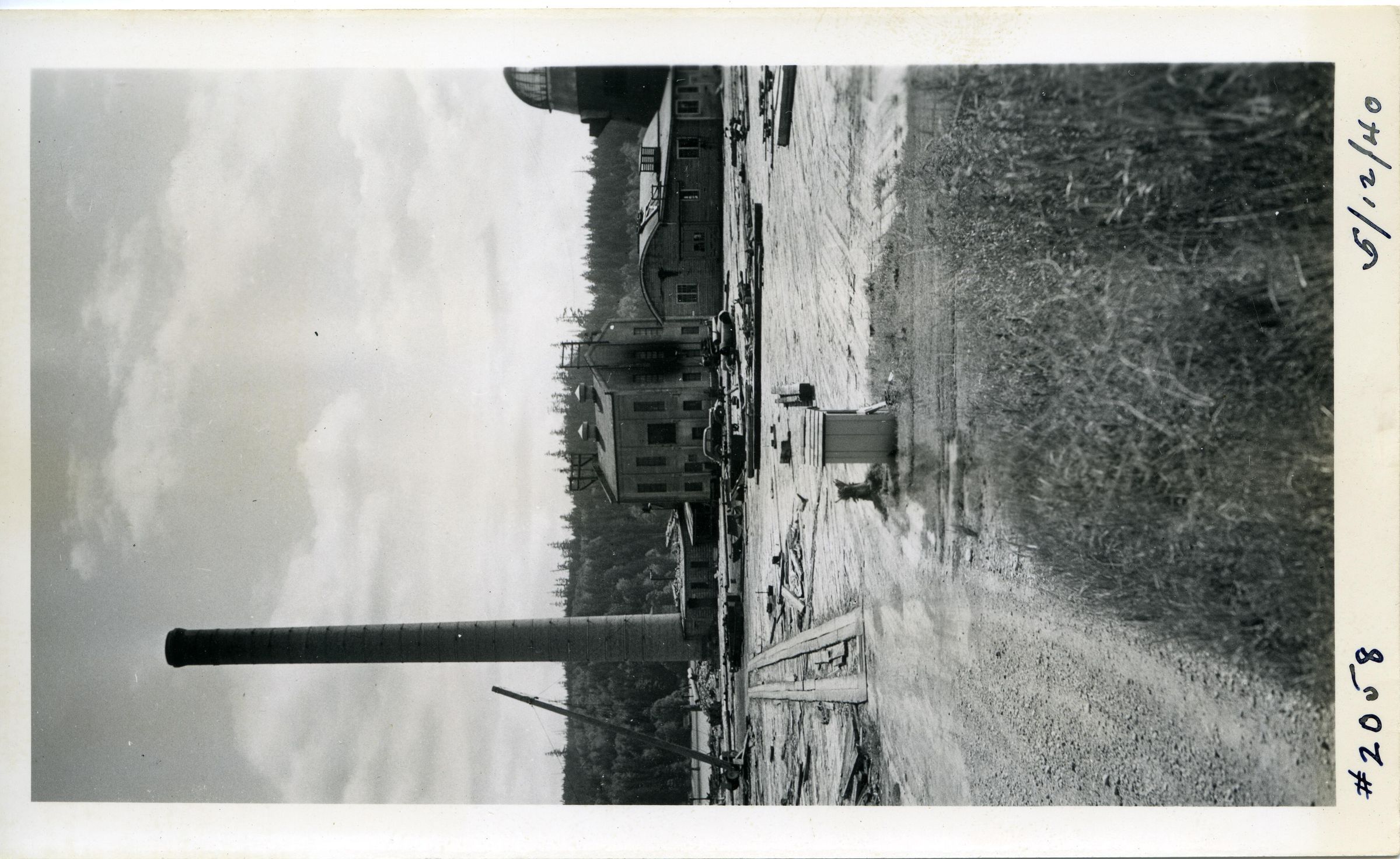 Black and white photo of the remains of the Pope & Talbot Mill. There is grass and gravel in the foreground, and in the middle background is a concrete pad covered with debris. There is also a smokestack and a building. In the far background is a hill with trees. There is a white border on all sides, and in the bottom border is "#2058 5/12/40". On the back is "472E".