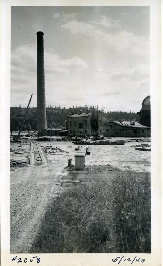 The photo is inserted, along with a negative of the image, into a cream colored envelope that has typed "5/12/40 -- Port Ludlow Remains of Pope & Talbot mill". Stamped is "2058" and "indexed".Made/Created