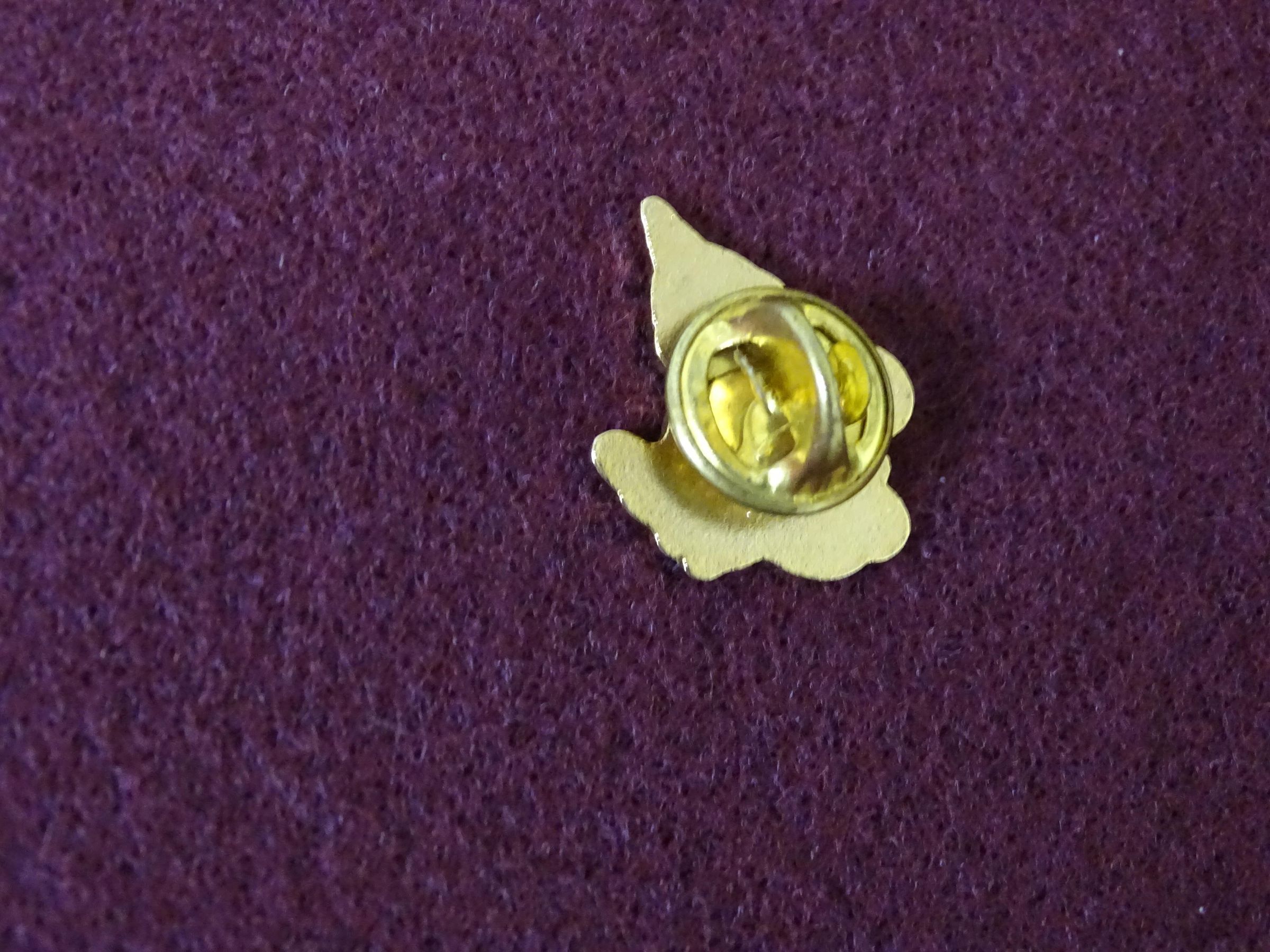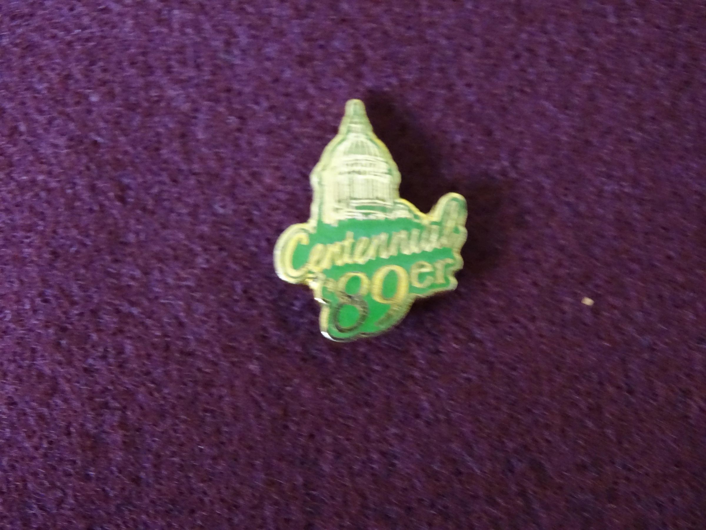 Gold colored metal lapel pin in the shape of the Capitol dome. In gold letters on a green background are the words "Centennial '89er" A metal clasp on the back fits on a pointed prong.Dimensions