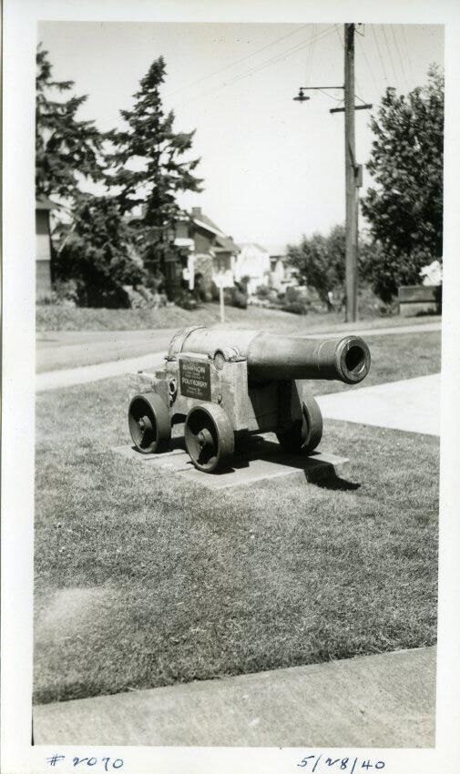 The photo is inserted, along with a negative of the image, into a cream colored envelope that has typed "5/28/40 -- Tacoma Cannon (from old Russian gunboat) at State Historical Society Building- -three quarter front view". Stamped is "2070" and "indexed".Made/Created