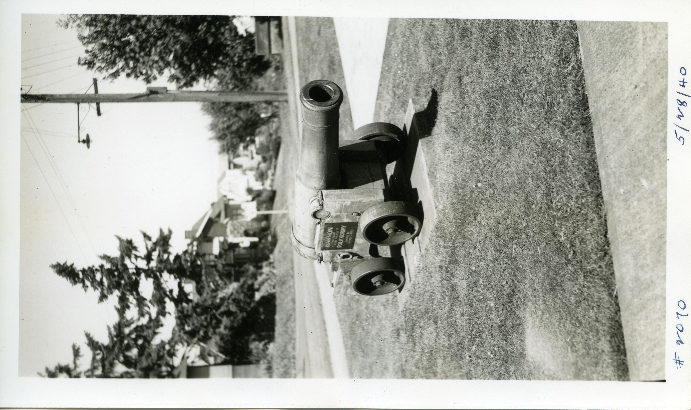 Black and white photo of a Russian cannon. In the foreground is part of a sidewalk and grass. The cannon is on a concrete pad, and has a four-wheeled carriage and a long barrel. There is a plaque on the side, but is not readable. In the background is a telephone pole, a house, and trees. There is a white border on all sides, and in the bottom border is "#2070 5/28/40". On the back is "008R".