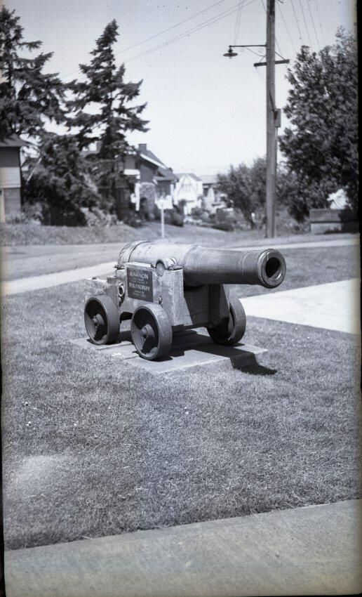 The negative is inserted, along with a print of the image, into a cream colored envelope that has typed "5/28/40 -- Tacoma Cannon (from old Russian gunboat) at State Historical Society Building- -three quarter front view". Stamped is "2070" and "indexed".Made/Created