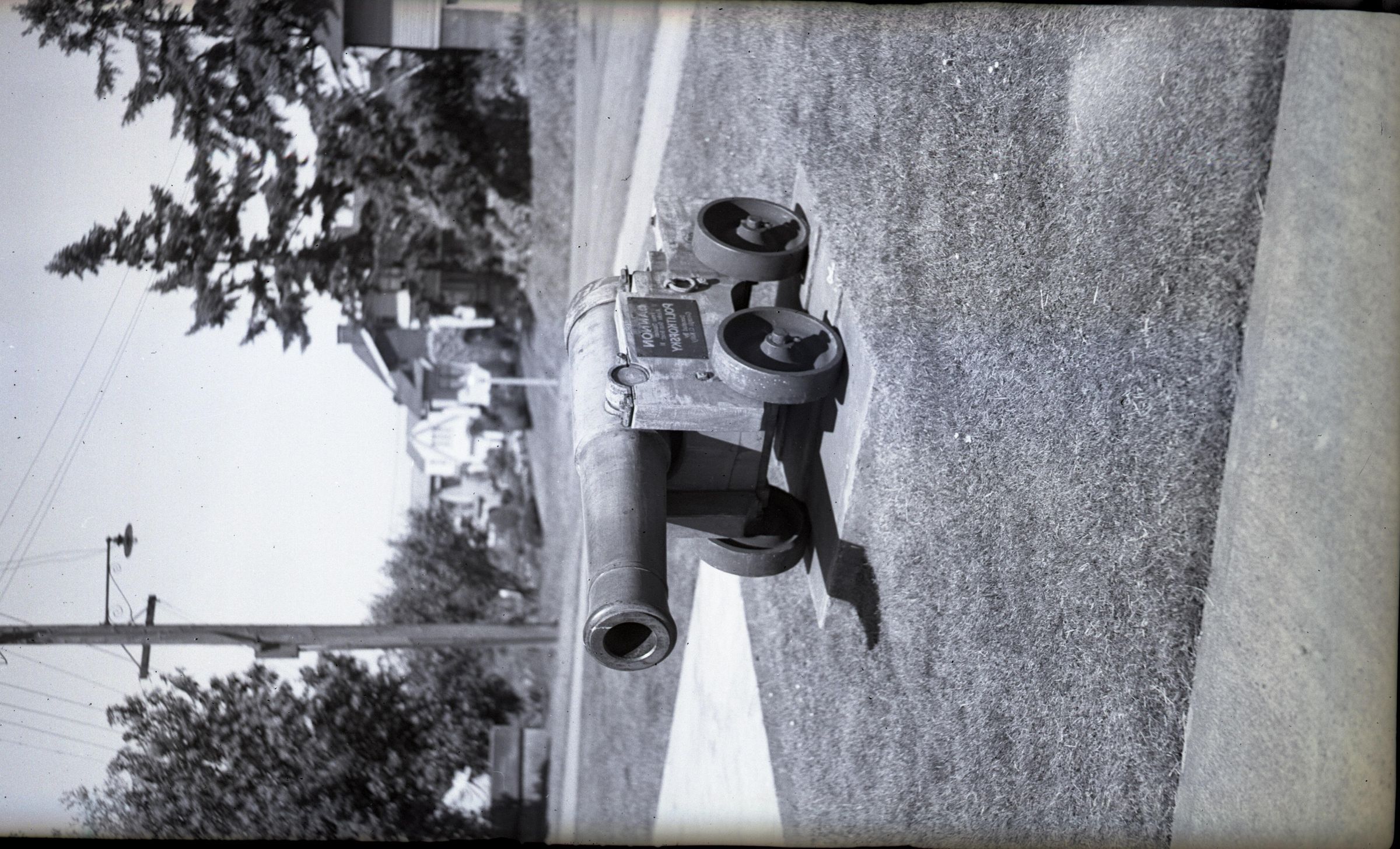 Black and white negative of a Russian cannon. In the foreground is part of a sidewalk and grass. The cannon is on a concrete pad, and has a four-wheeled carriage and a long barrel. There is a plaque on the side, but is not readable. In the background is a telephone pole, a house, and trees. There is a white border on all sides, and in the bottom border is "#2070 5/28/40".