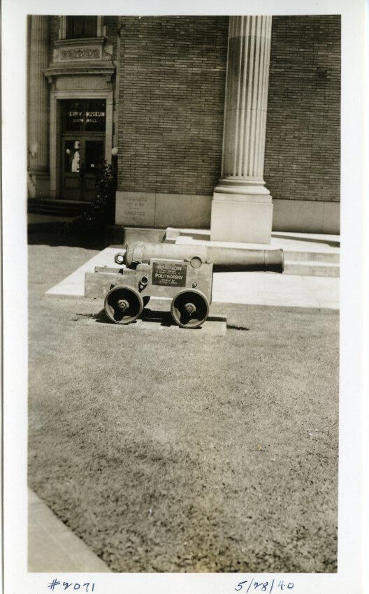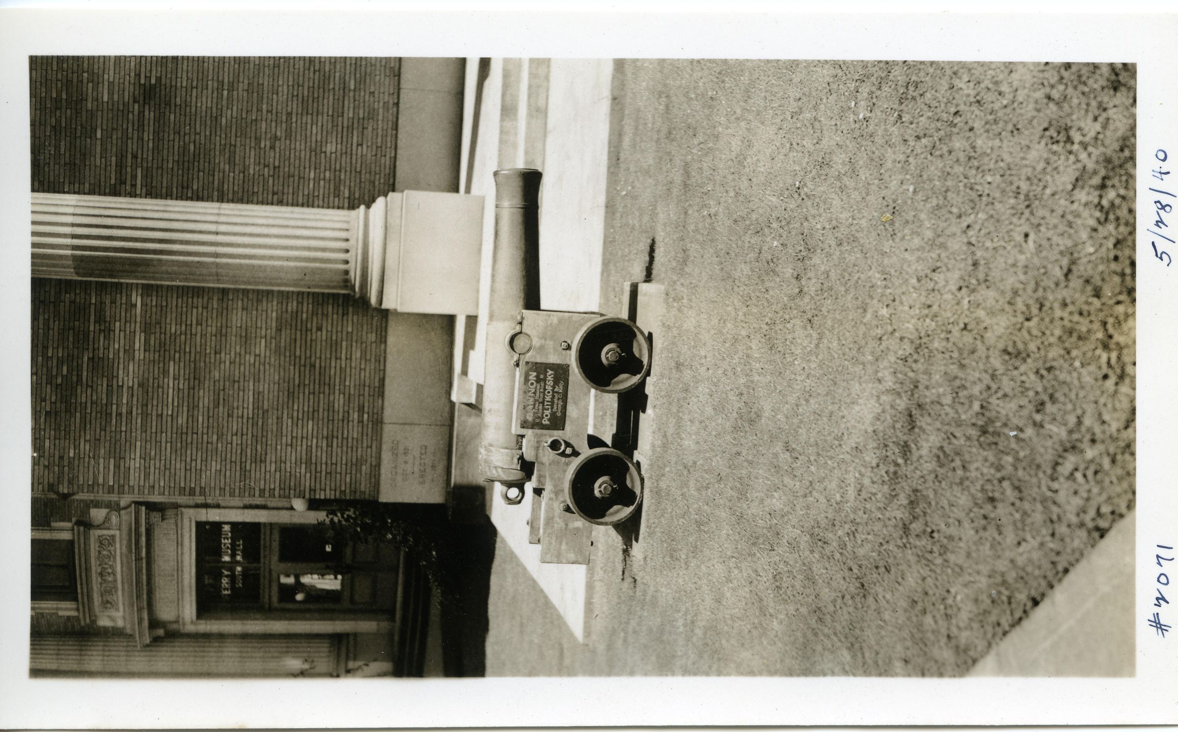The photo is inserted, along with a negative of the image, into a cream colored envelope that has typed "5/28/40 -- Tacoma Cannon (from old Russian gunboat) at State Historical Society Building- -side view". Stamped is "2071" and "indexed".Made/Created