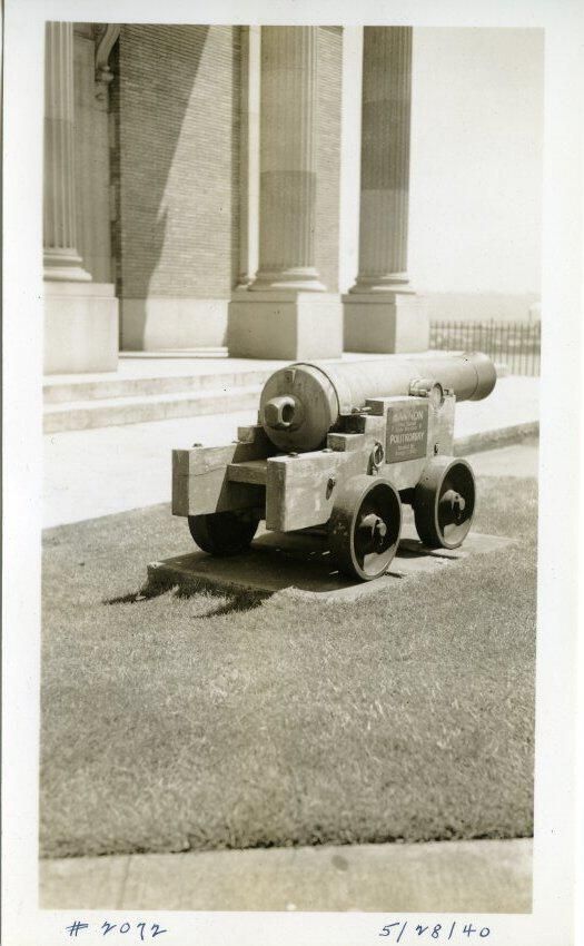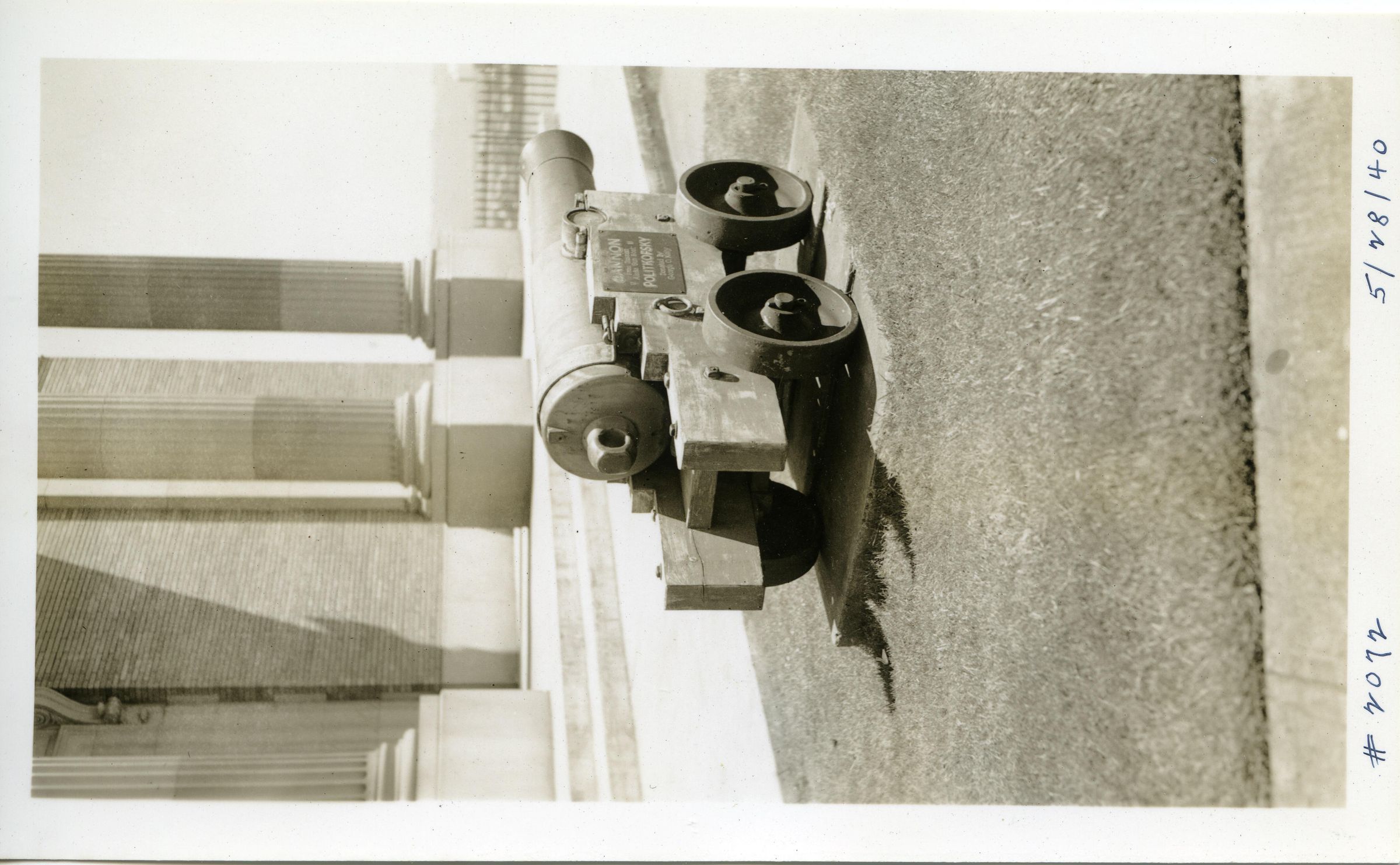 The photo is inserted, along with a negative of the image, into a cream colored envelope that has typed "5/28/40 -- Tacoma Cannon (from old Russian gunboat) at State Historical Society Building- -Tree quarter rear view". Stamped is "2072" and "indexed".Made/Created