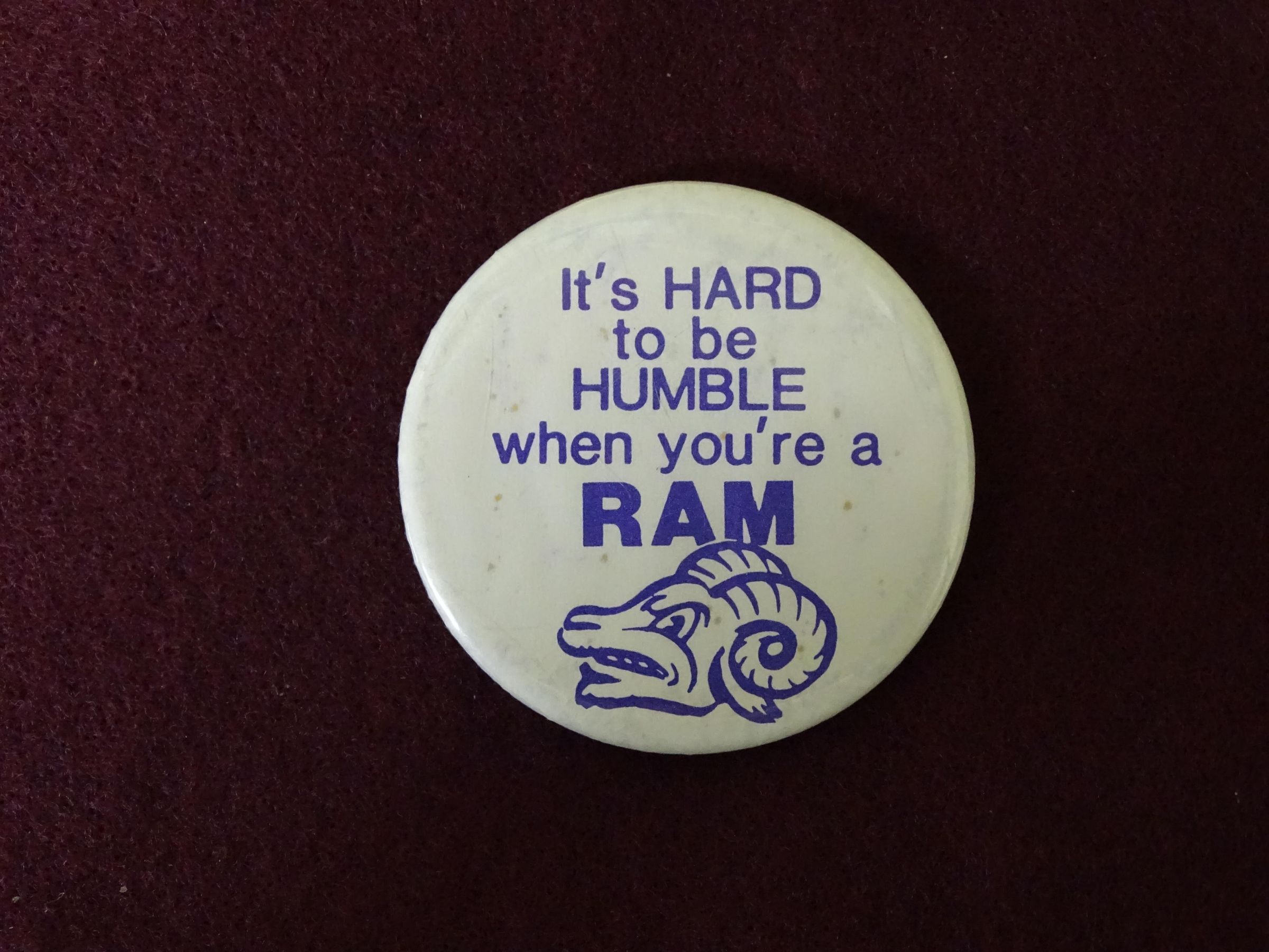 White colored metal button with purple ink. On the front is a drawing of a ram's head and the words "It's hard to be Humble when you're a RAM".Relationships