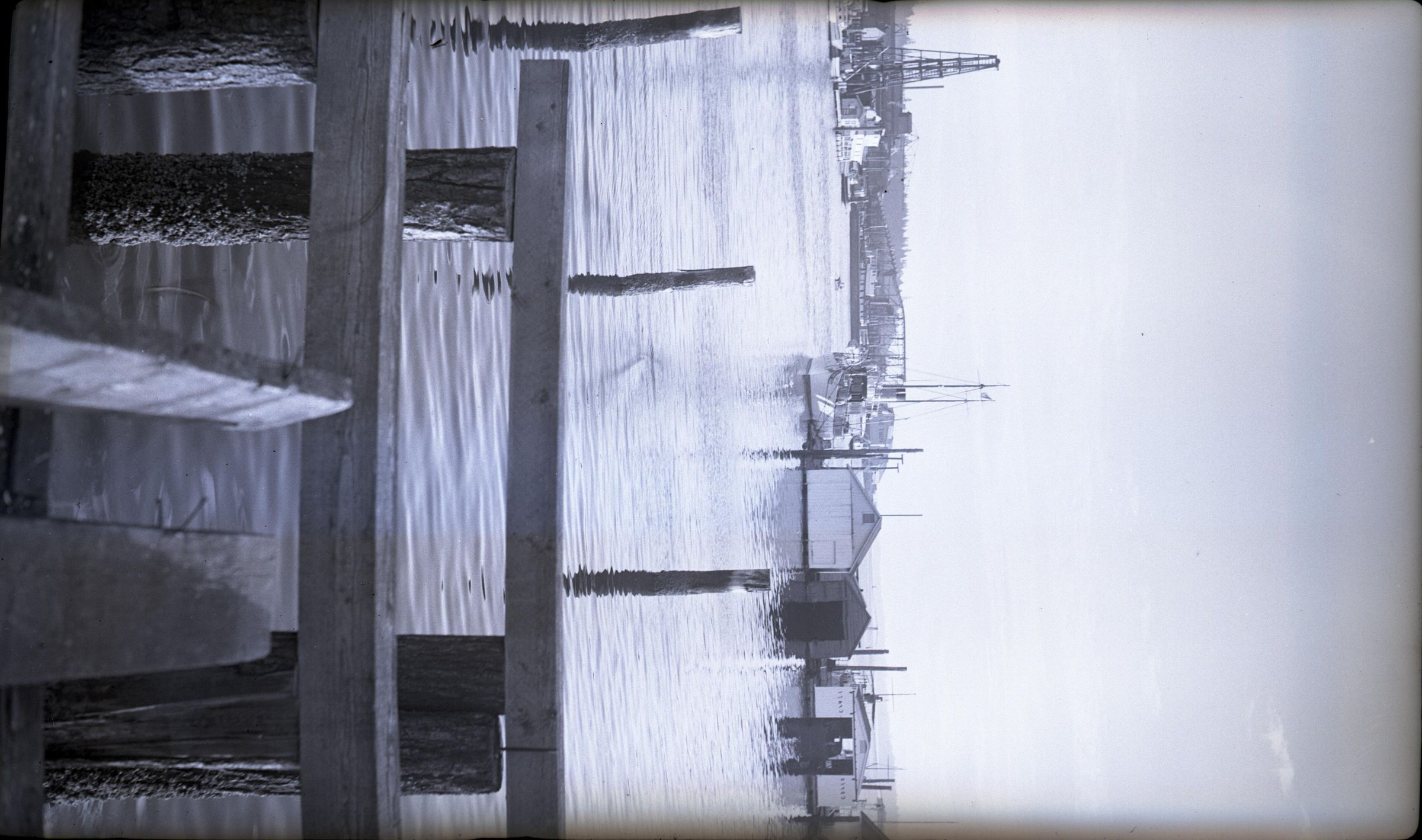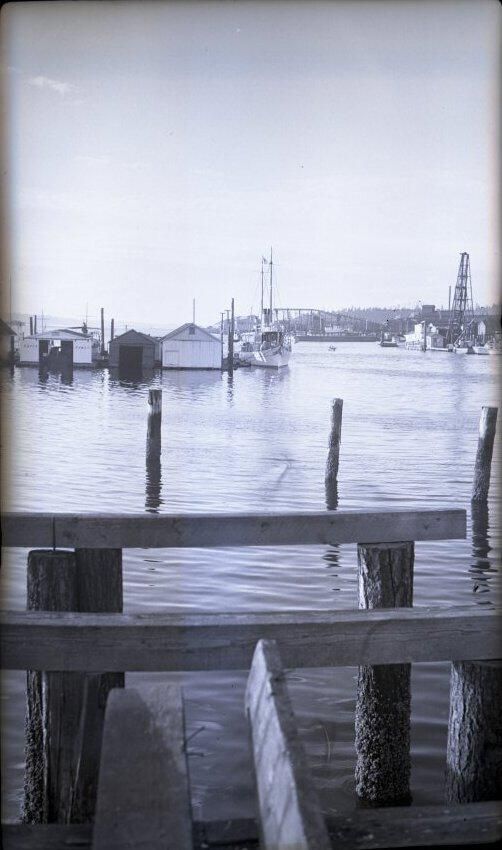 Black and white negative of a yacht in Olympia., In the foreground are pilings and cross beams. Beyond that is water, and then some boat houses and the end view of the yacht. In the background are more structures and the far shore. There is a white border on all sides, and in the bottom border is "#2103 7/10/40".