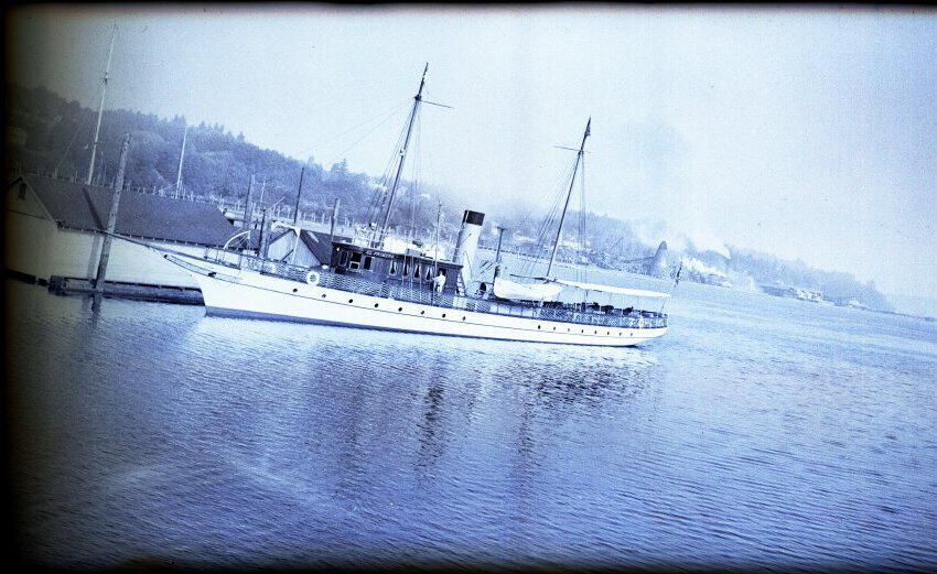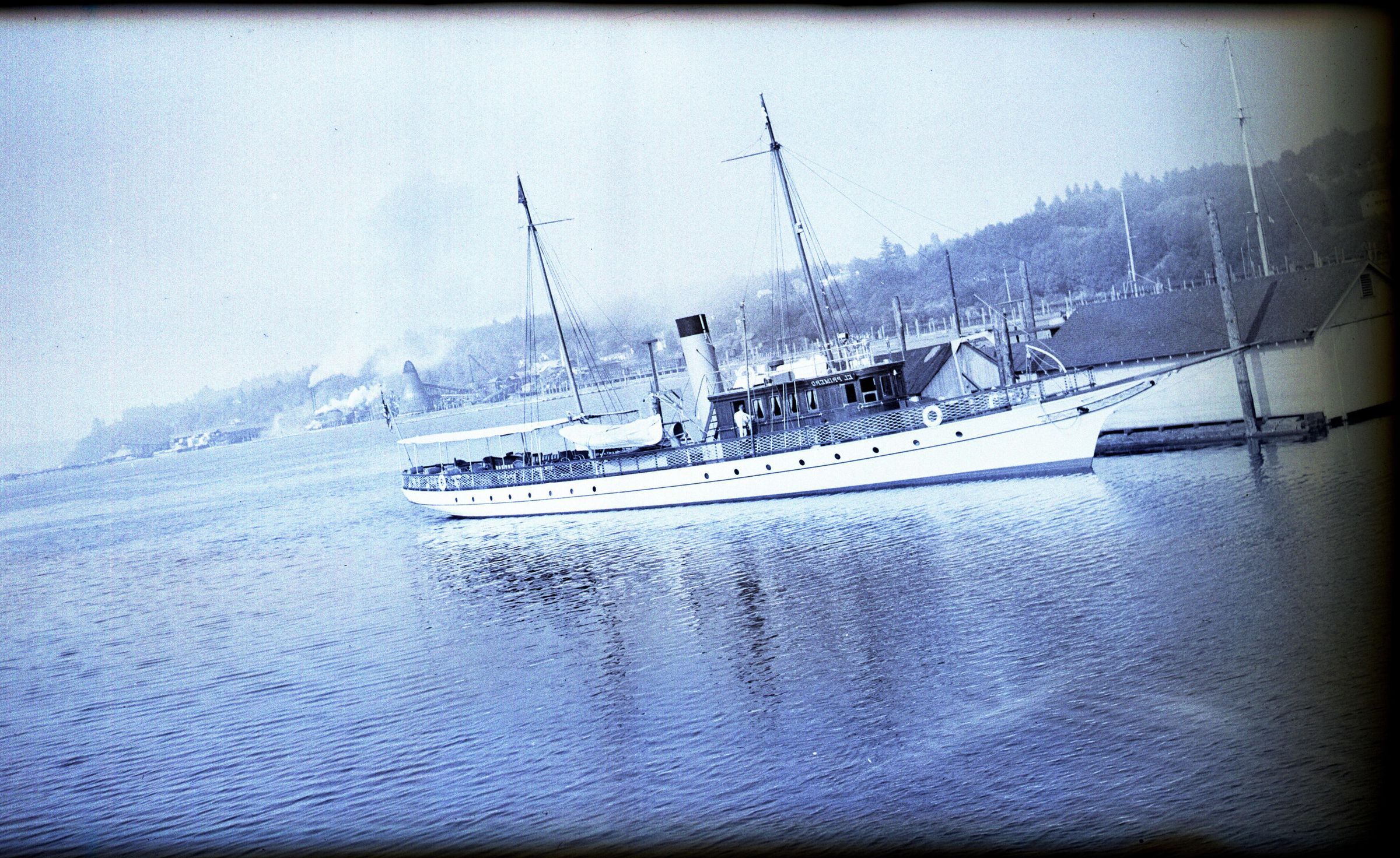 Black and white negative of a yacht in Olympia., In the foreground is water, and the yacht is moored against a floating walkway with a boat house on the other side. There are port holes on the yacht's side, and on the deck is a smoke stack, a life boat, an awning, masts, and a man standing. In the railing is a life preserver. In the background are more masts and the far shore with industries emitting smoke. Behind them is a hill with trees. There is a white border on all sides, and in the bottom border is "#2104 7/10/40".