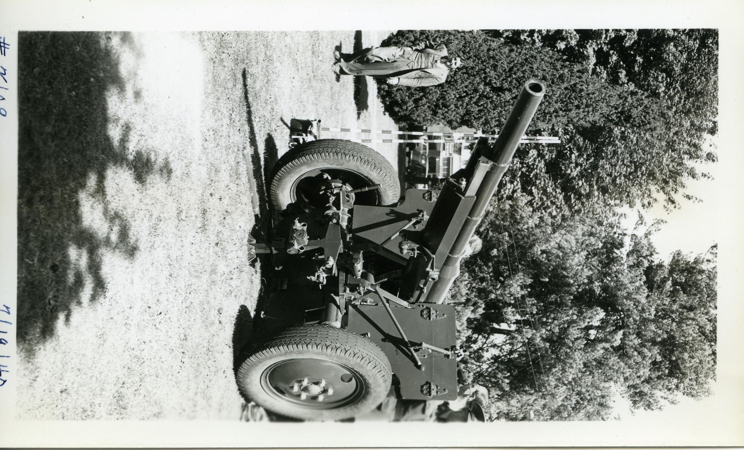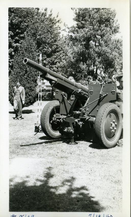 The photo is inserted, along with a negative of the image, into a cream colored envelope that has typed "7/19/40 - Olympia Army 75-mm field piece exhibited in City Park - front view showing moderate elevation". Stamped is "2109" and "indexed".Made/Created