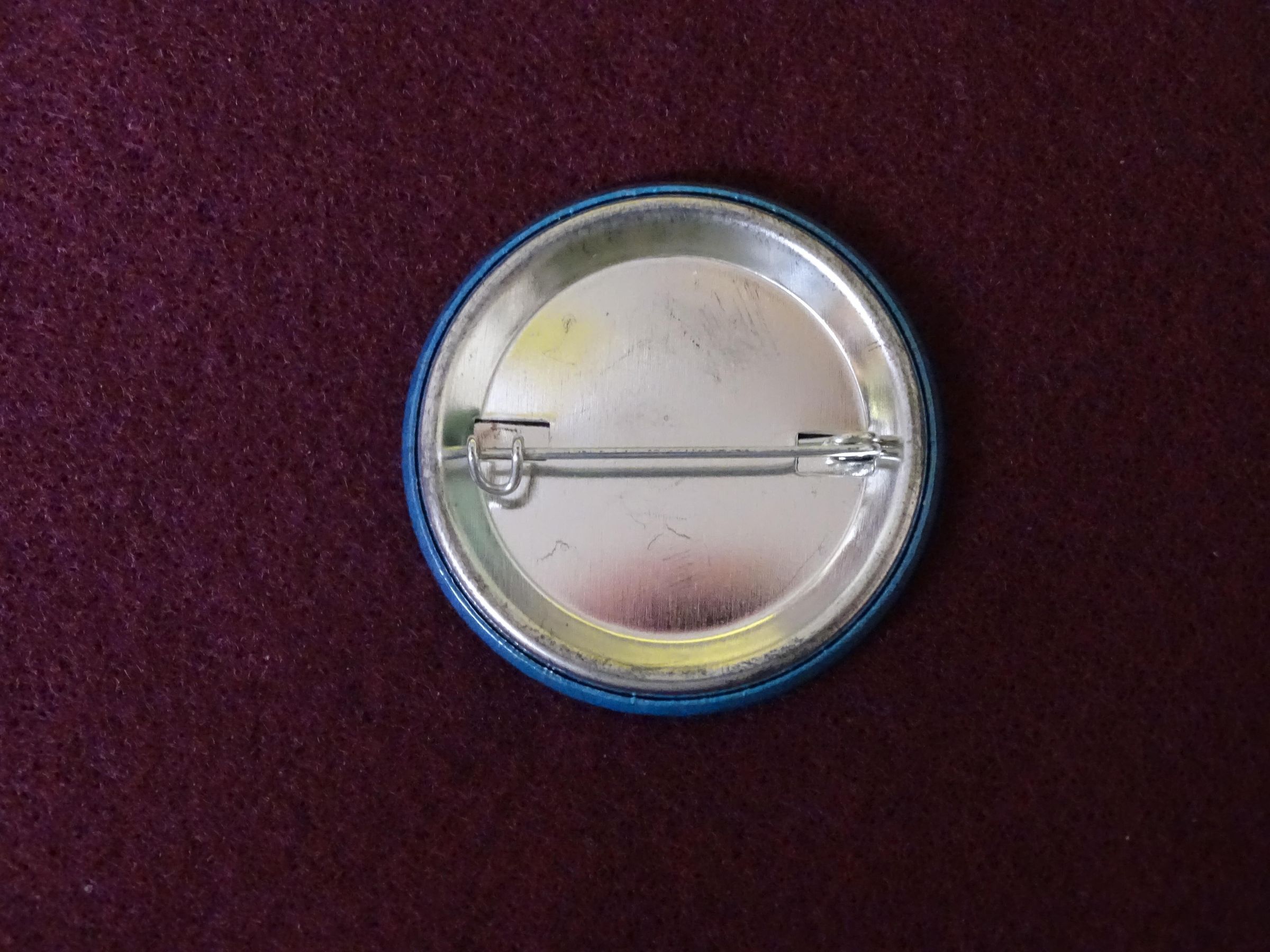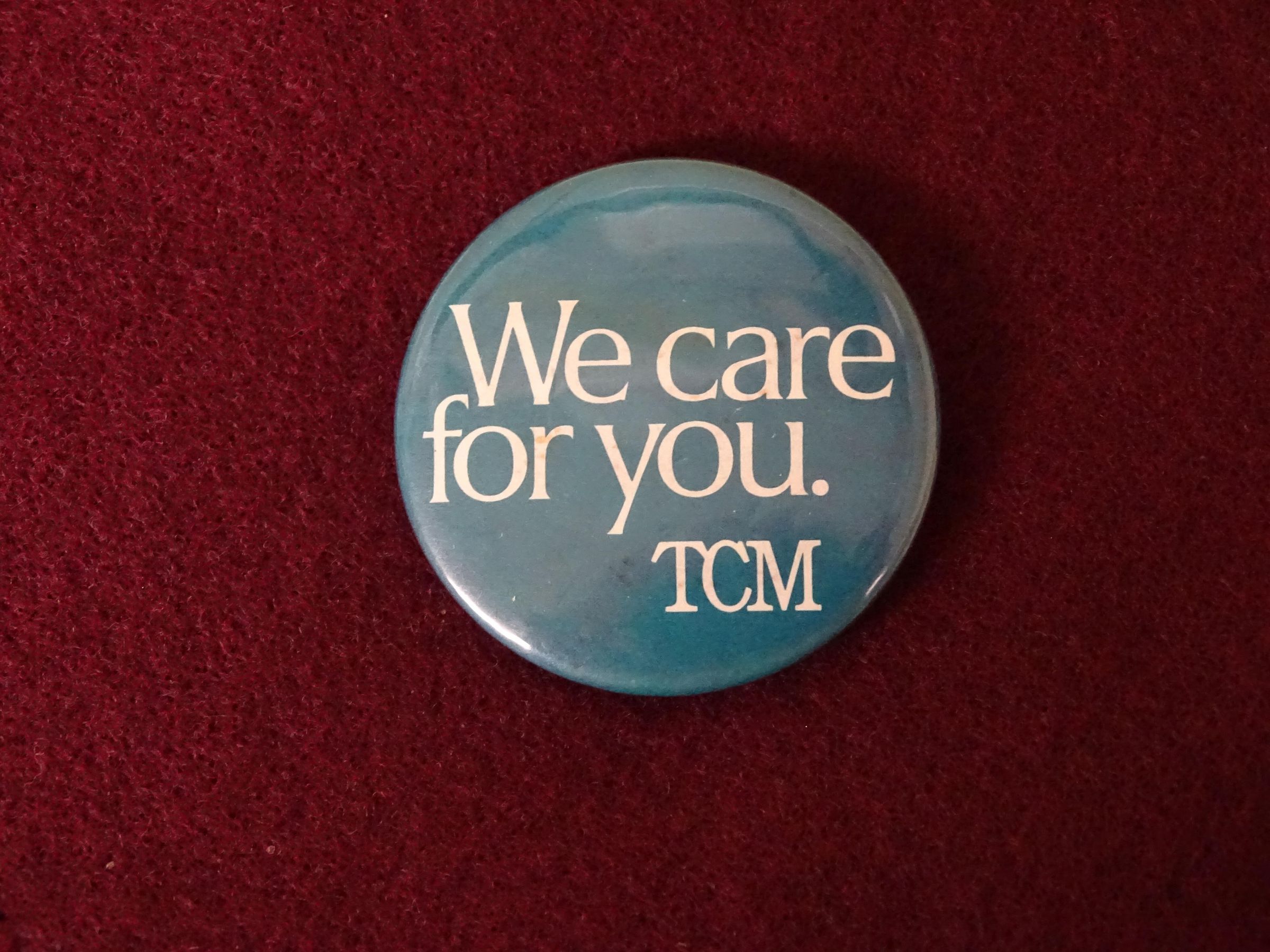 Blue colored metal button with white ink. On the front are the words "We care for you. TCM".Relationships