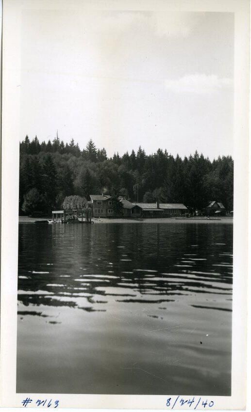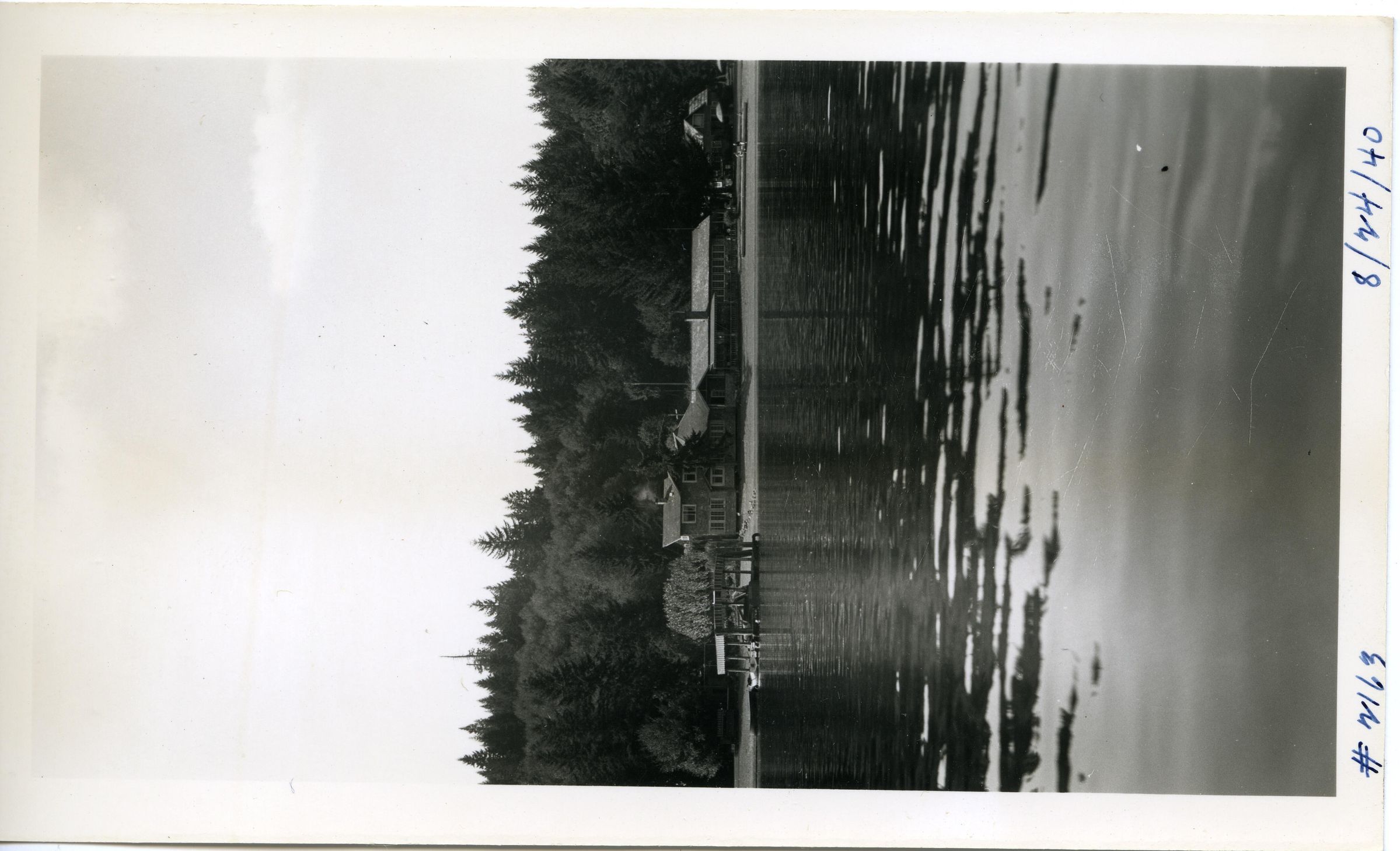 The photo is inserted, along with a negative of the image, into a cream colored envelope that has typed "8/24/40 - Alderbrook Hotel from a boat". Stamped is "2163" and "indexed".Made/Created