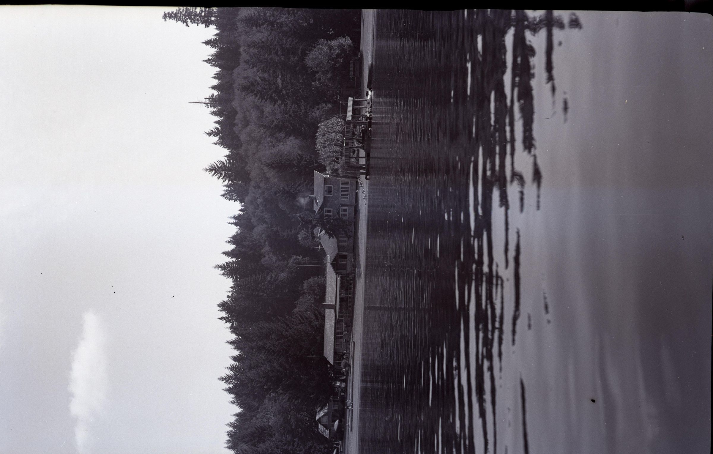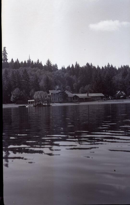 Black and white negative of the Alderbrook Hotel from a boat. There is water in the foreground, and in the middle distance is a beach and a structure with two stories on the left and one story on the right. There is a framework at the edge of the water at the left, and another structure at the right. In the background is a hill with trees. There is a white border on all sides, and in the bottom border is "#2163 8/24/40". The negative is inserted, along with a print of the image, into a cream colored envelope that has typed "8/24/40 - Alderbrook Hotel from a boat". Stamped is "2163" and "indexed".Made/Created