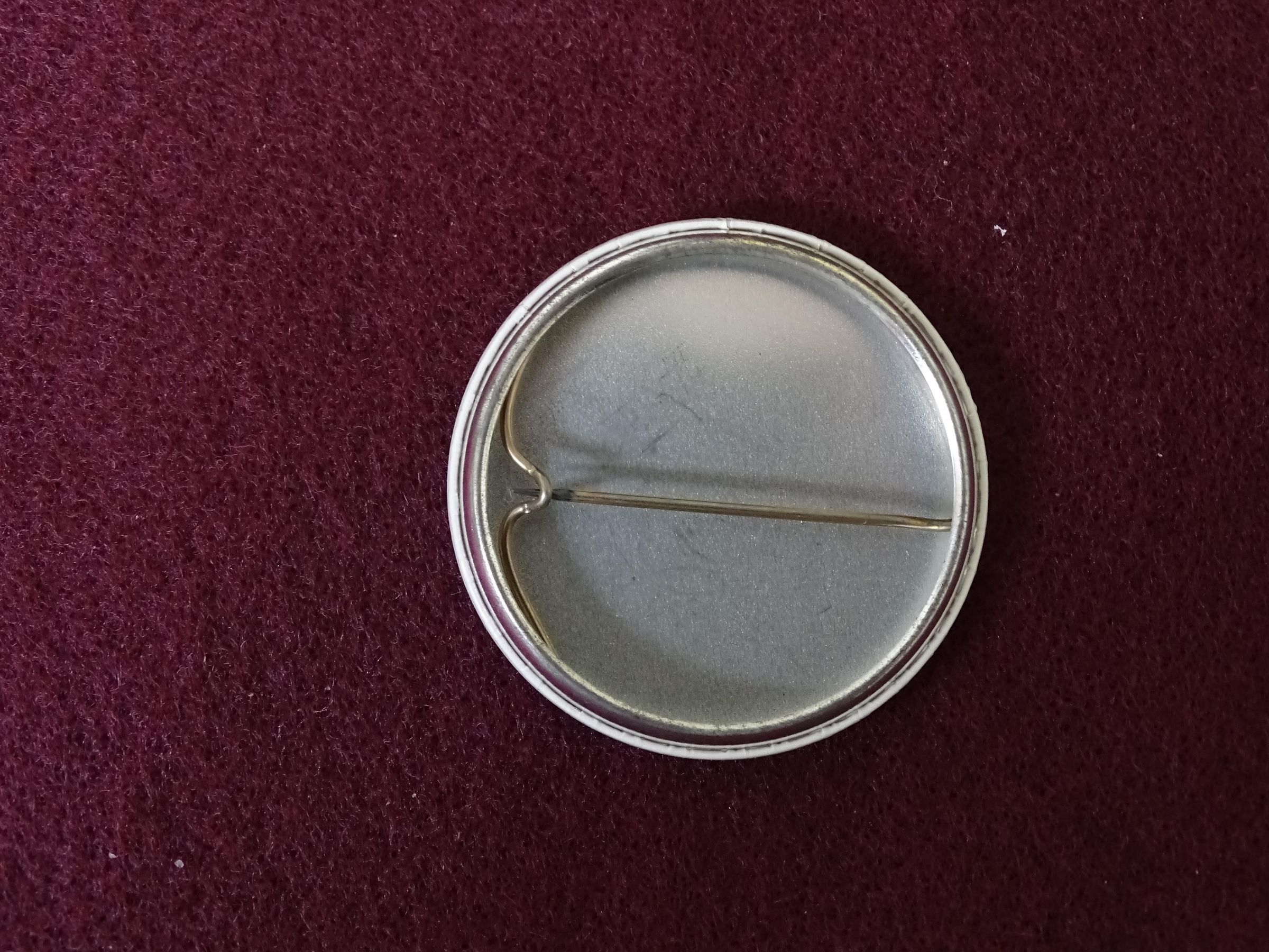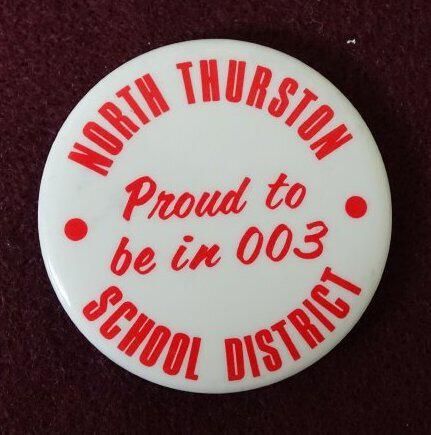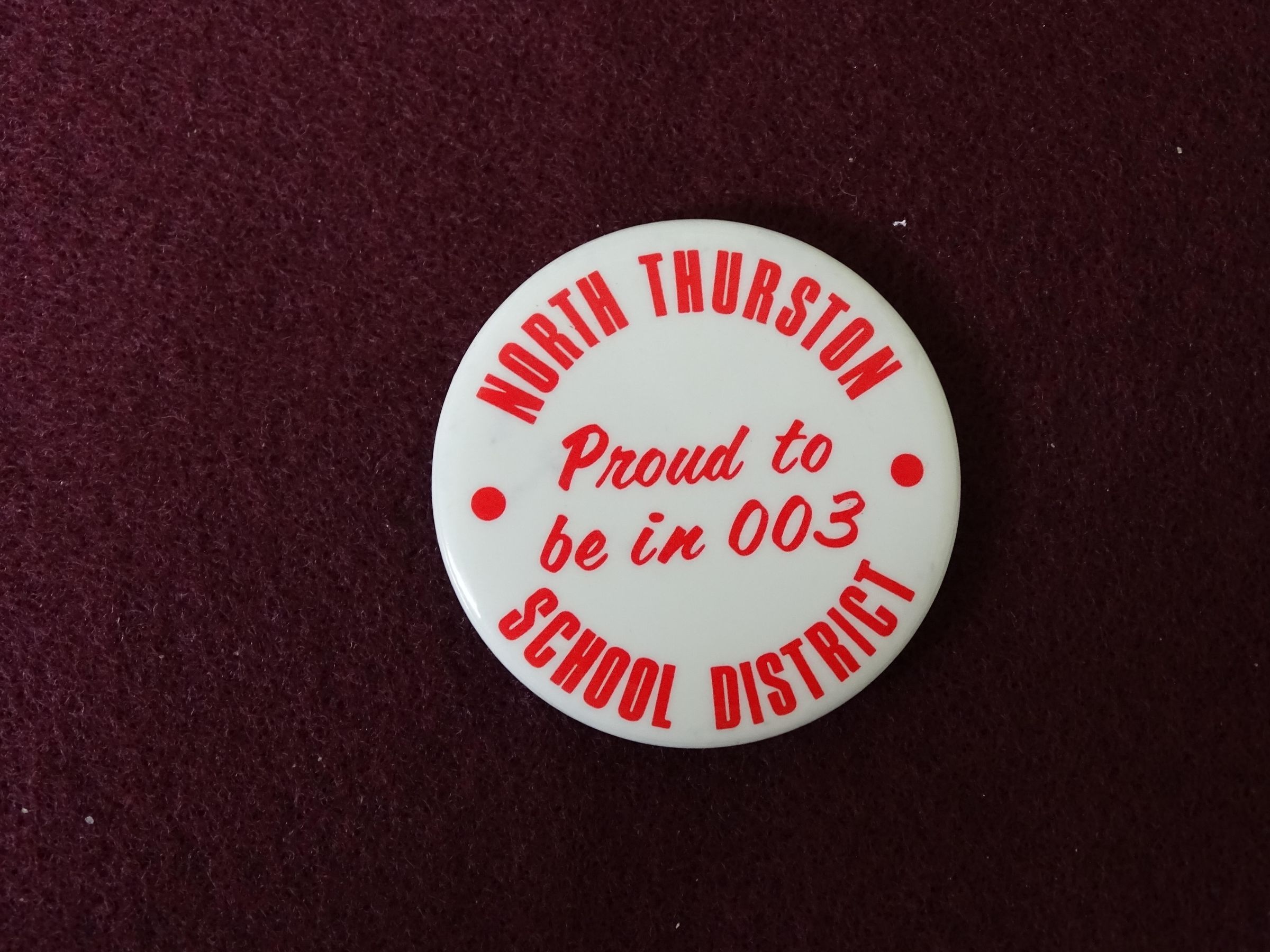 White colored metal button with red ink. On the front are the words "North Thurston School District, Proud to be in 003".Relationships