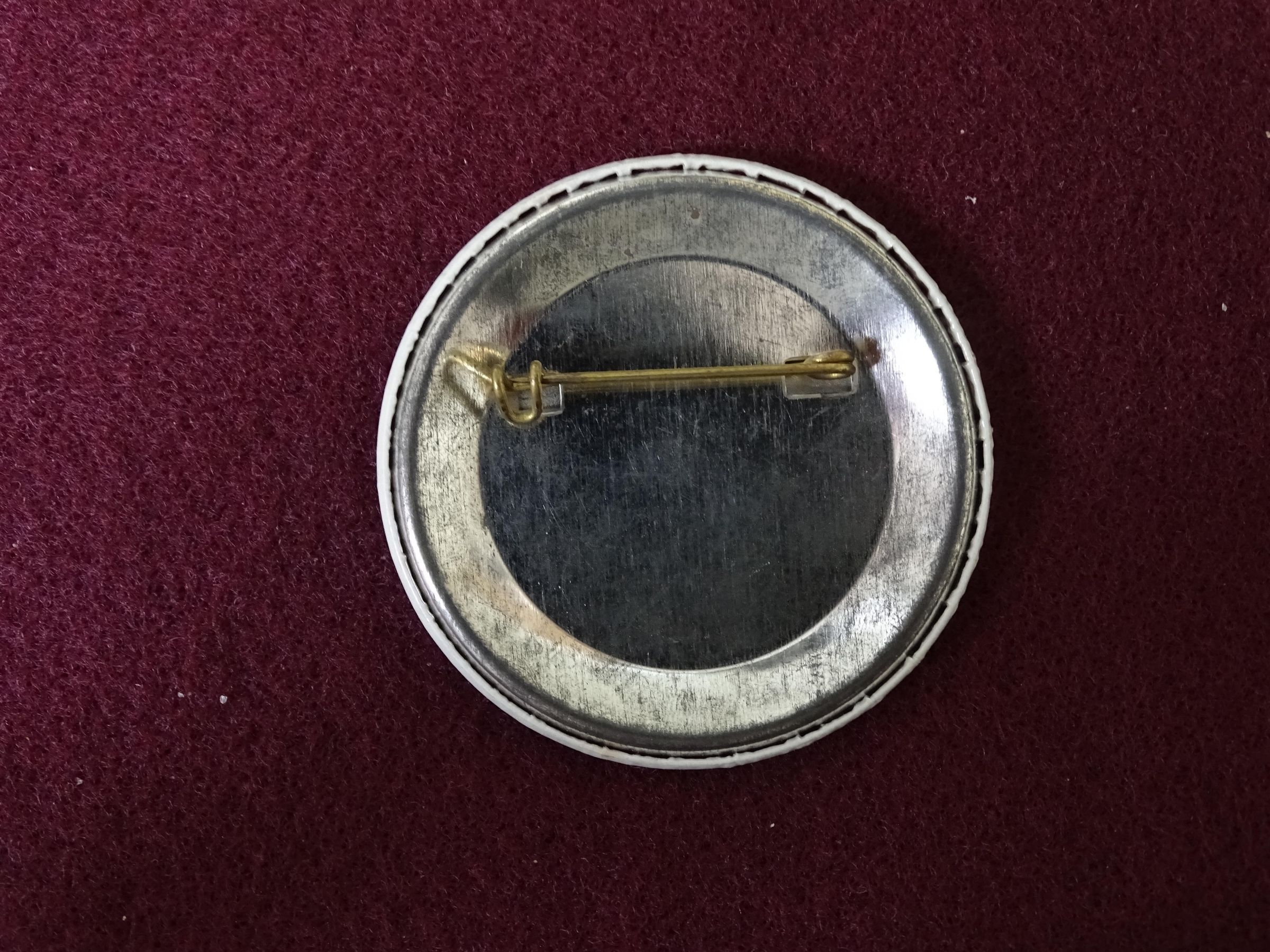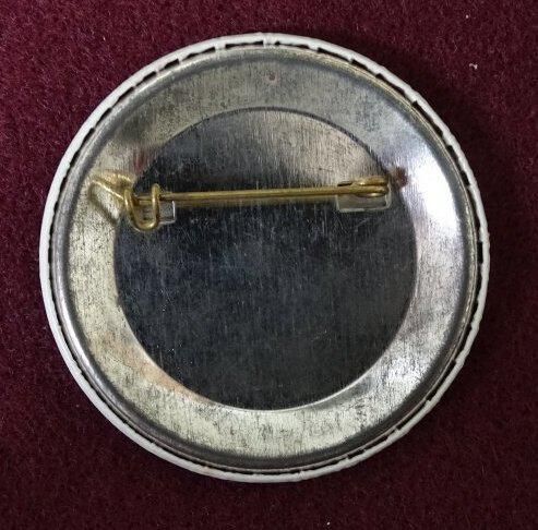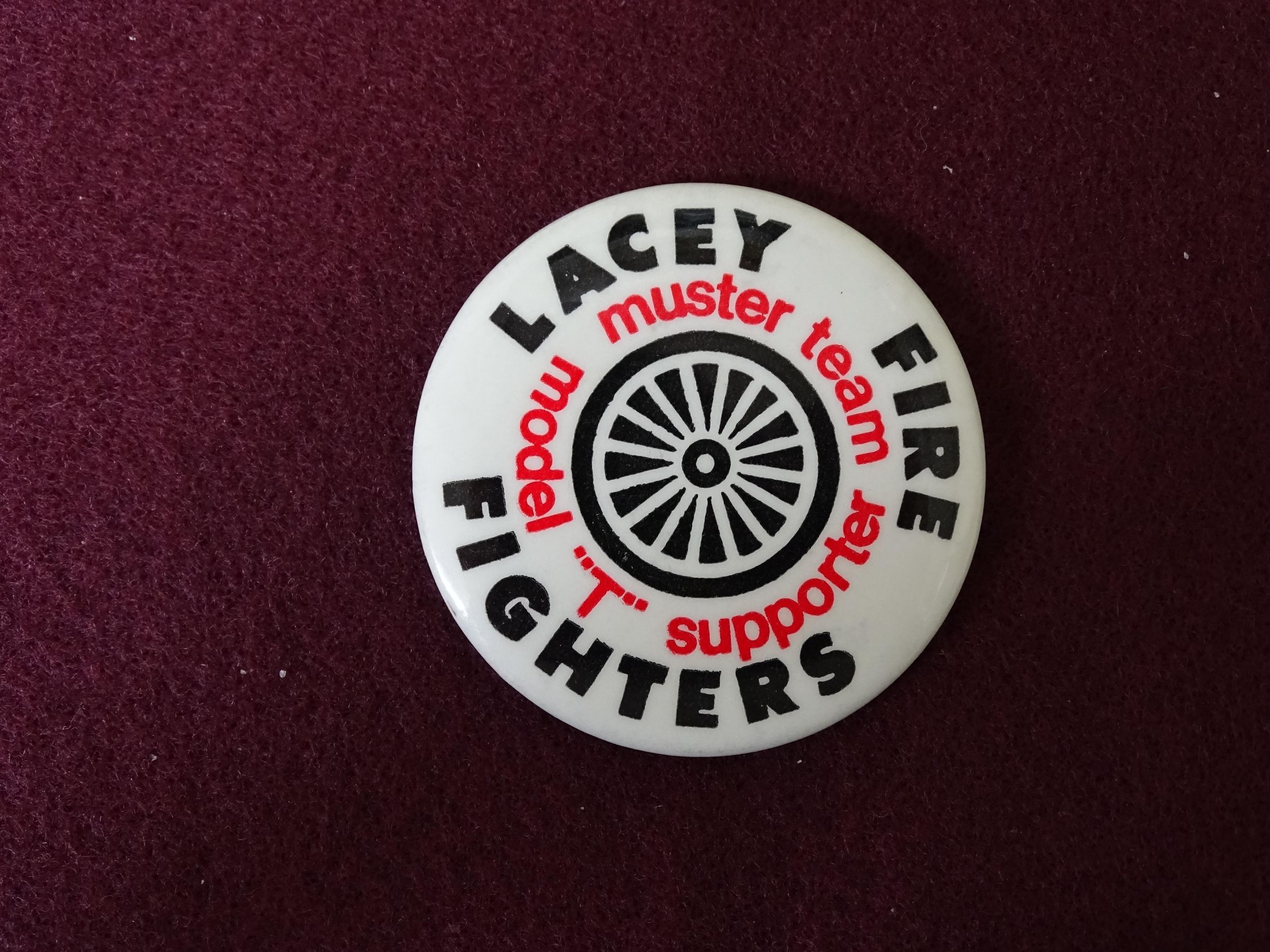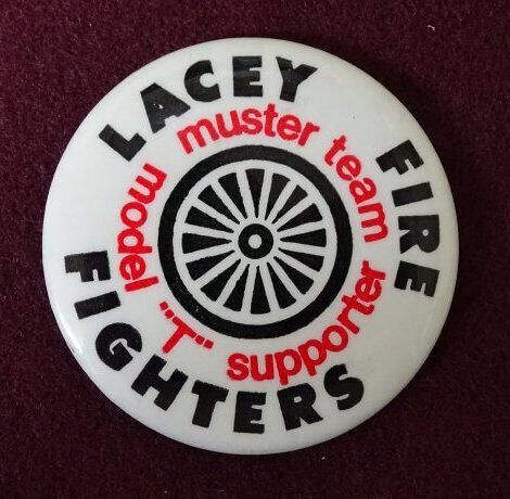 White colored button with red and black ink. On the front is an image of a wagon wheel and, around the side, the words in black "Lacey Fire Fighters" and in red "Muster Team Model 'T' Supporter".Relationships