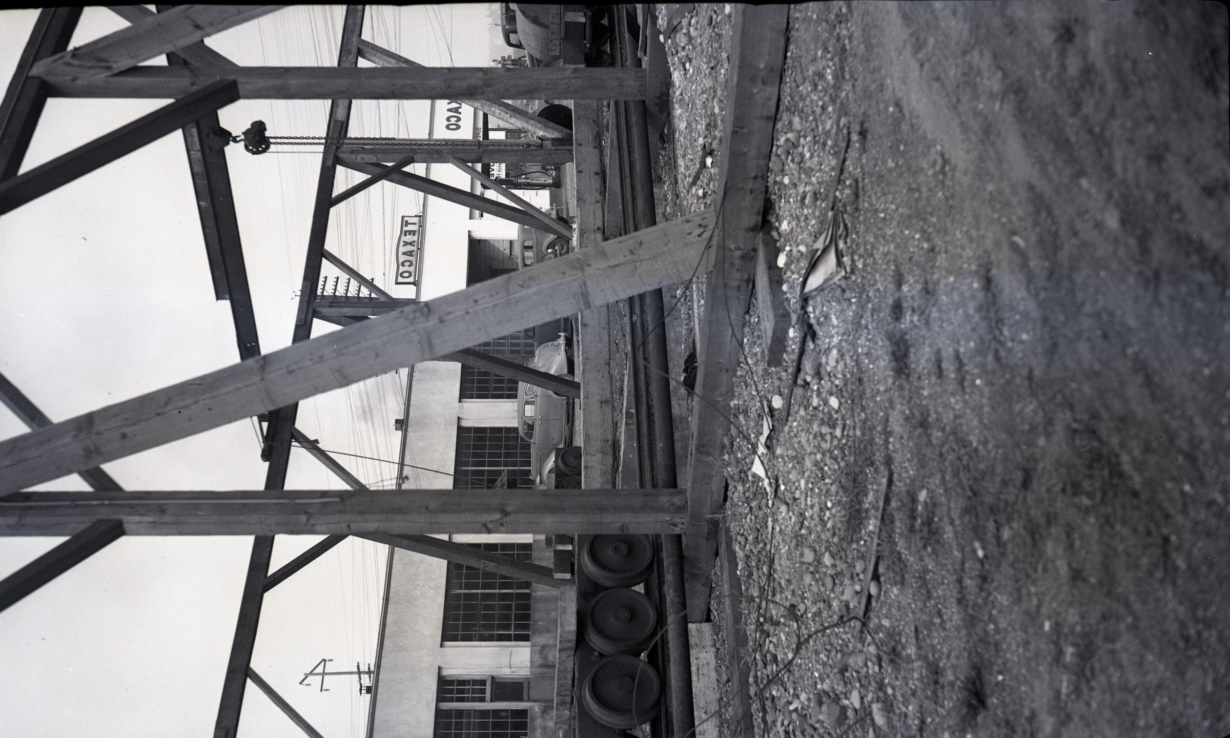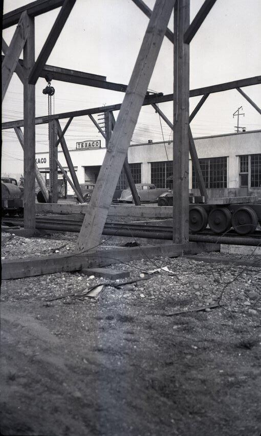 Black and white negative of the ways at Reliable Welding for building a barge. There is gravel and debris on the ground in the foreground and large wooden beams forming an upright triangle. Behind that are rails with metal wheels on them and a steel framework. Further back is a service station with the sign "Texaco" visible. Further back are telephone poles. .There is a white border on all sides, and in the bottom border is "#2180 10/15/40".
