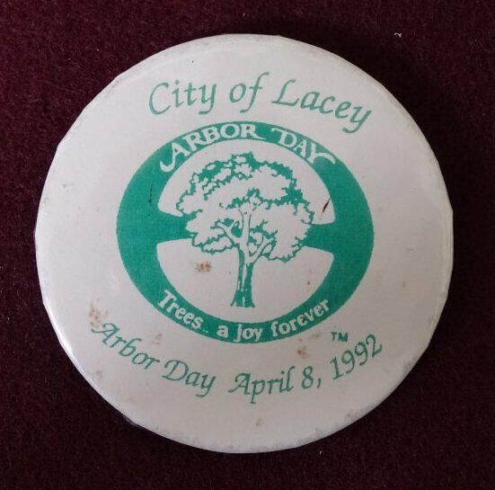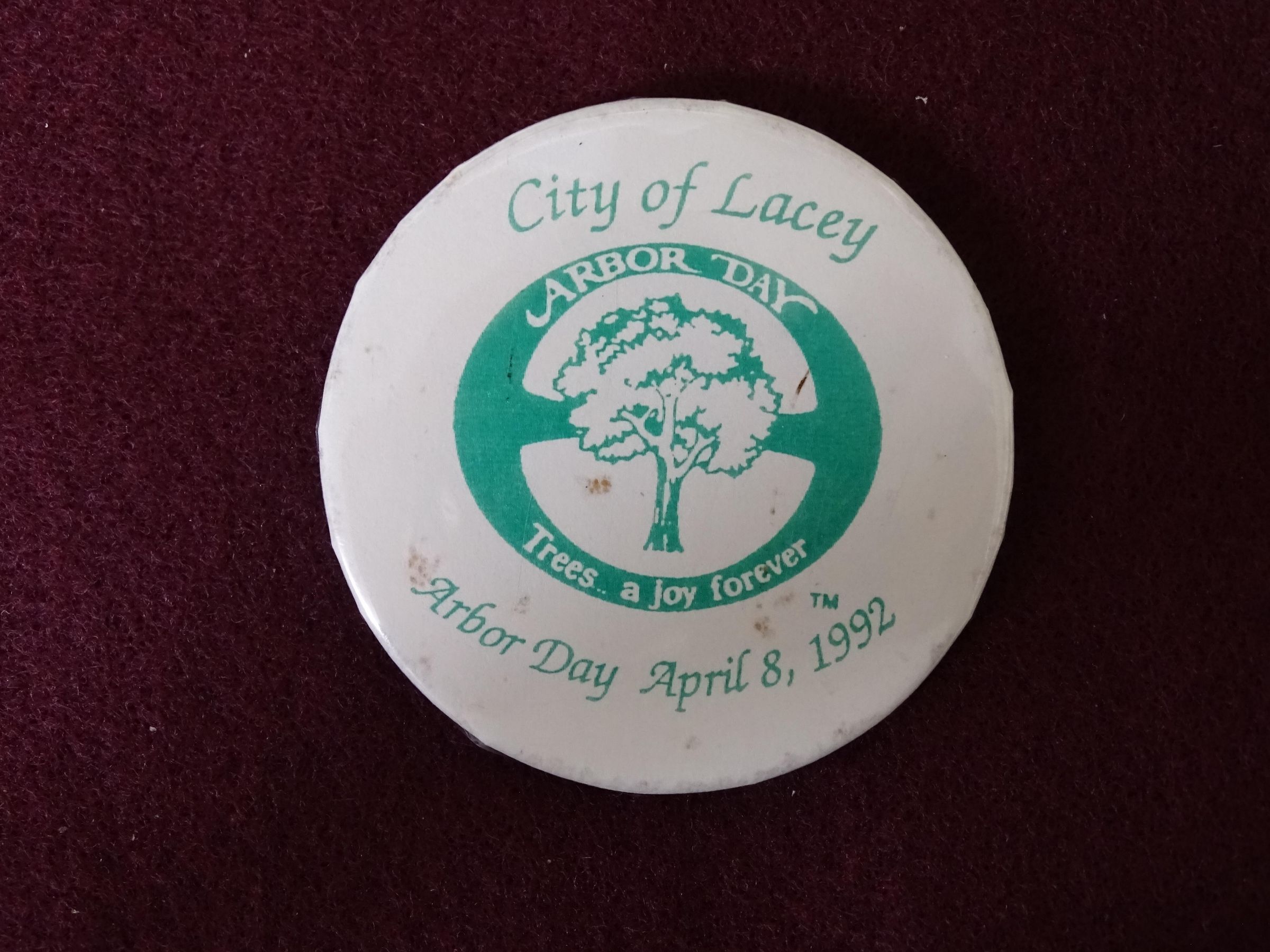 White colored button with green ink. On the front are the words "City of Lacey, Arbor Day April 8, 1992". In the center of the front is a green oval with a cross bar. In the center of the oval is the image of a tree. On the oval are the words "Arbor Day, Trees a joy forever". Also are the letters "TM". On the back is stamped "Badge a Minit, Lasalle, IL 61301".Relationships