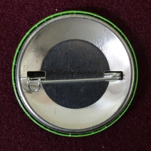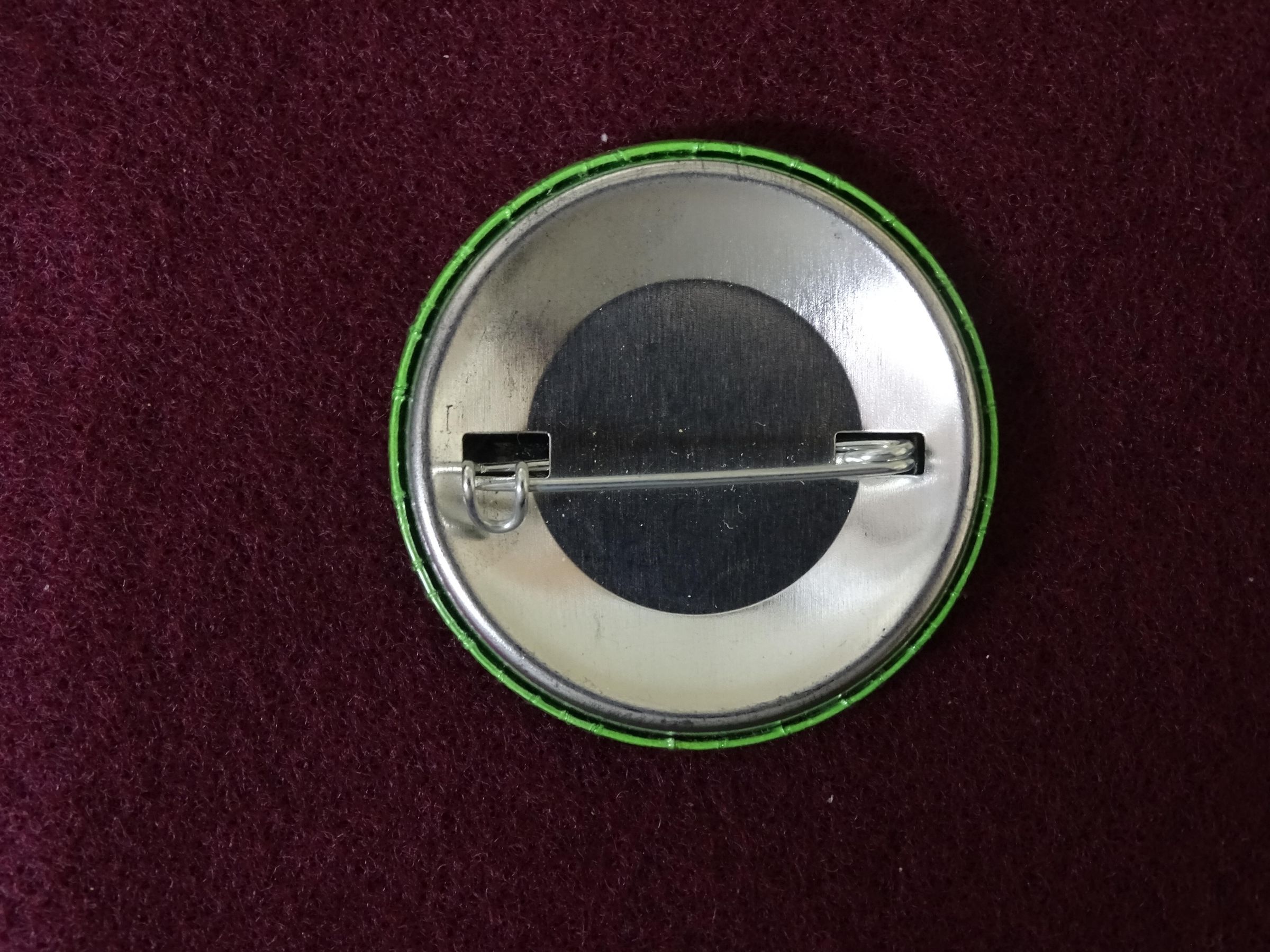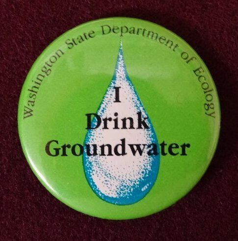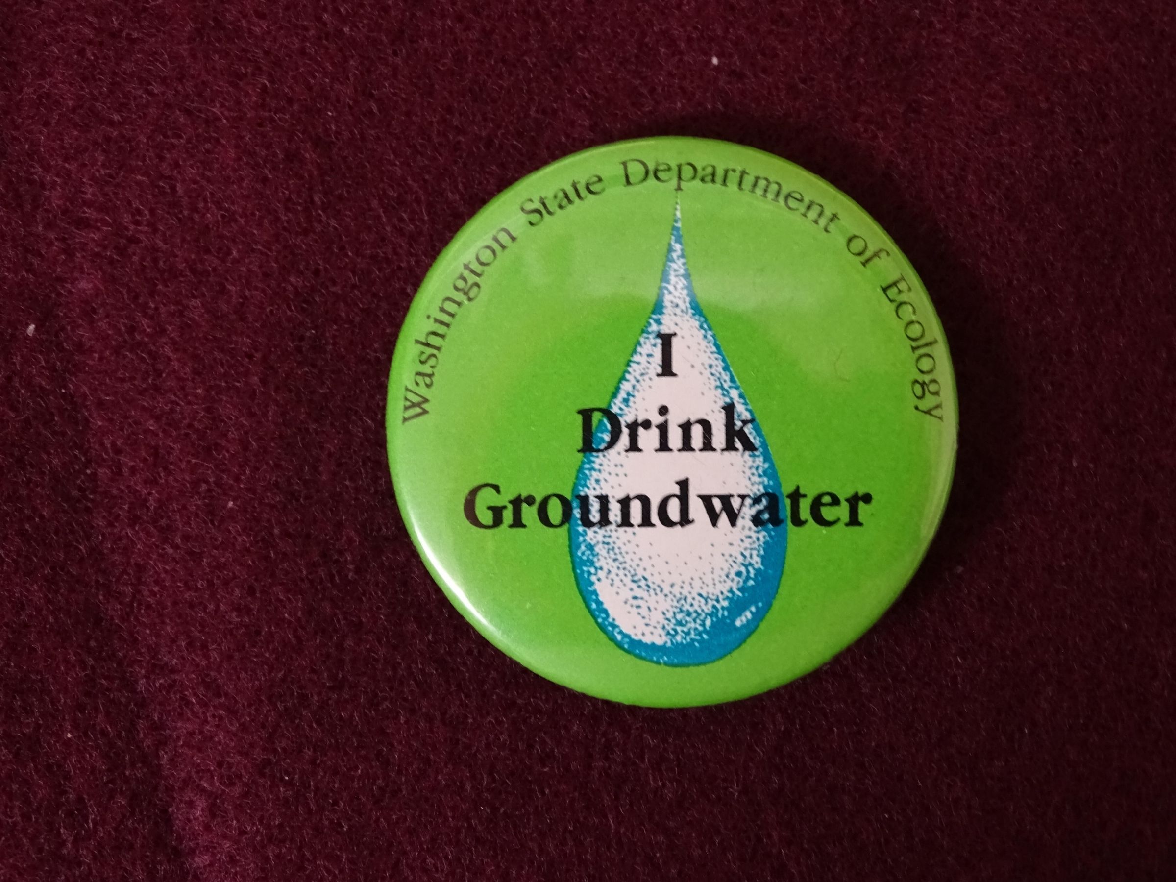 Green colored metal button with black, white, and blue ink. On the front is an image of a drop of water and the words "Washington State Department of Ecology, I Drink Groundwater".Relationships