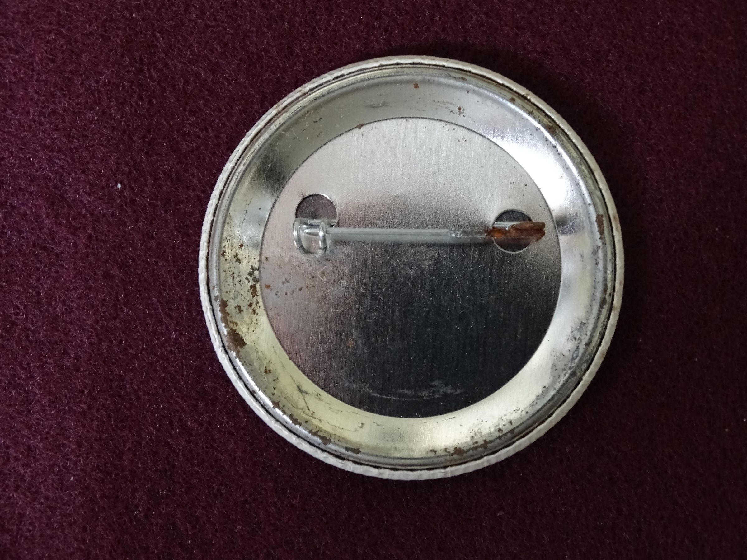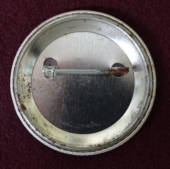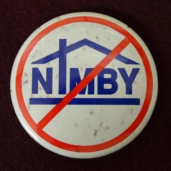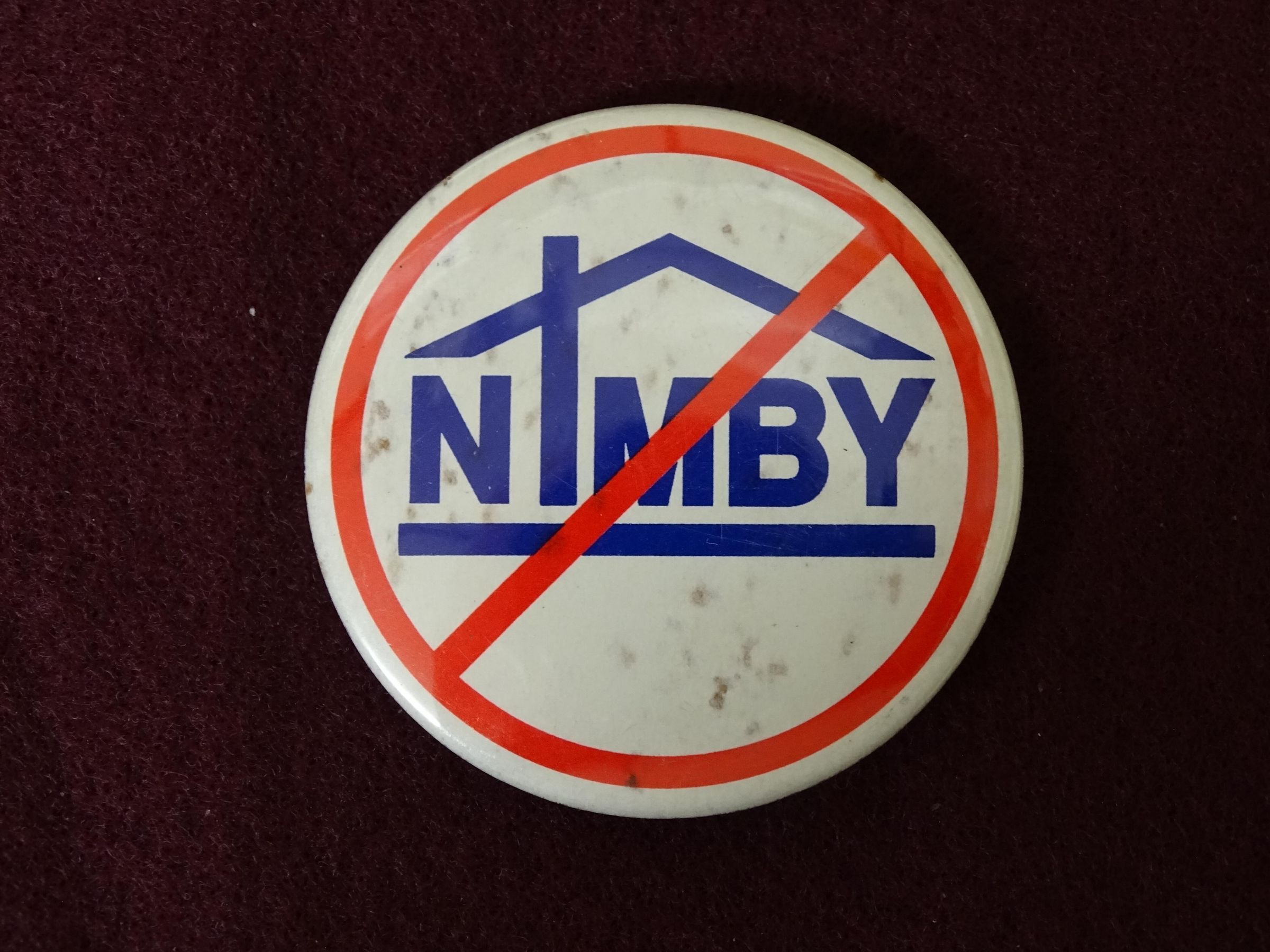 White colored metal button with red and blue ink. On the front in blue is the letters "NIMBY" inside what is a stylized house. Around the outside and across the blue letters is a red line.Relationships