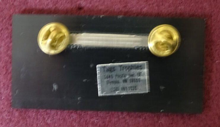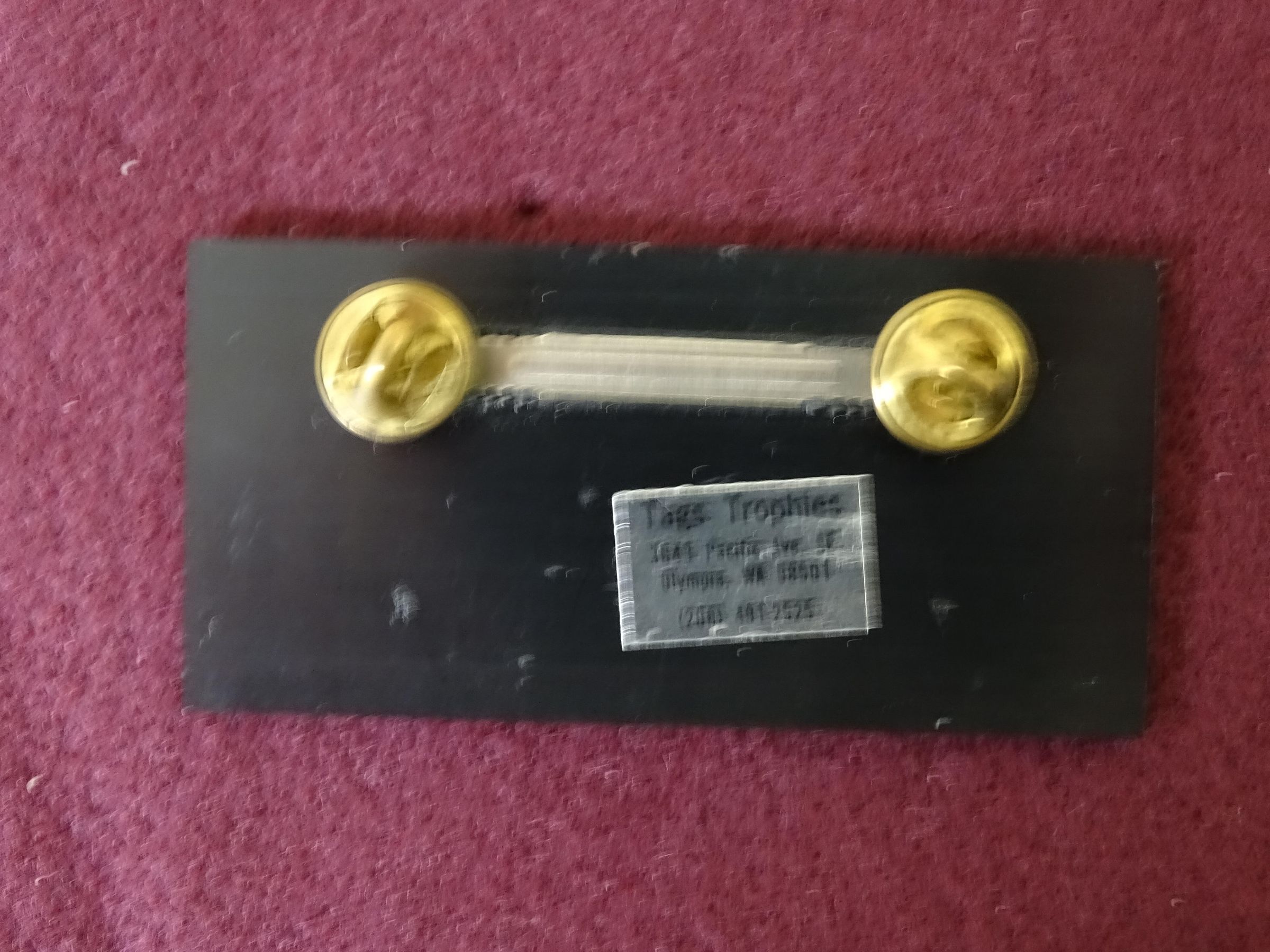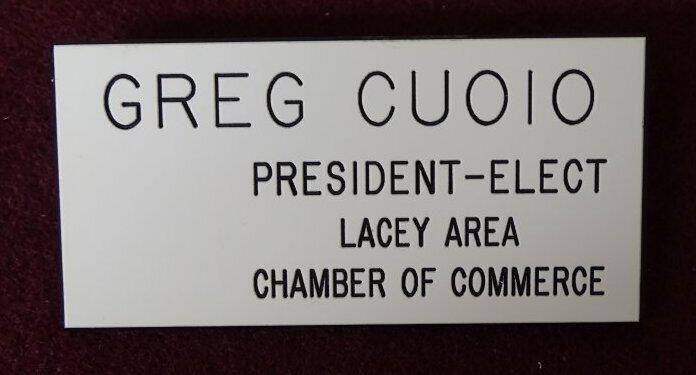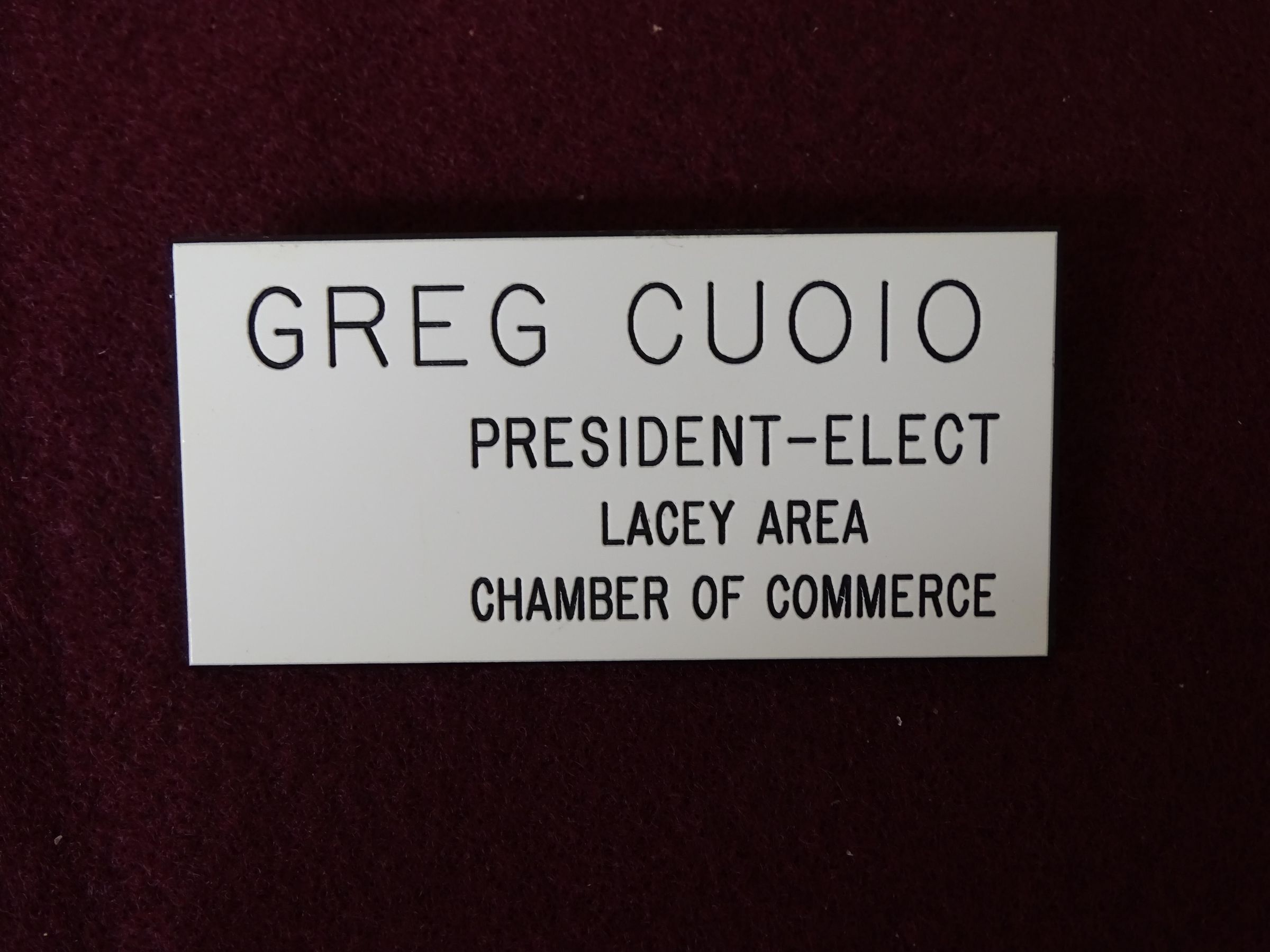 Plastic rectangular badge with black on white lettering. On the front is "Greg Cuoio, President-elect, Lacey Area Chamber of Commerce". On the back is "Tags Trophies, 3643 Pacific Ave. SE Olympia, WA 98501, (206) 491-2525". Also on the back are two clips that fit on prongs for attaching to clothing.Relationships