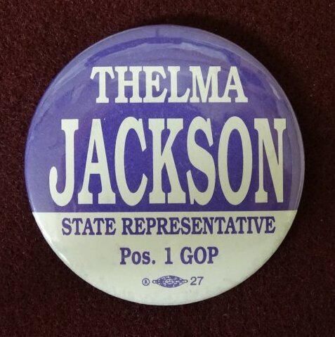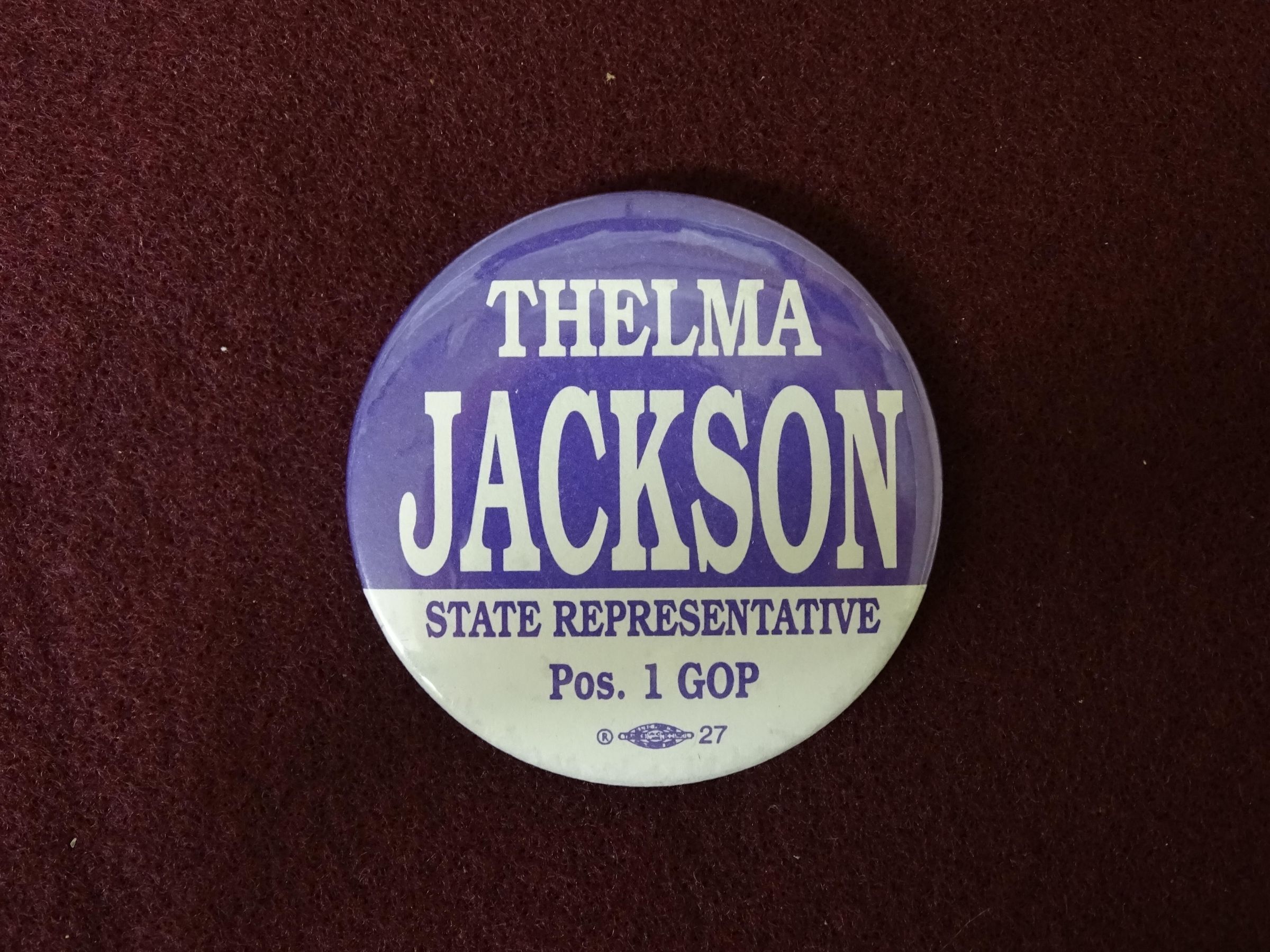 Metal campaign button with purple ink on white. On the front are the words "Thelma Jackson, State Representative, Pos. 1 GOP" There is also a printer's logo and a number "27". Thelma Jackson was a long-time member of the North Thurston School Board. She lost the election.Relationships