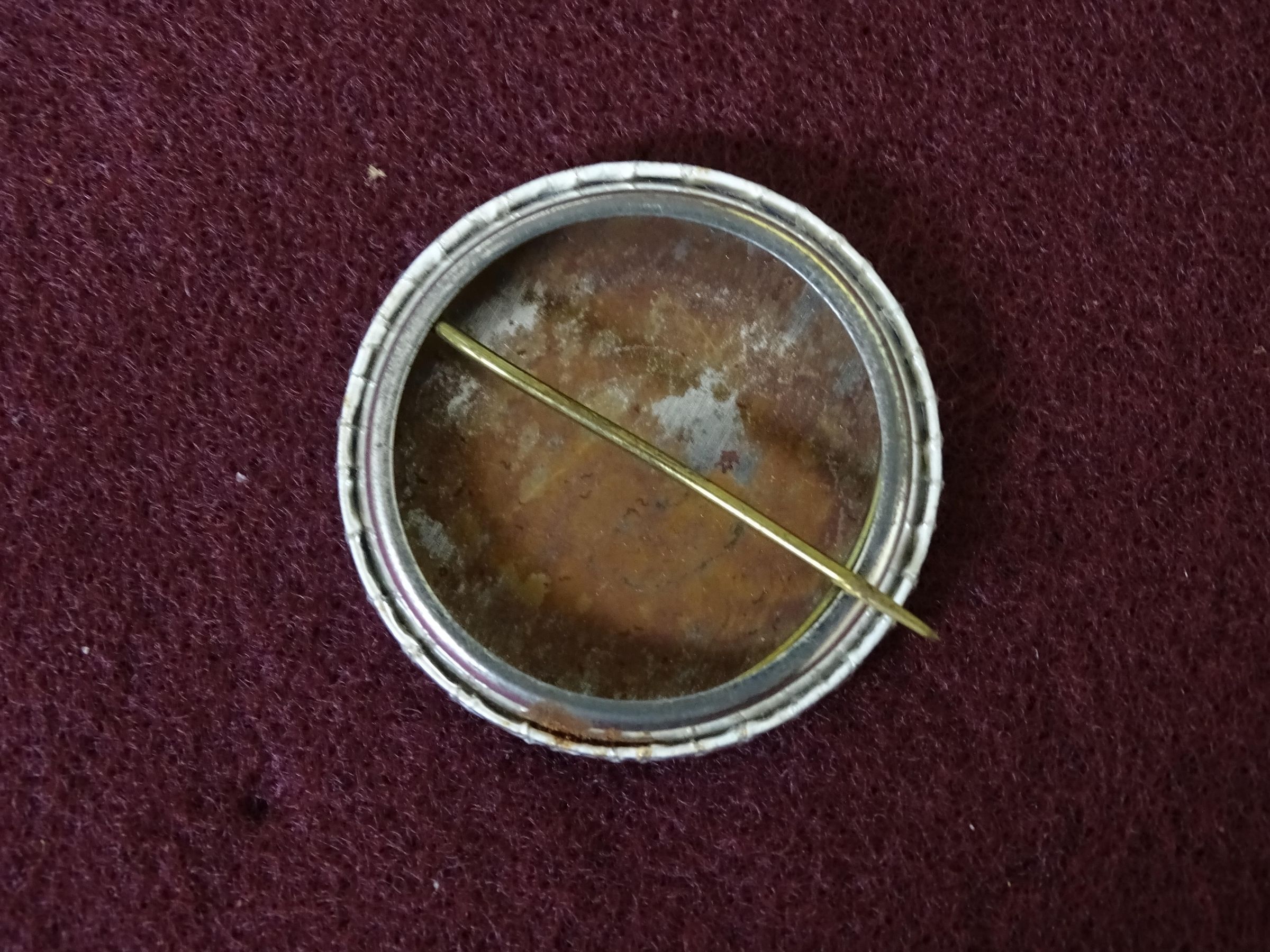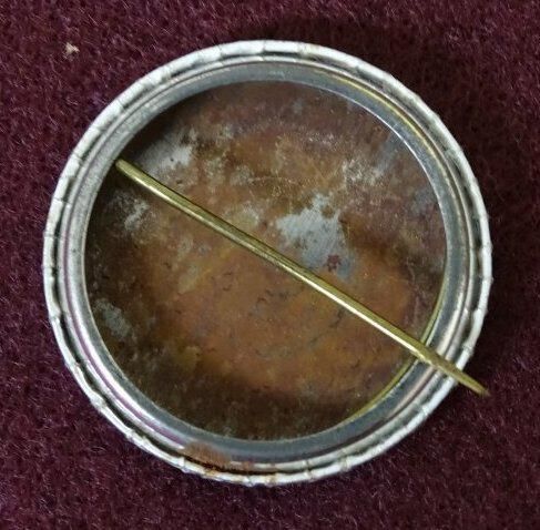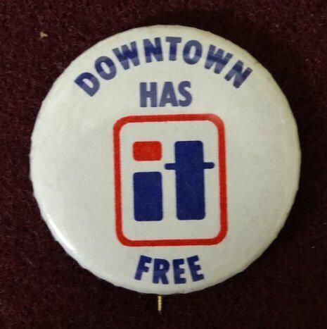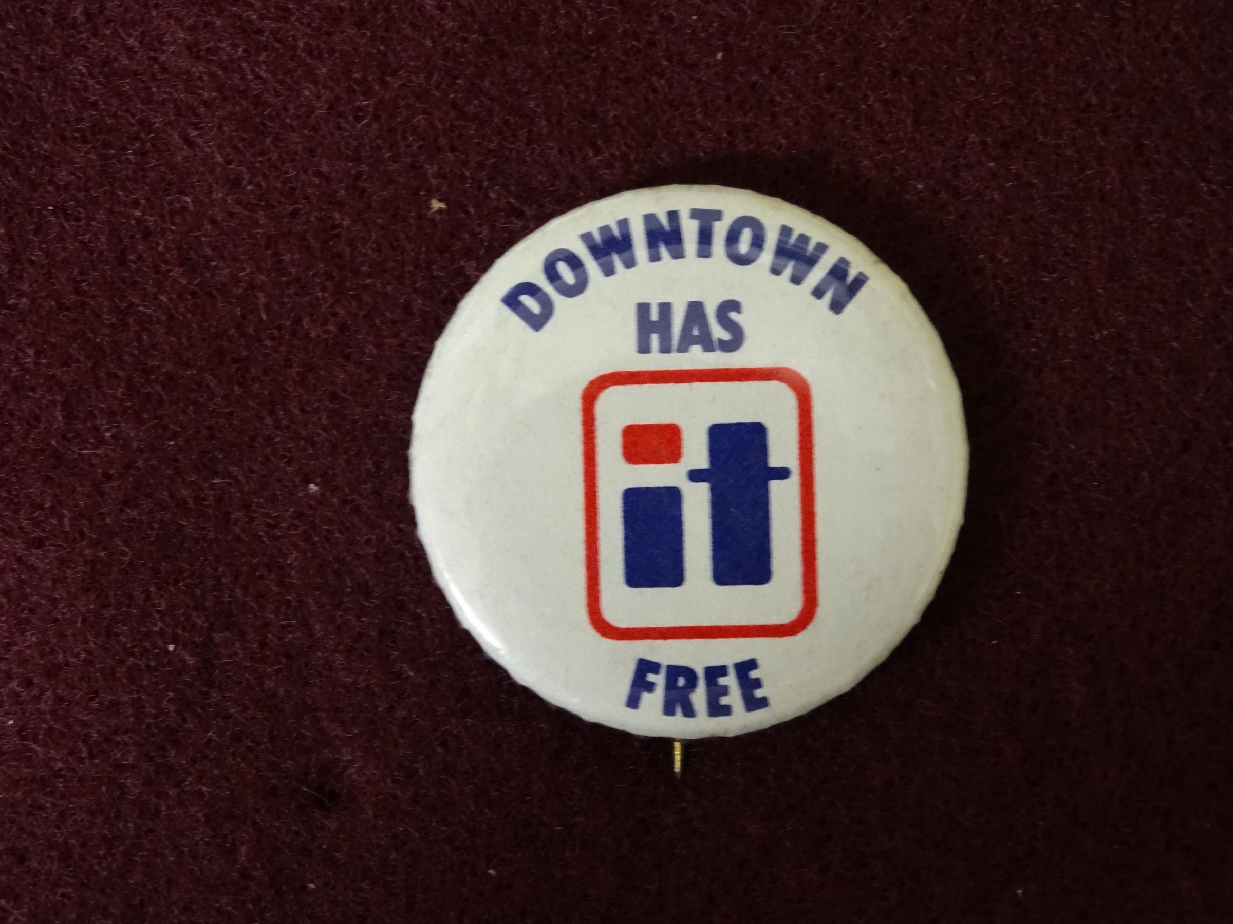 Metal promotional button with red and blue ink on white. On the front are the words "Downtown has IT free".Relationships