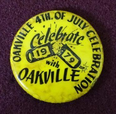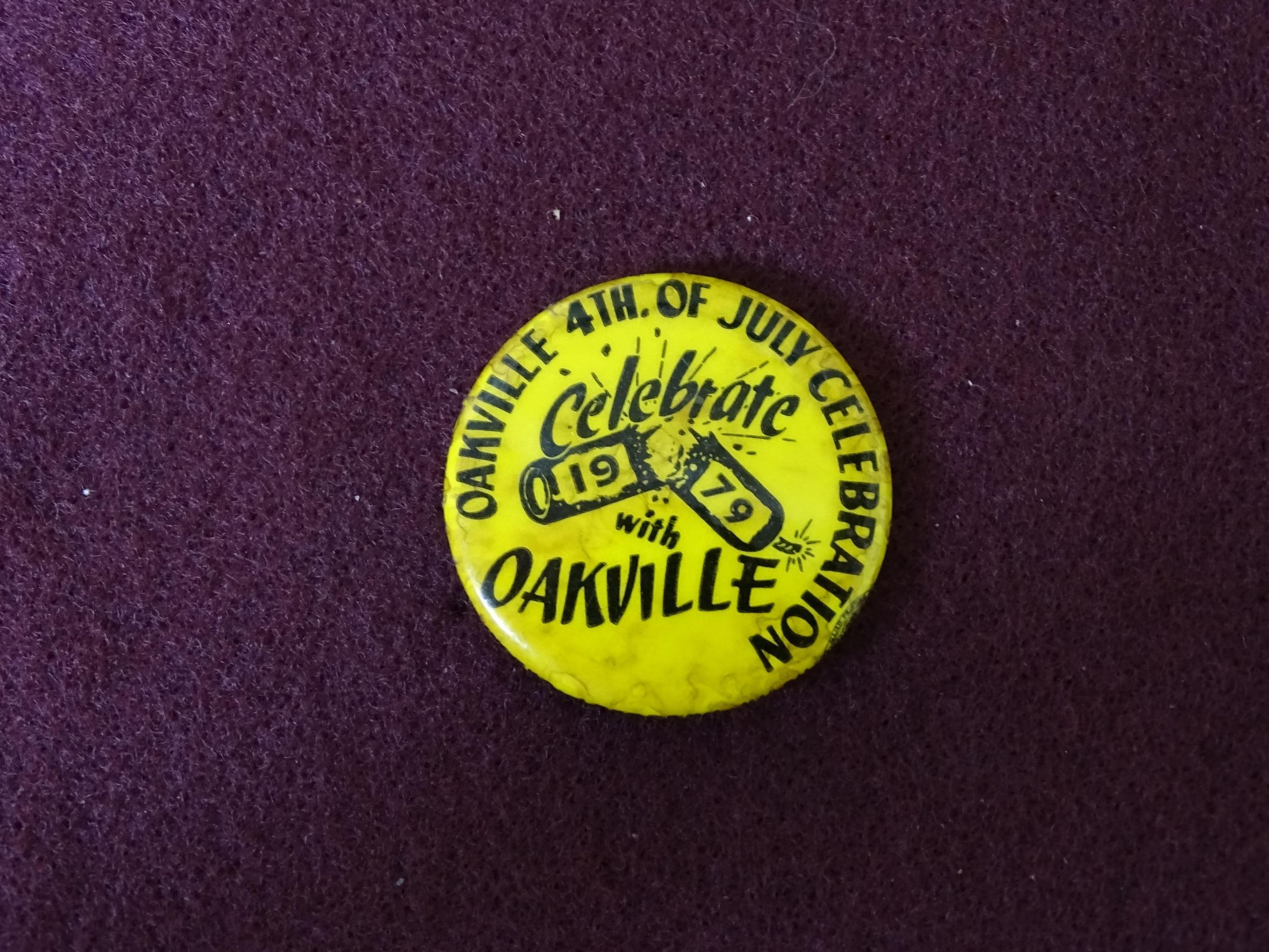 Metal promotional button with black ink on yellow. Around the outside of the front is "Oakville 4th of July Celebration" In the center is "Celebrate with Oakville" and inside an image of a firecracker is "1979". On the edge is "stamp works, Aberdeen, Wash" and a printer's logo.Relationships