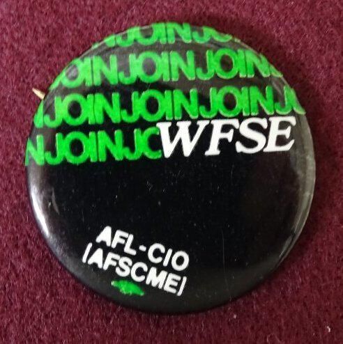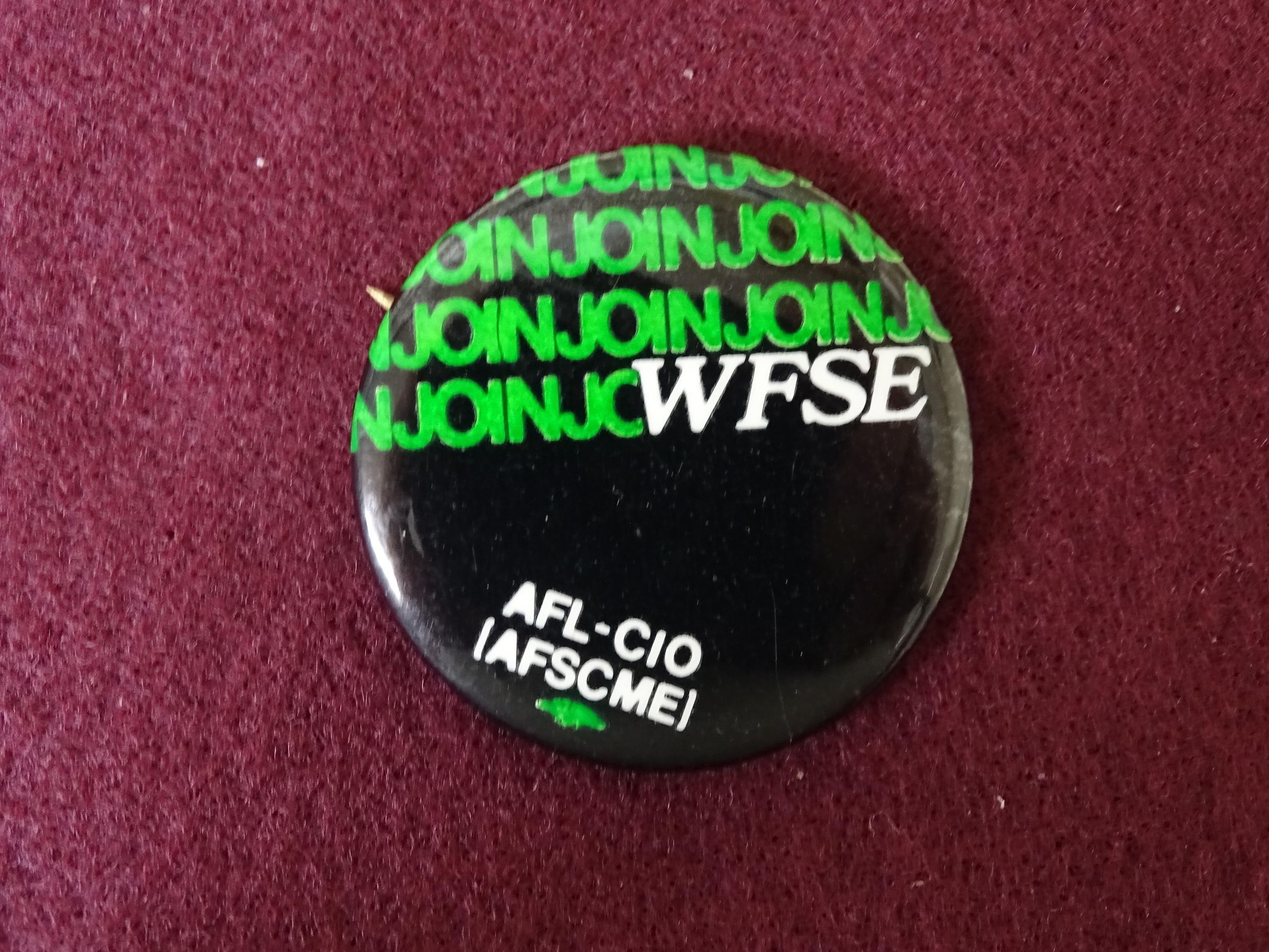 Metal button with green and white on black. On the front is "Join" repeated several times and "WFSE, AFL-CIO (AFSCME)".Relationships
