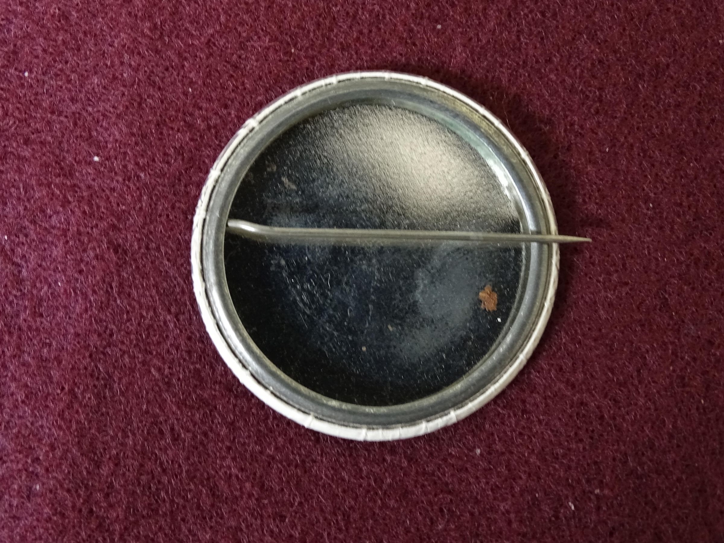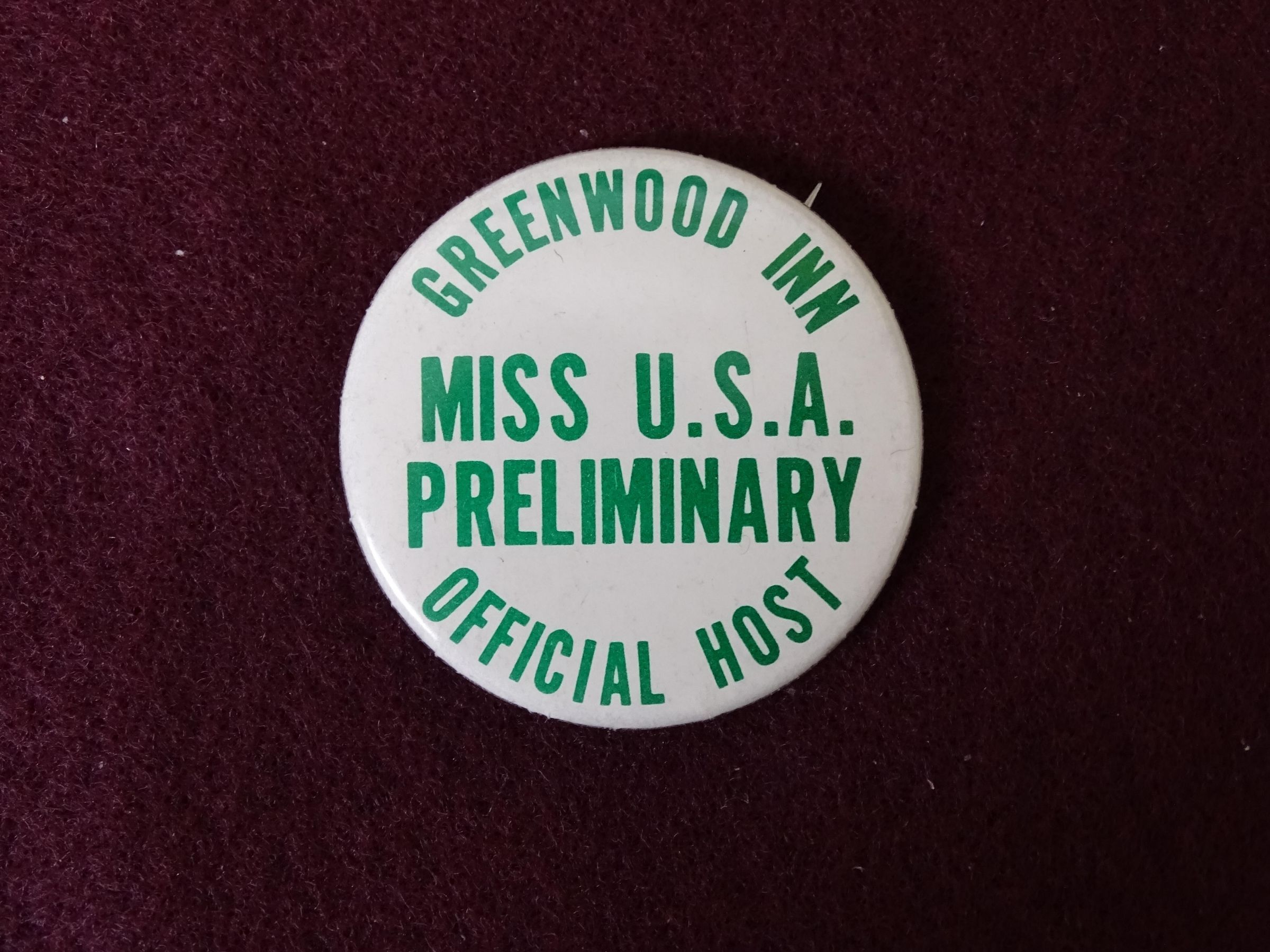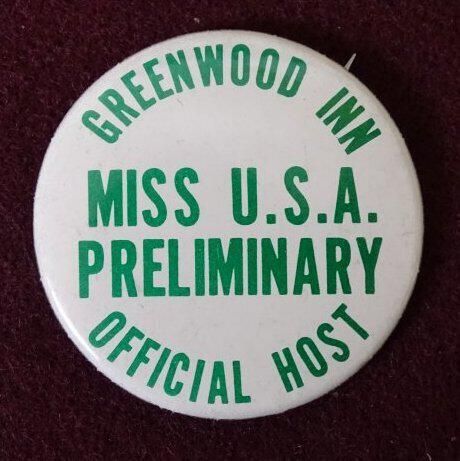 Metal button with green on white. On the front is "Greenwood Inn, Miss U.S.A. Preliminary, Official Host".Relationships