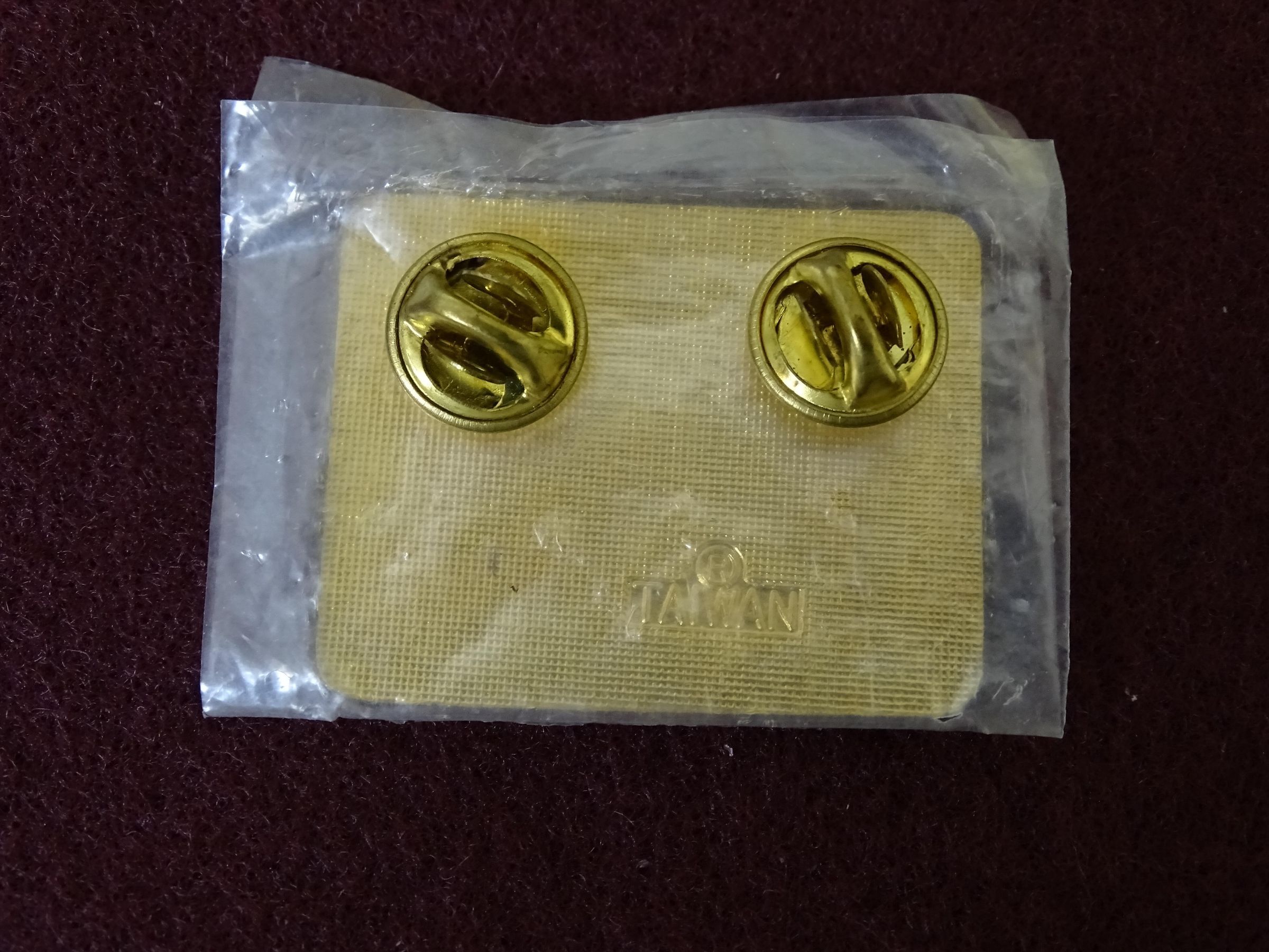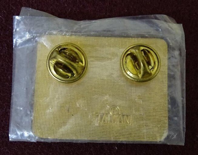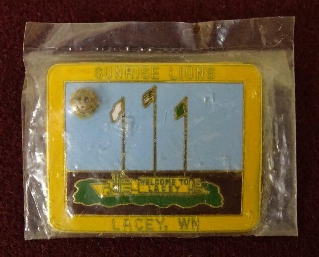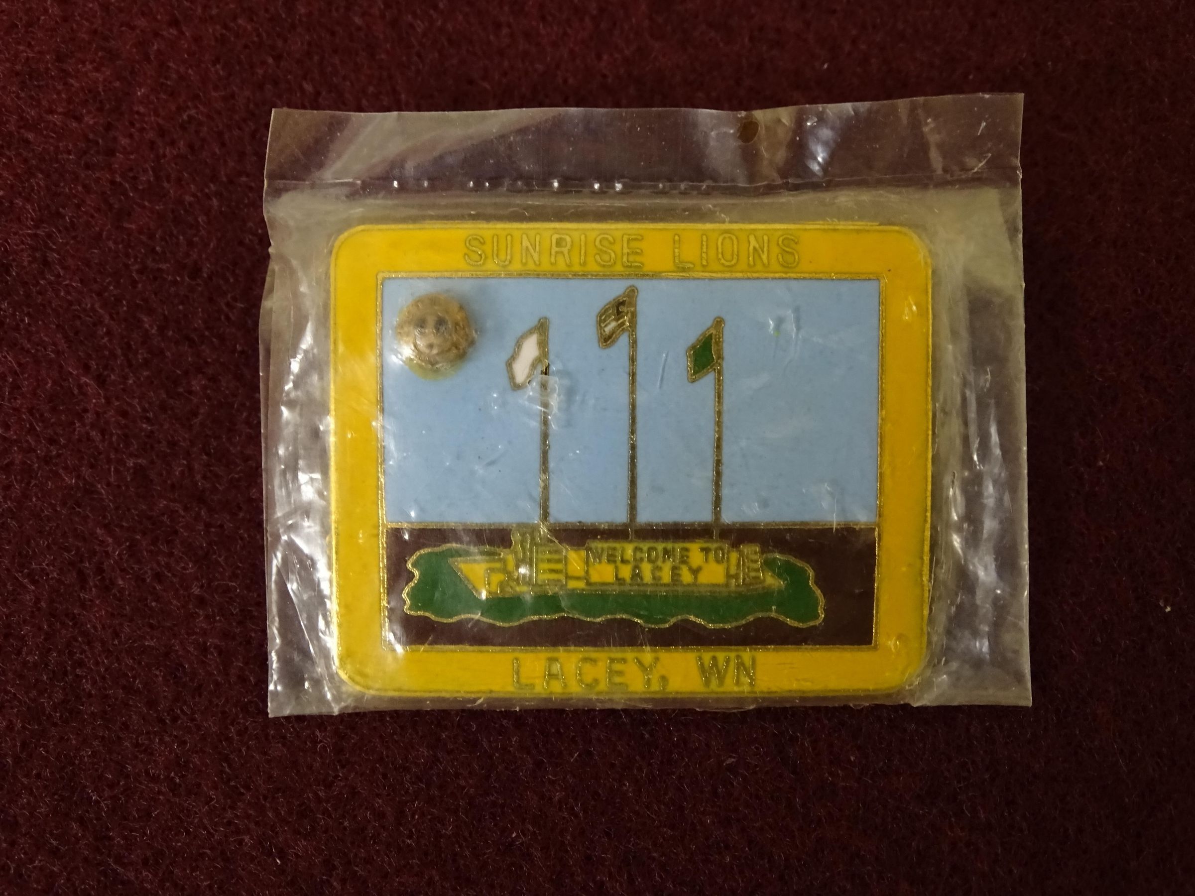 Metal pin with gold, blue, green, and black. On the front is "Sunrise Lions, Lacey, Wn" and an image of the Lacey Civic Plaza with the words "Welcome to Lacey". Also on the front is a miniature Lion's button. On the back are two clips that fit over prongs to permit attaching the pin to clothing. Also on the back is stamped an "R" in a circle and the word "Taiwan". The pin is enclosed in a plastic envelope.Dimensions
