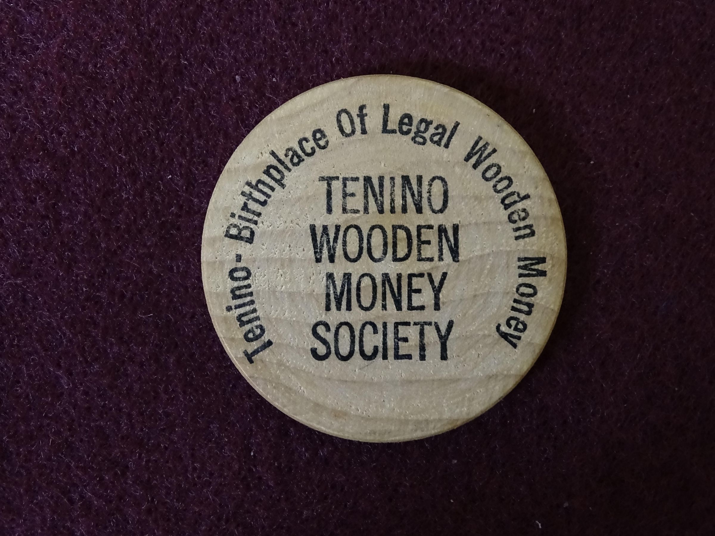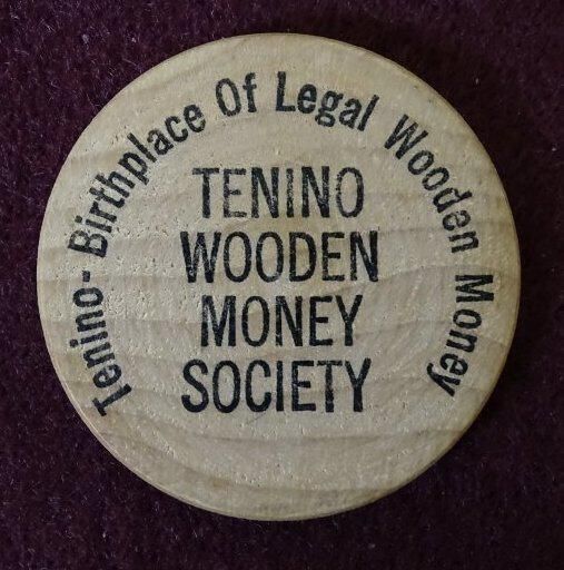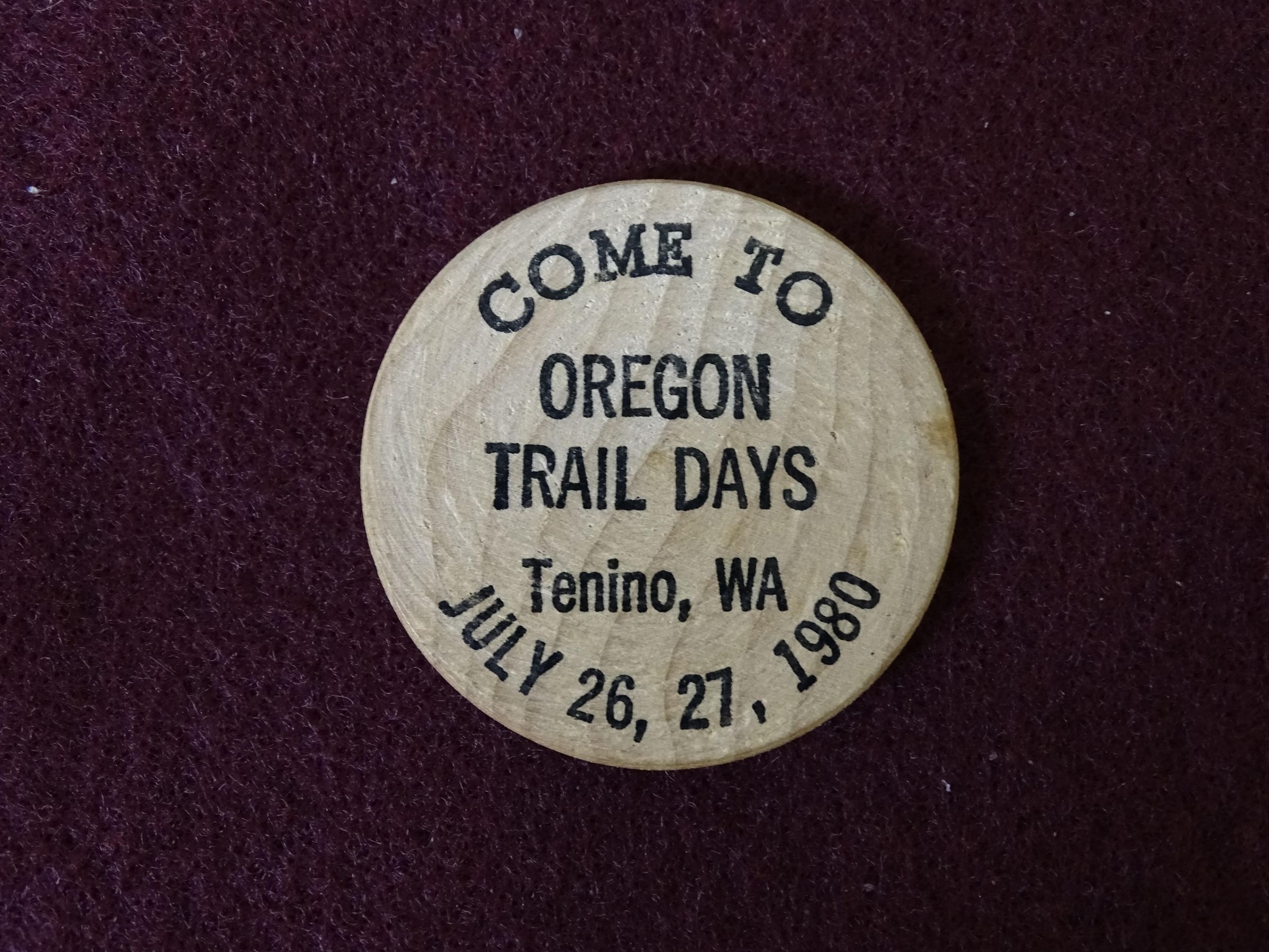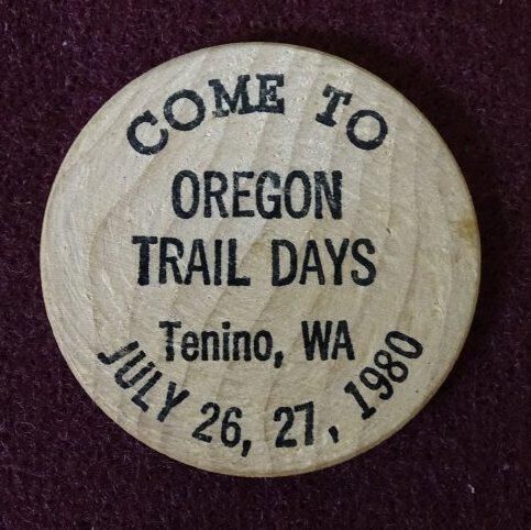 Wooden coin with black ink. On the front is "Come to Oregon Trail Days, Tenino, WA, July 26, 27, 1980". On the back is "Tenino Wooden Money Society" and " Tenino - Birthplace of Legal Wooden Money".Relationships