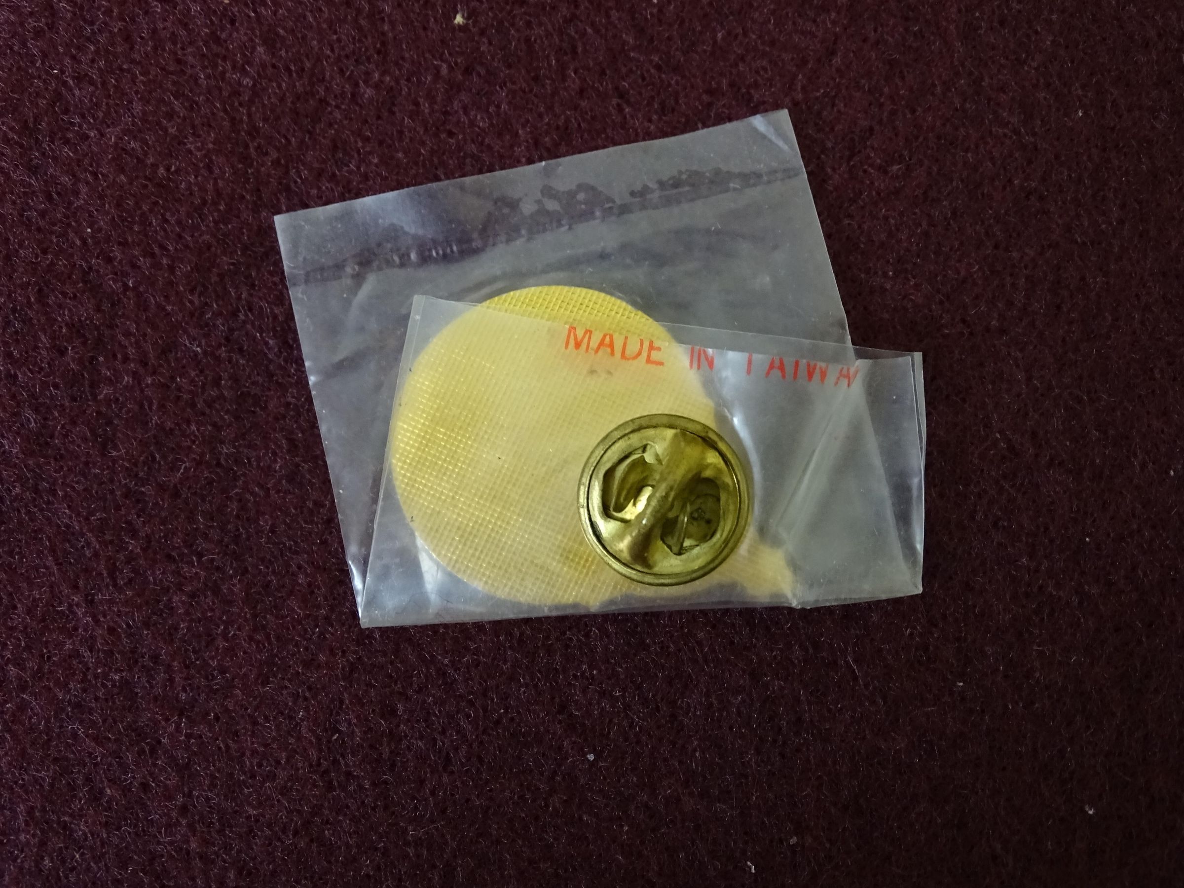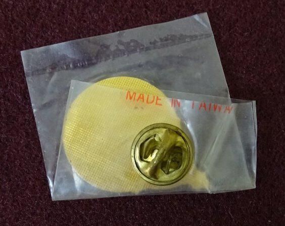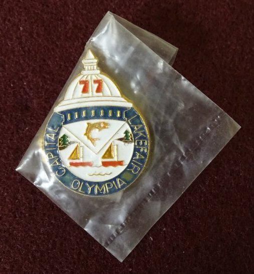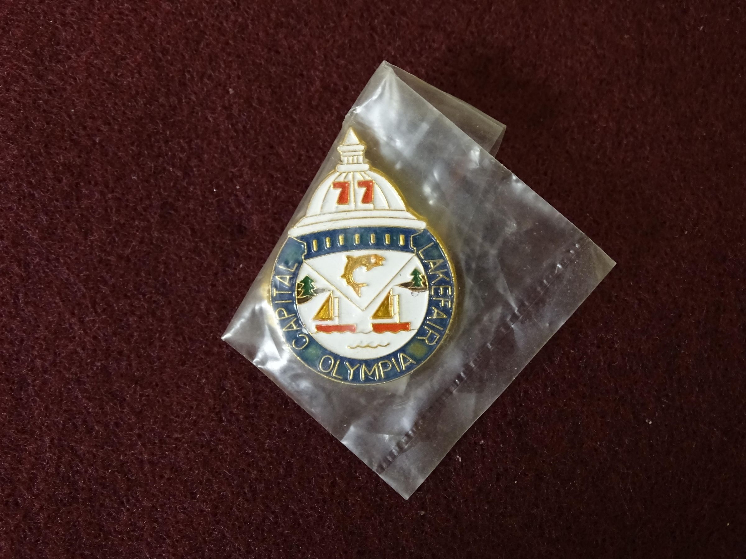 Metal pin with red, gold and green on white. On the front is an image of the capitol dome above a circle with images of fish, boats and trees. On the dome is "77" and around the circle is "Capital Lakefair Olympia". On the back is a clip that fits on a prong to attach to clothing. The pin is enclosed in a plastic envelope that has printed on it "Made in Taiwan".Relationships
