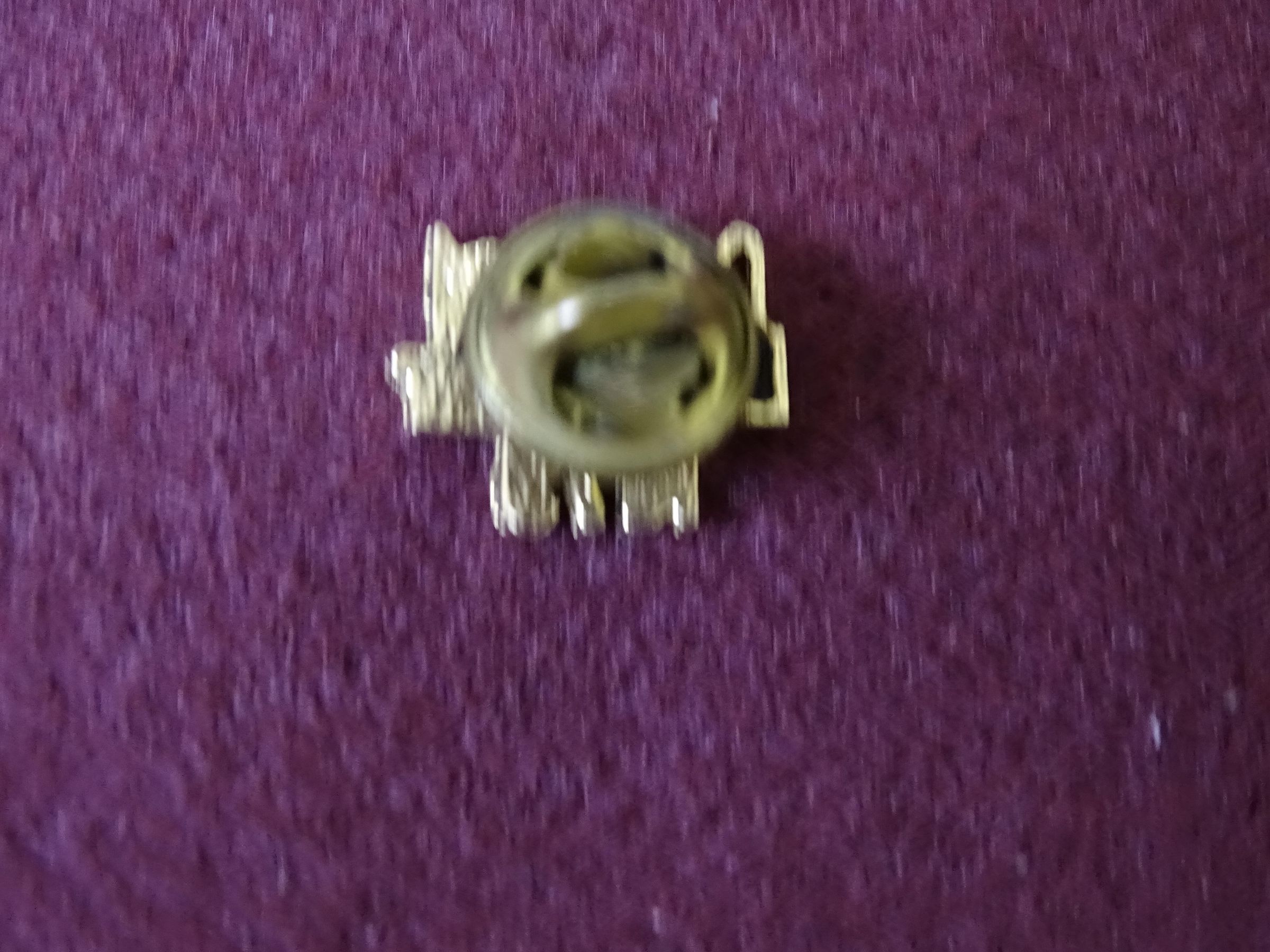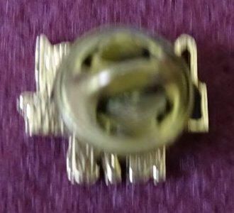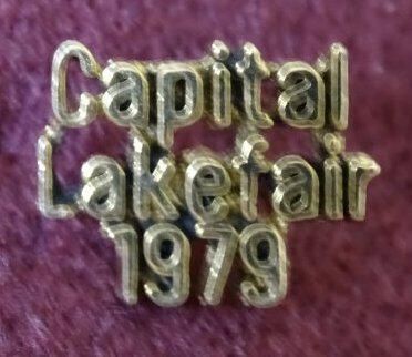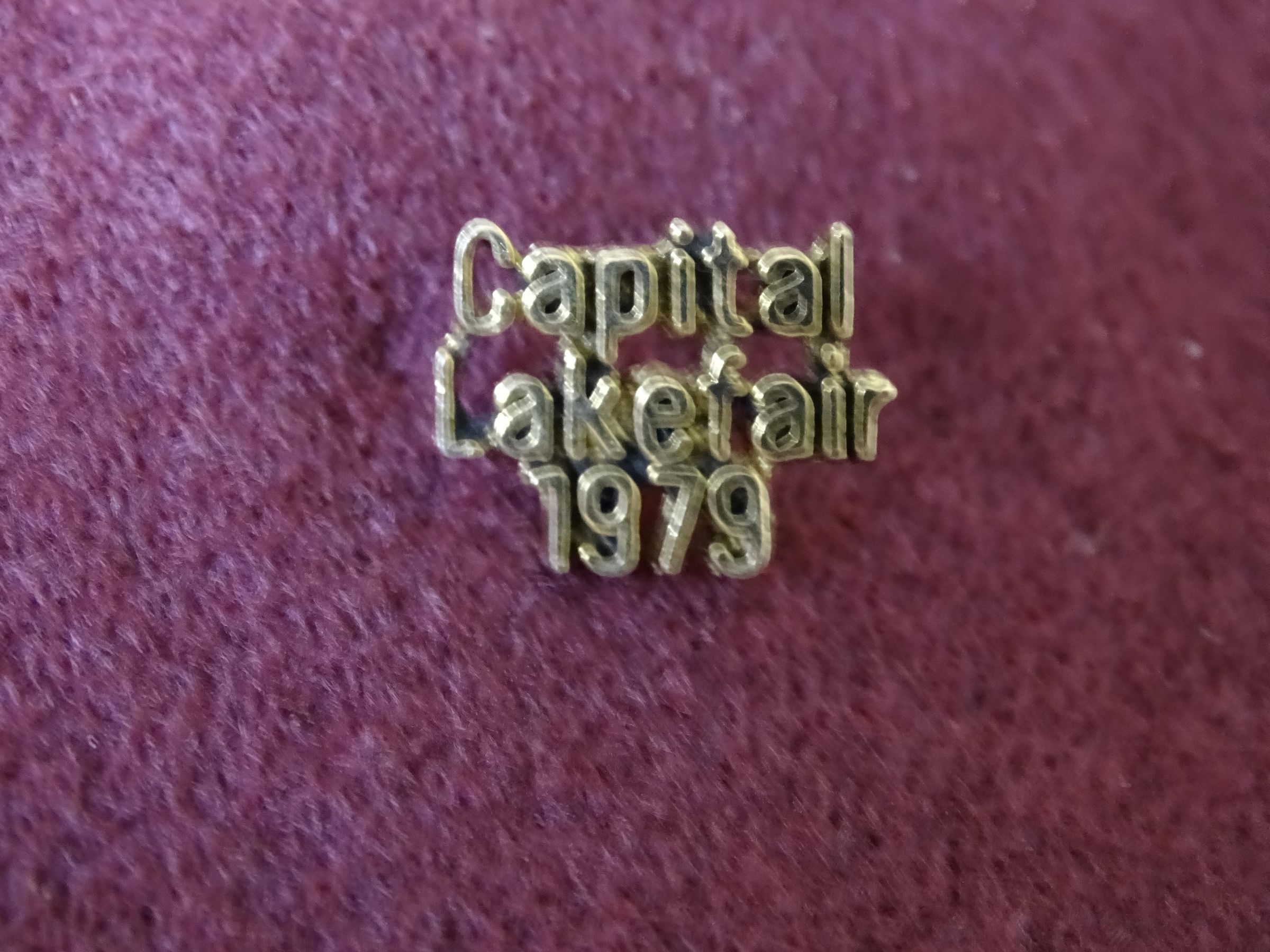 Metal pin, gold in color. The pin is made up of the open letters "Capital lakefair 1979" On the back is a clip that fits on a prong for attaching the pin to clothing.Relationships