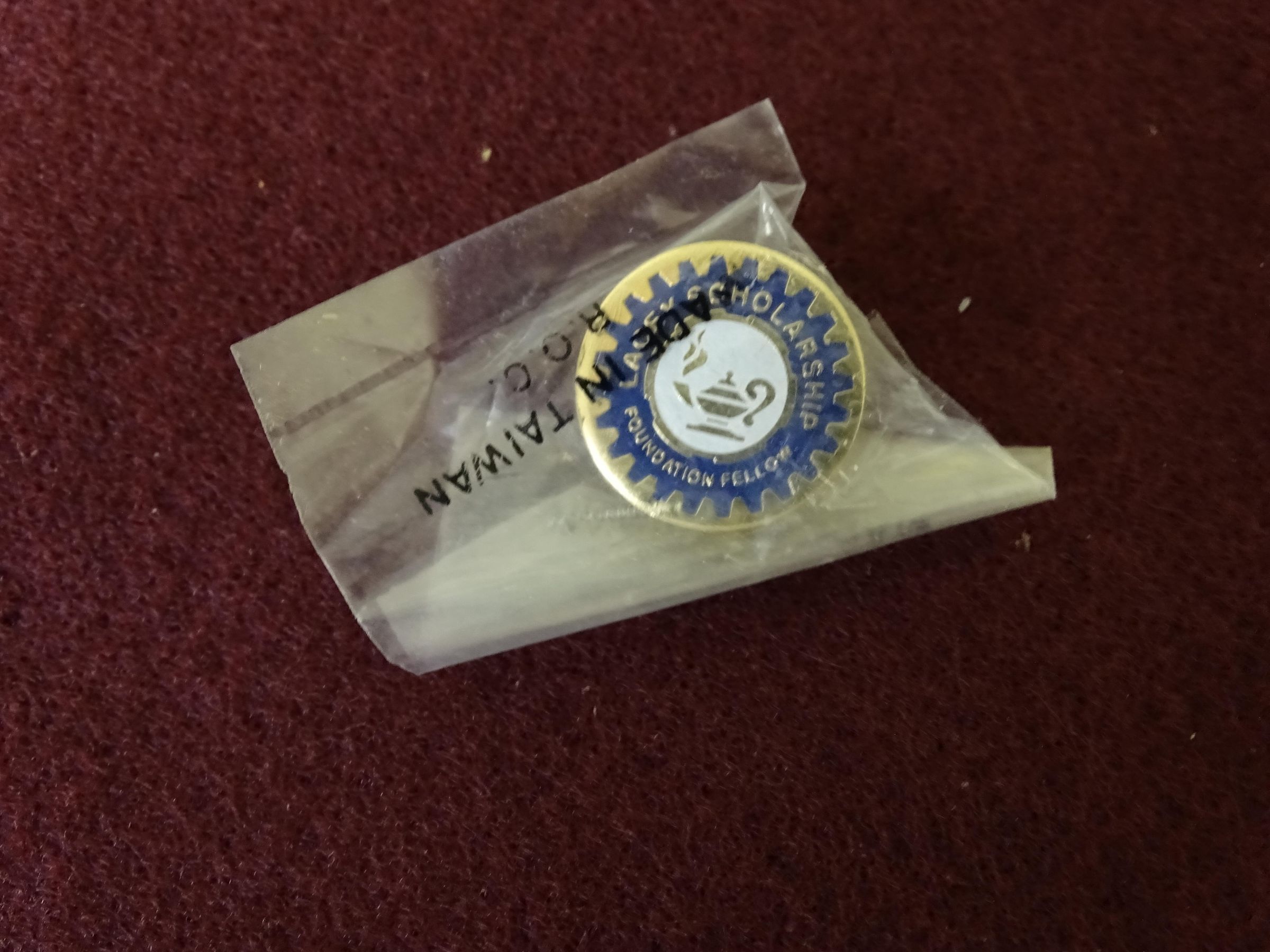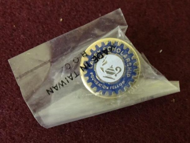 Metal pin with gold, blue, and white. On the front is a blue ring on gold background. On the ring is "Lacey Scholarship Foundation Fellow". In the center in gold on white is an image of a lamp. On the back is a clip that fits on a prong to attach the pin to clothes. The pin is inside a plastic envelope. On the envelope is (twice) "Made in Taiwan, R O C".Relationships