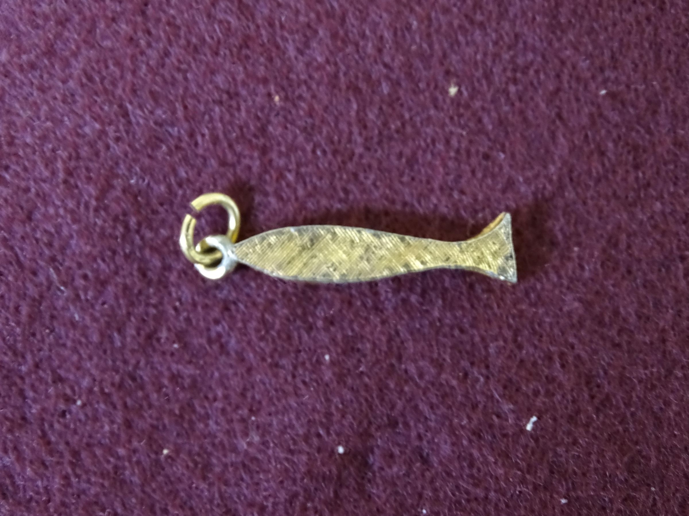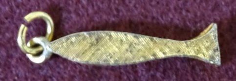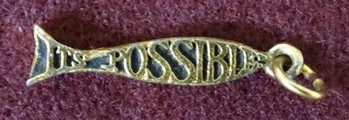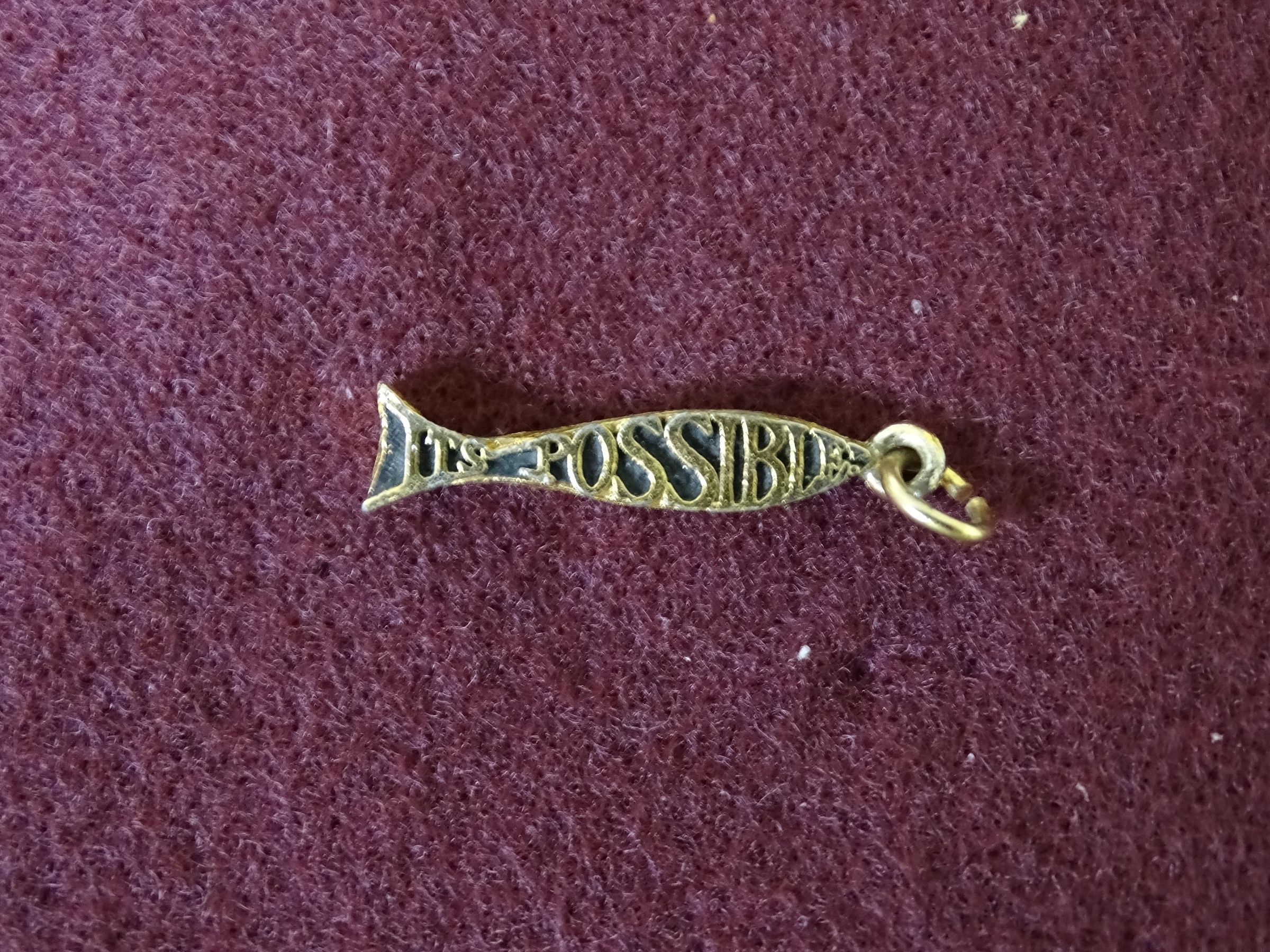 Gold colored metal charm in the shape of a fish. On the front is "It's Possible". There is a small ring at one end.Dimensions