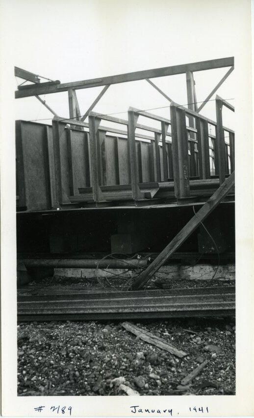 The photo is inserted, along with a negative of the image, into a cream colored envelope that has typed "January 1941 - Olympia Frames of steel barge built by the Reliable Welding Works". Stamped is "2189" and "indexed".Made/Created