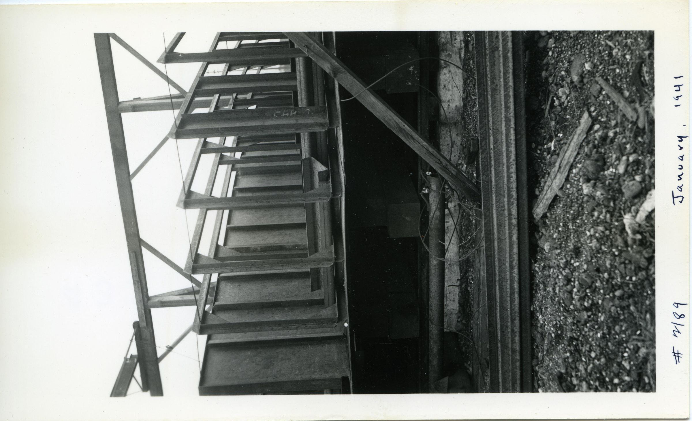 Black and white photo of the frames of a barge built by Reliable Welding. In the foreground is gravel, rails, and odd wooden pieces. The barge is supported on large wooden timbers. On the deck of the barge are steel frames, and other steel beams are in front and above the barge. There is a wire in the background. There is a white border on all sides, and in the bottom border is "#2189 January 1941". On the back is "431".
